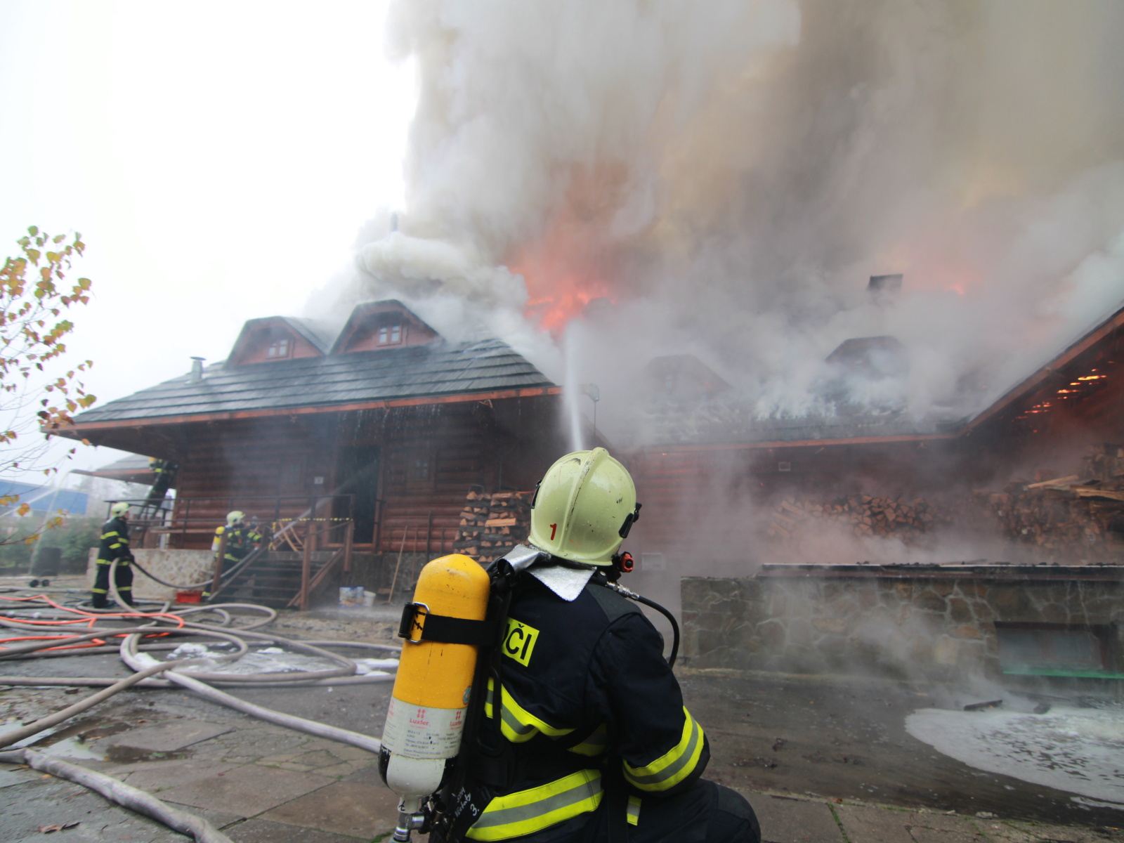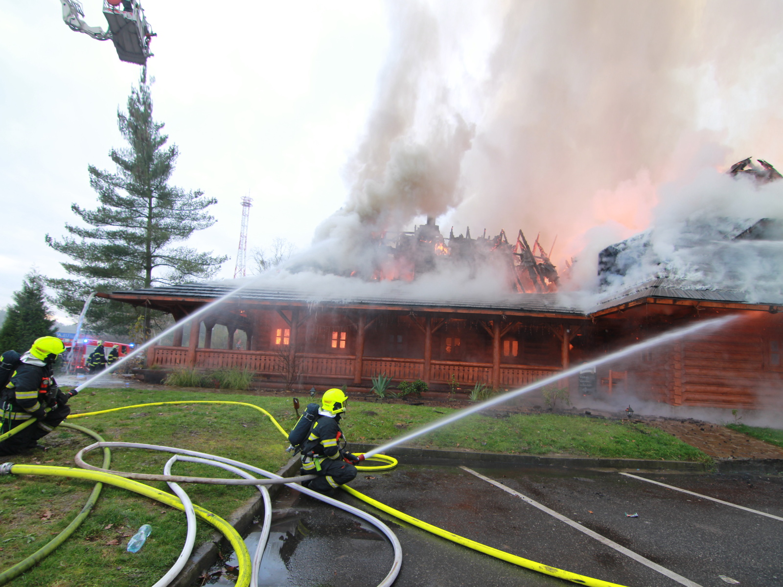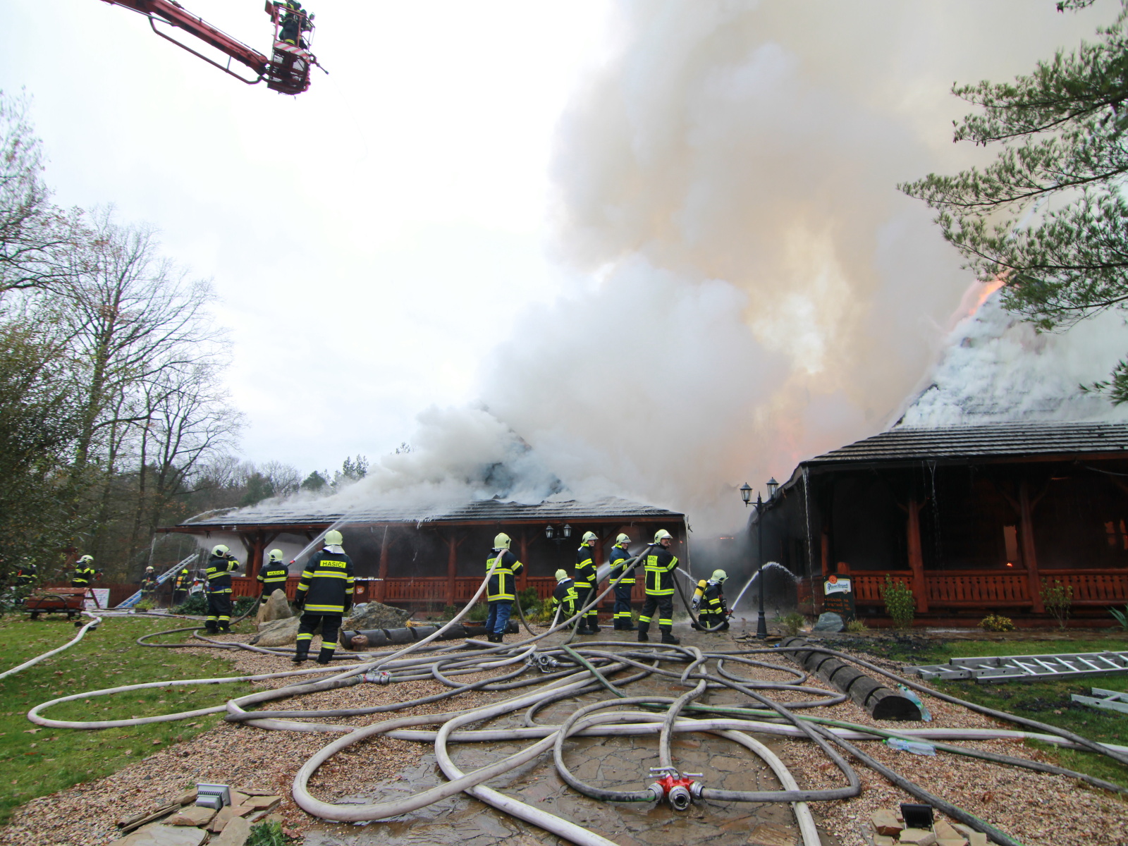 Pět minut před jedenáctou hodinou byla na místě první jednotka, která potvrdila, že požár zasáhl střechu celodřevěné koliby a postupně nabírá na intenzitě. Vzhledem k tomu, že sousední objekt, který byl vzdálen asi třicet metrů, byla benzínová čerpací stanice, byl vyhlášen třetí poplachový stupeň.