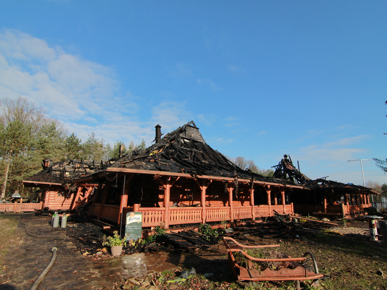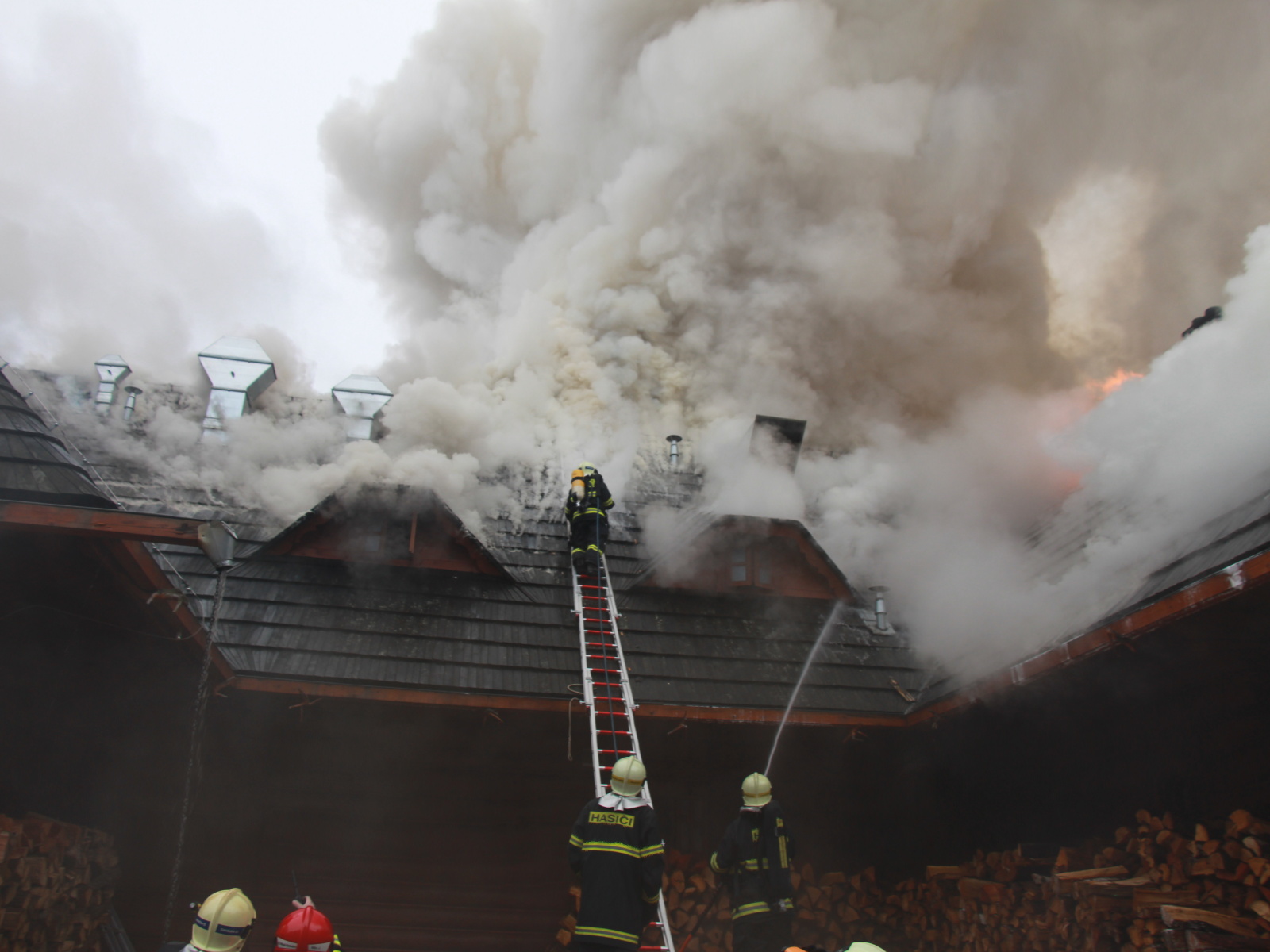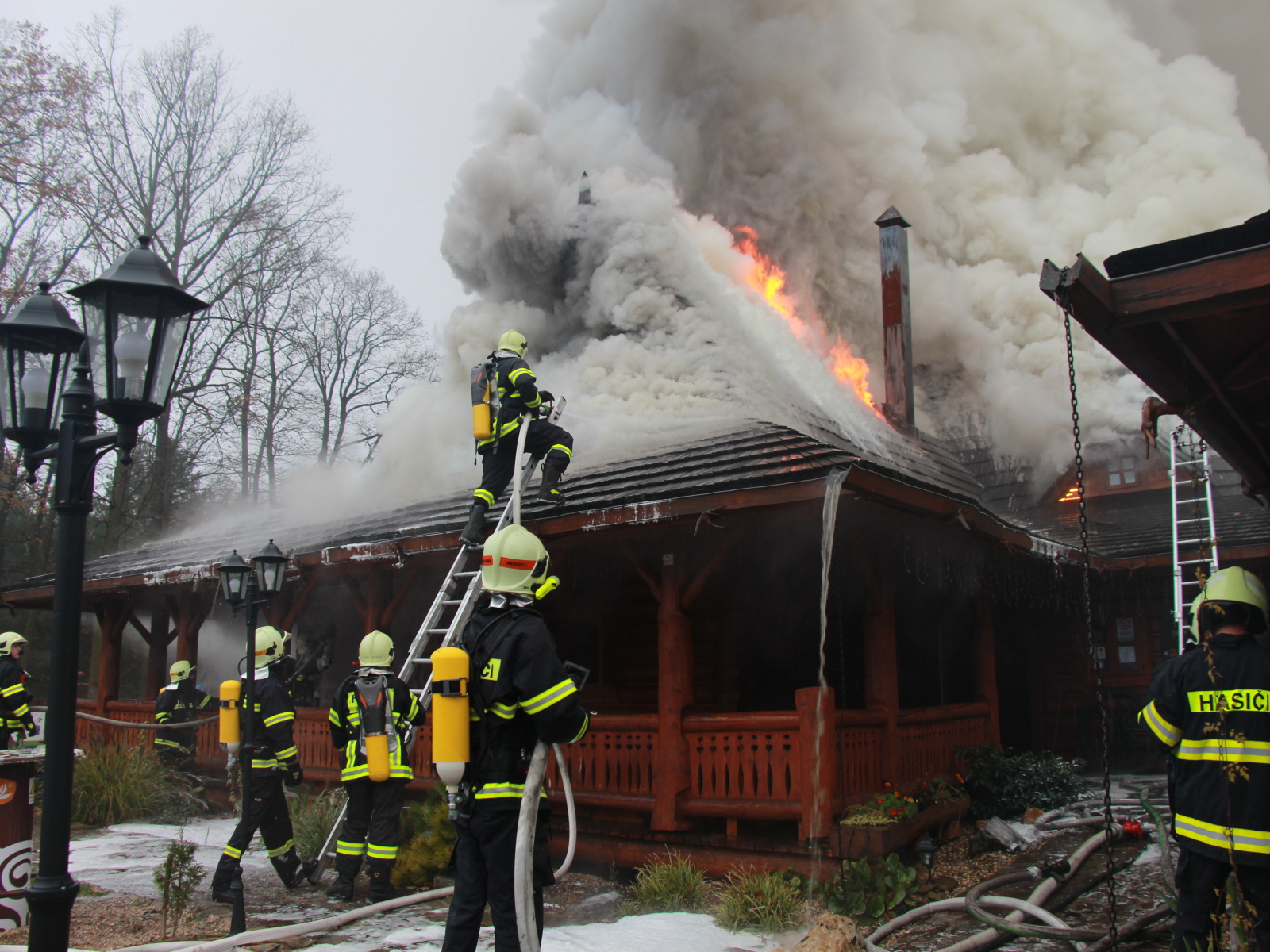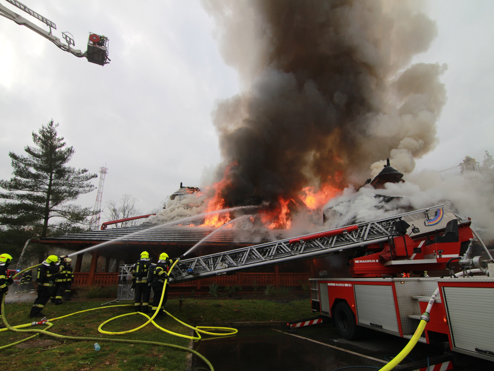 Pět minut před jedenáctou hodinou byla na místě první jednotka, která potvrdila, že požár zasáhl střechu celodřevěné koliby a postupně nabírá na intenzitě. Vzhledem k tomu, že sousední objekt, který byl vzdálen asi třicet metrů, byla benzínová čerpací stanice, byl vyhlášen třetí poplachový stupeň.