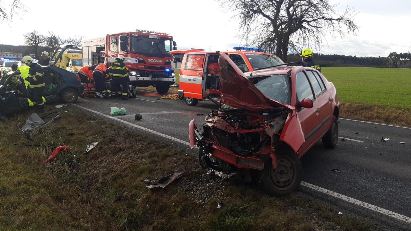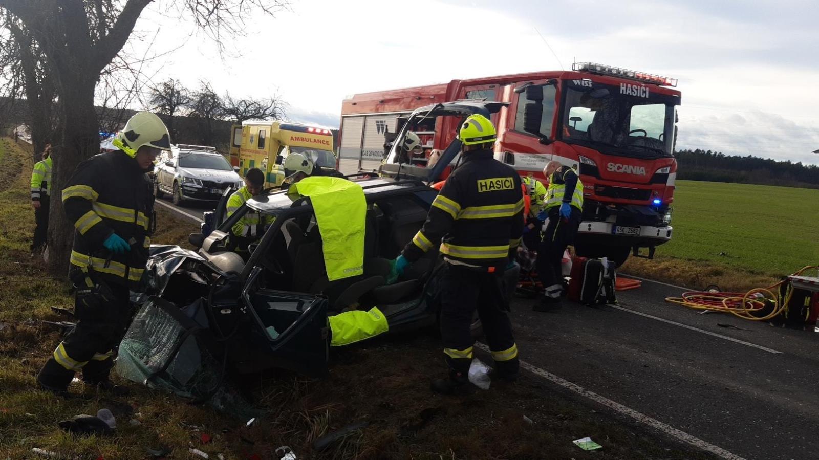 Jedna z nich se stala asi hodinu po poledni na silnici druhé třídy č. 226 mezi Rakovníkem a Lišany poblíž odbočky k Ovčínu, kde se čelně srazila dvě osobní auta. Rakovničtí profesionální hasiči museli jednoho z řidičů, který byl zaklíněn a v bezvědomí, vyprostit pomocí hydraulického nářadí. Po nezbytném ošetření posádkami zdravotnické záchranné služby byl muž následně přeložen do vrtulníku a transportován do jedné z pražských nemocnic. Řidič druhého vozidla byl do nemocnice převezen sanitkou. Jednotka dále zajistila obě vozidla proti vzniku požáru a asistovala policii při vyšetřování. Po příjezdu odtahových služeb hasiči ještě pomohli s naložením vraků a uklidili vozovku. Provoz byl obnoven krátce po 15. hodině.