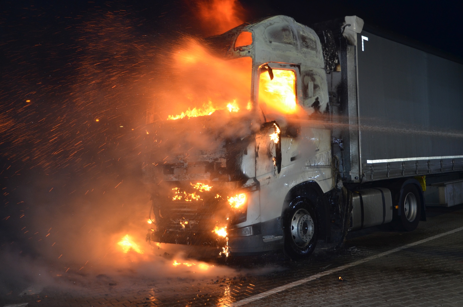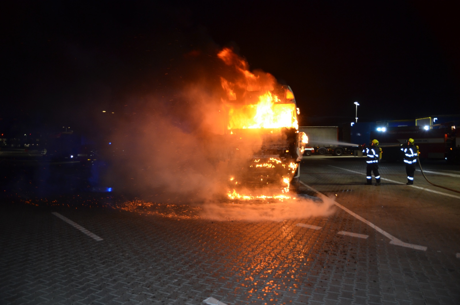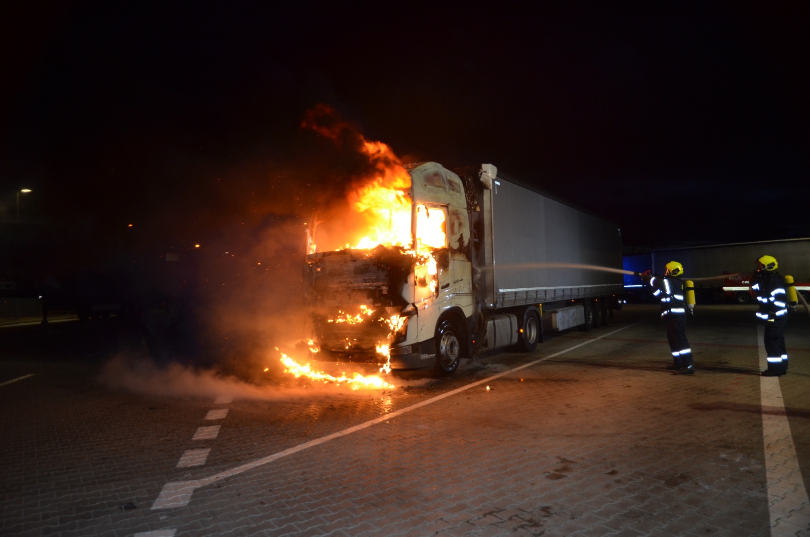Po příjezdu k události bylo velitelem zásahu potvrzeno, že jde o požár kabiny tahače v plném rozsahu, na návěs se plameny nerozšiřovaly. Zásah probíhal dvěma C proudy a vysokotlakem. Řidič nákladní soupravy byl předán zdravotnické záchranné službě, protože se při snaze uhasit požár vlastními silami popálil a nadýchal zplodin hoření. Zhruba po patnácti minutách od zahájení zásahu byl požár lokalizován a za další půlhodinu zlikvidován.