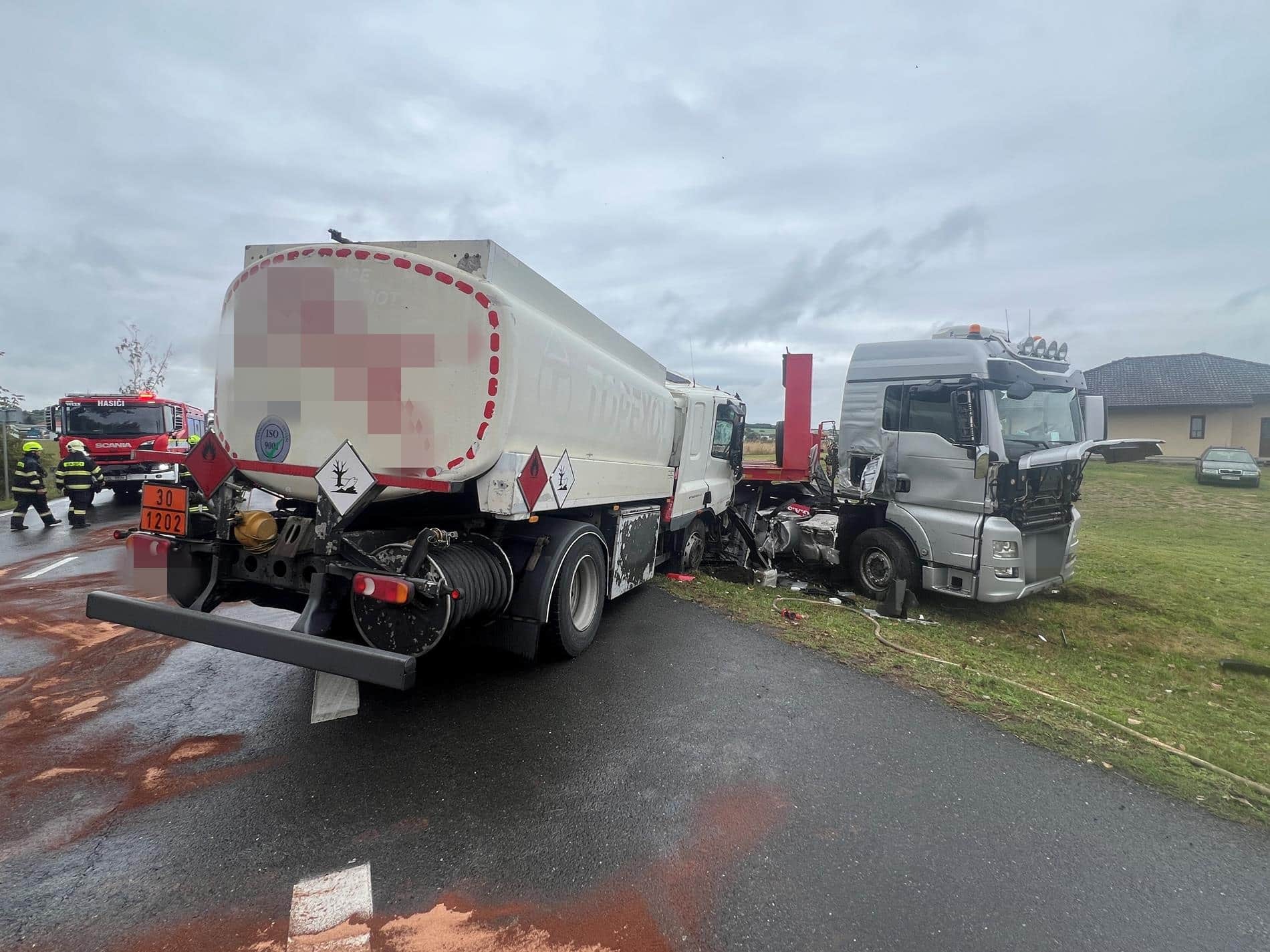 Srážka dvou nákladních vozů zablokovala silnici a ohrozila životní prostředí
