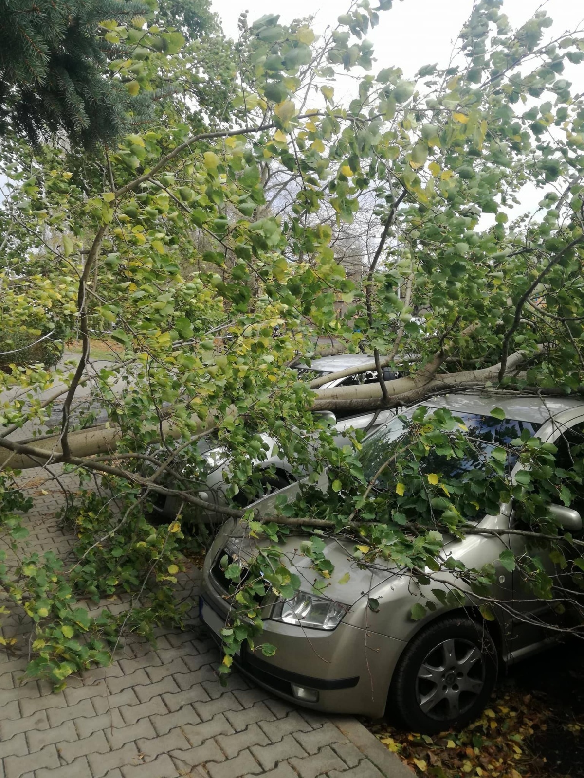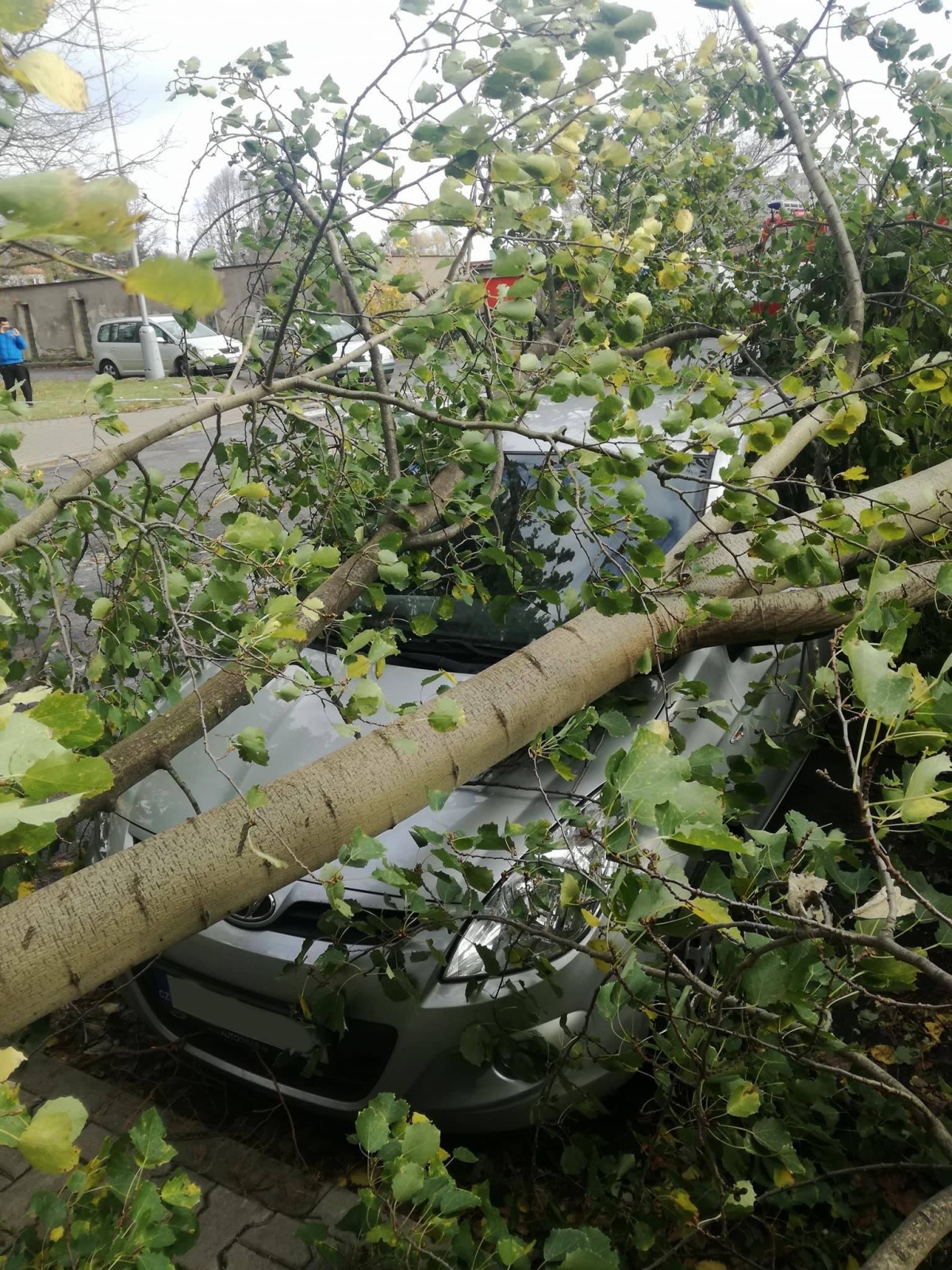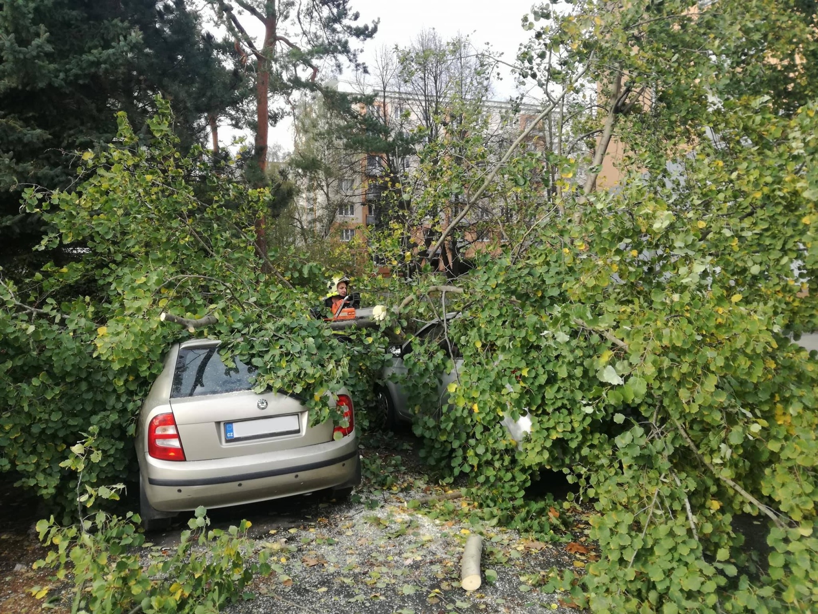 Pád vzrostlého stromu na zaparkované vozidlo na zahradě v Jílovém u Prahy.