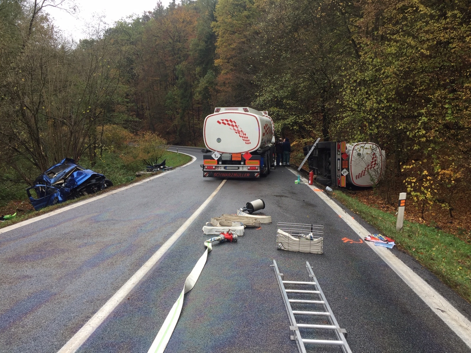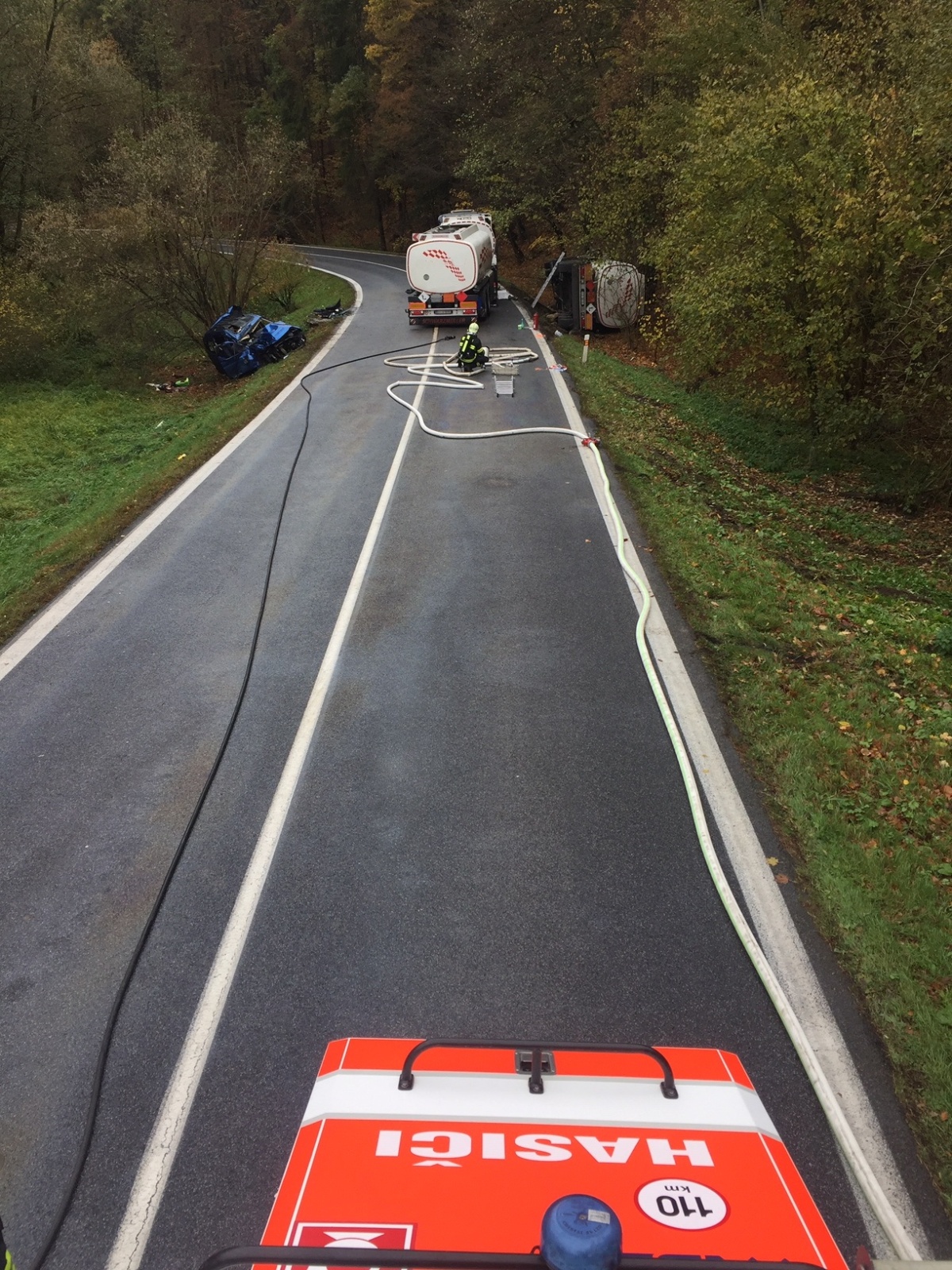 Po příjezdu první jednotky na místo bylo zjištěno, že v jedné ze zatáček se čelně střetlo osobní auto s cisternou a obě vozidla skončila mimo vozovku na opačných stranách silnice. Cisterna se převrátila na bok, osobní vozidlo bylo na kolech, ale v kabině zůstal zaklíněný těžce zraněný řidič.
