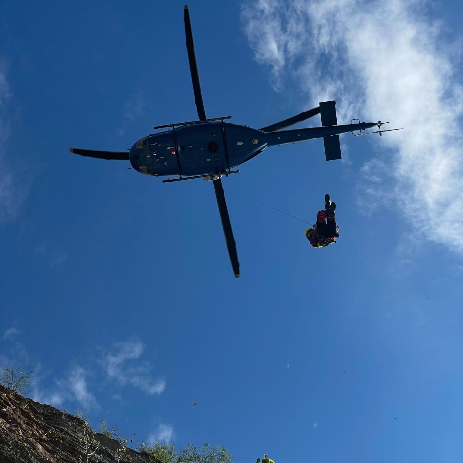 Po konstatování smrti začala další fáze zásahu – technicky náročné a fyzicky vyčerpávající vyproštění těla z římsy. Kvůli nebezpečnému přístupu nebylo možné provést operaci ze země. Lezecké skupiny hasičů připravily transportní nosítka, do kterých bylo tělo uloženo, a záchranáři jej následně pomocí palubního jeřábu vrtulníku vyzvedli do bezpečí.