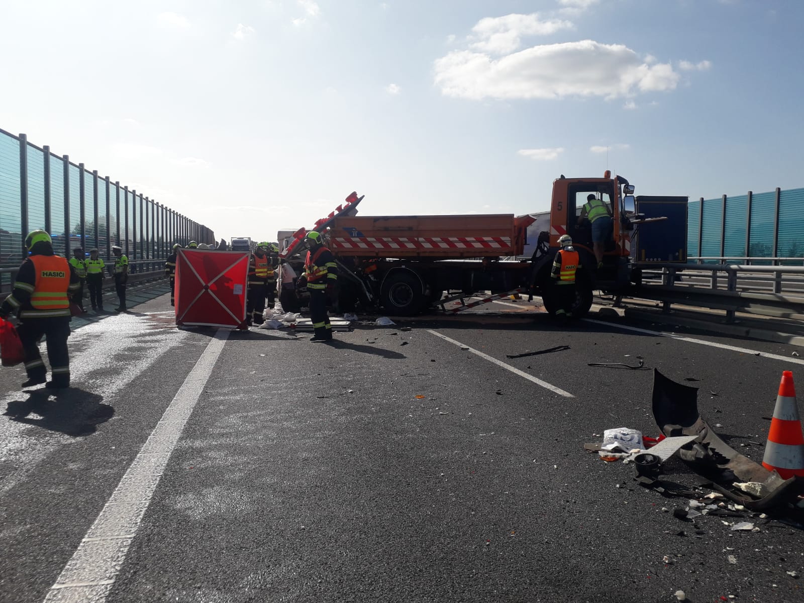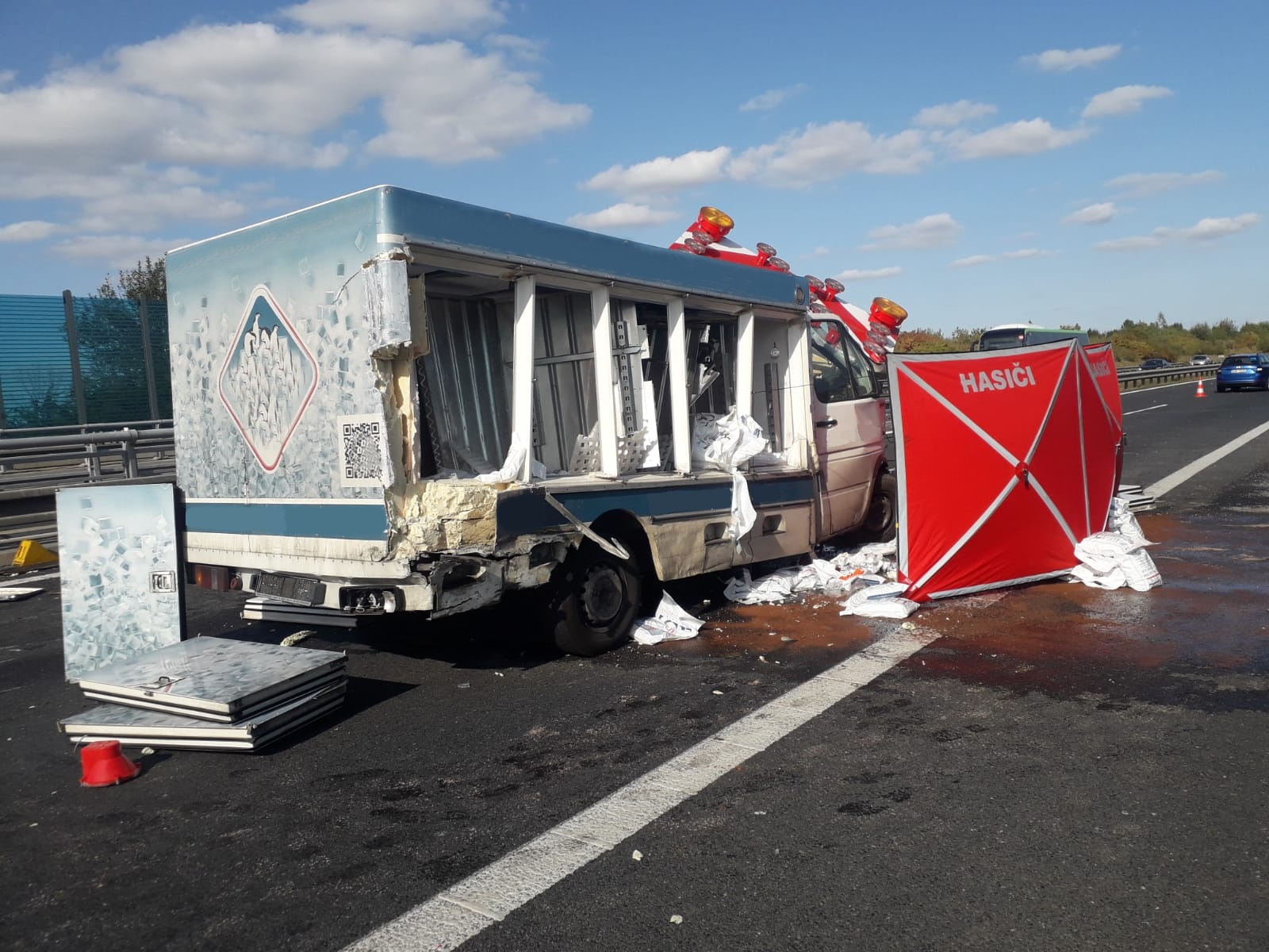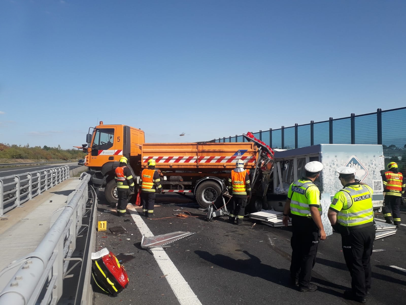 K nárazu dodávky do mobilního dopravního značení došlo ve čtvrtek 17. září před 15. hodinou na dálnici D0 (Pražský okruh) mezi sjezdy Jesenice a Modletice ve směru k brněnské dálnici. Podle oznamovatele zůstal řidič dodávky zaklíněný uvnitř vozu.