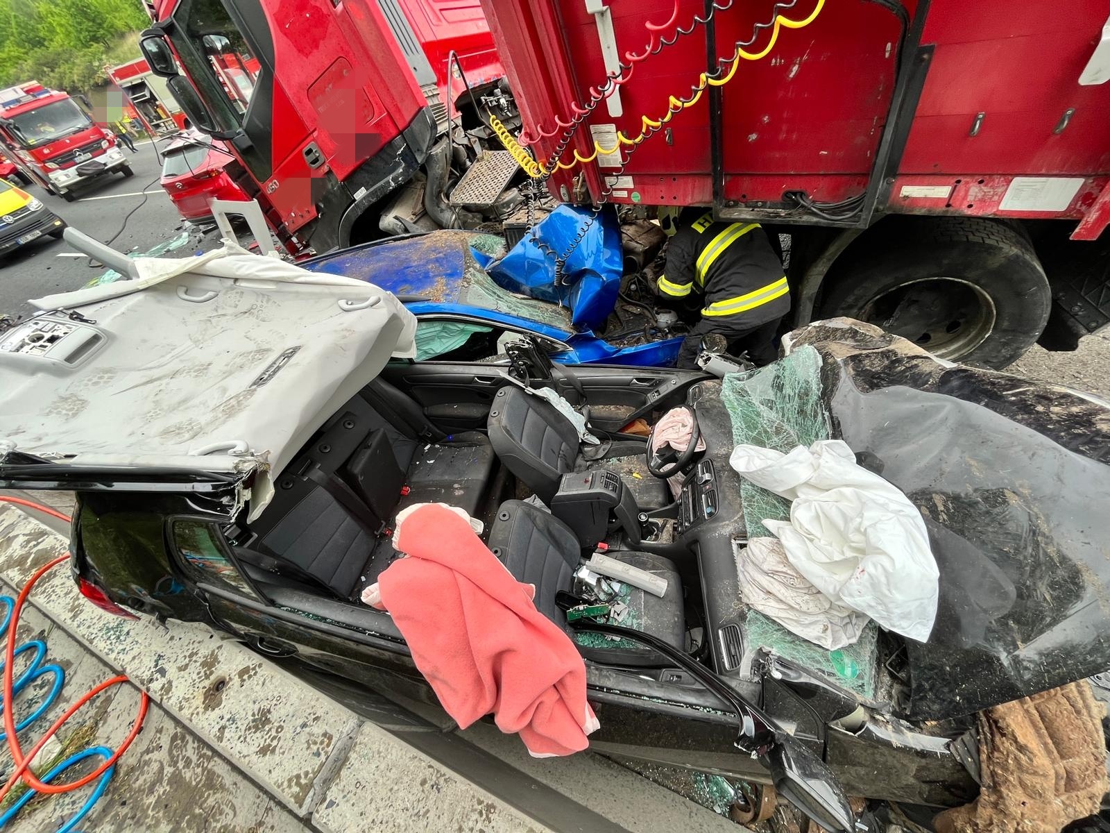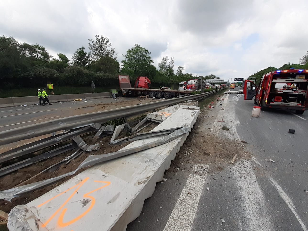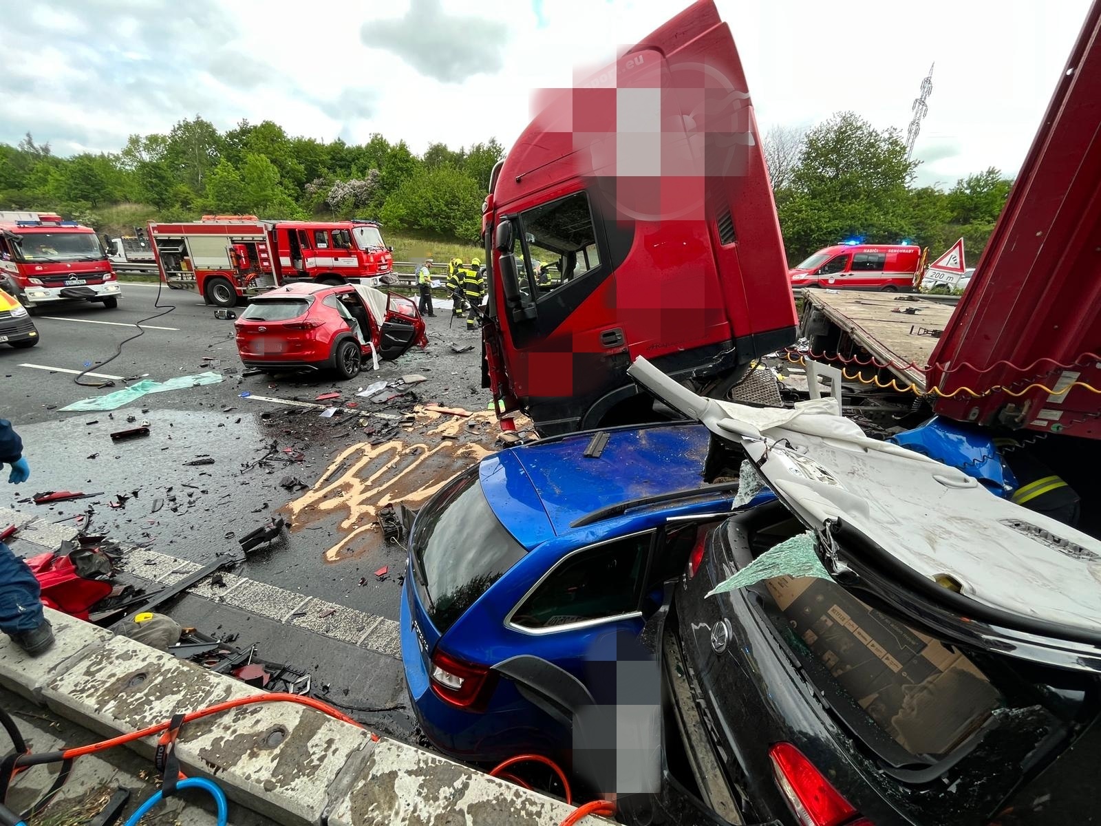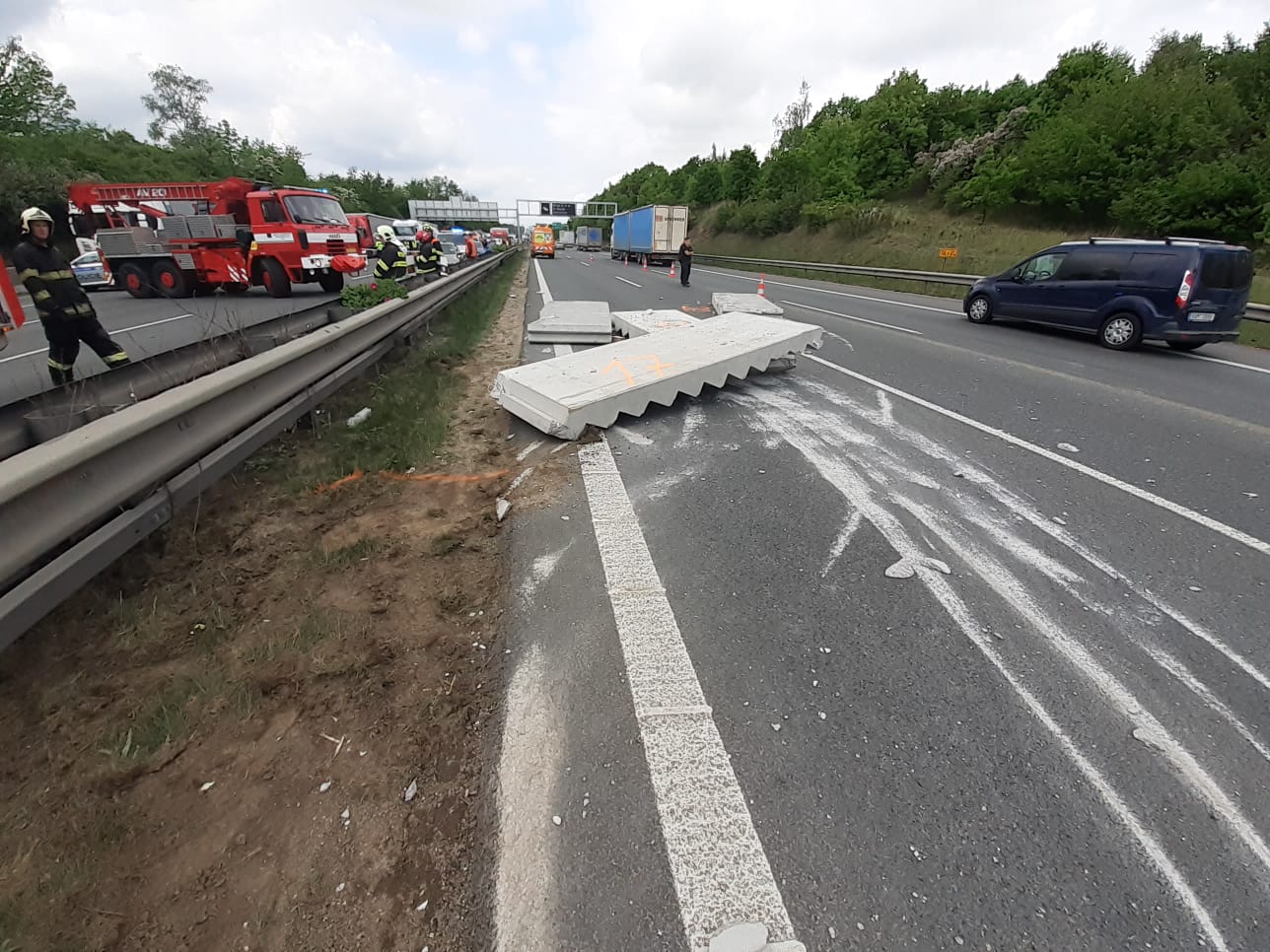 Všechny jednotky se cestou k zásahu musely proplést utvořenými kolonami, přičemž na některých místech se řidičům nepodařilo zachovat záchranářskou uličku. Po příjezdu k nehodě hasiči upřesnili, že jde o dopravní nehodu kamionu, který prorazil středová svodidla a v protisměru se čelně střetl se třemi osobními automobily, v nichž zůstaly zaklíněny zraněné osoby. Celkově, i s řidičem kamionu, byly na místě tři zraněné osoby. Celý zásah byl hned od počátku komplikován masivním únikem pohonných látek z kamionu.