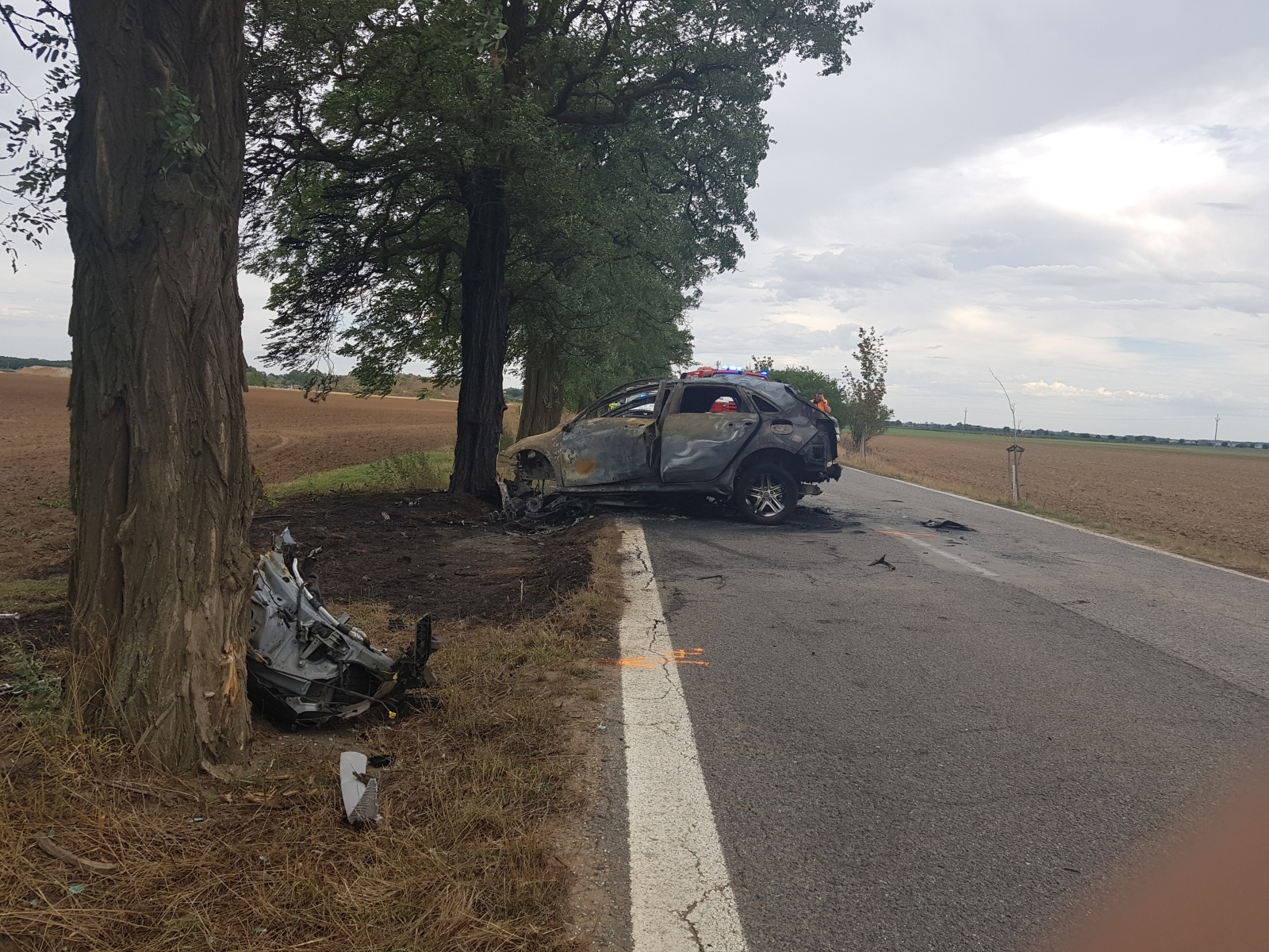 Jako první dorazili na místo chlumínští dobrovolní hasiči, kteří ihned začali vozidlo zcela zachvácené požárem hasit vysokotlakým a jedním C proudem. Uvnitř zůstala po nárazu do silného stromu zaklíněná osoba, které už nedokázali hasiči ani zdravotníci pomoci. Přivolaný vrtulník záchranné služby proto odlétal od nehody prázdný.