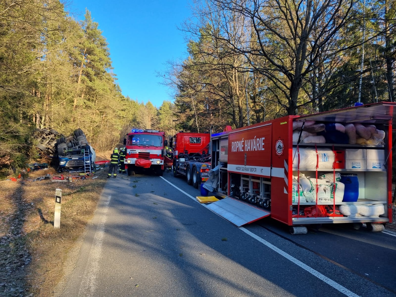 Oznamovatel dále upřesnil, že jde o cisternu, která je označena dle Mezinárodní dohody o silniční přepravě nebezpečných věcí (ADR). Podle údajů měla vézt hydroxid sodný. Z toho důvodu operační důstojník na místo vyslal ještě posilovou jednotku z centrální hasičské stanice Kladno s protiplynovým automobilem, dekontaminačním přívěsem a druhým vyprošťovacím automobilem.