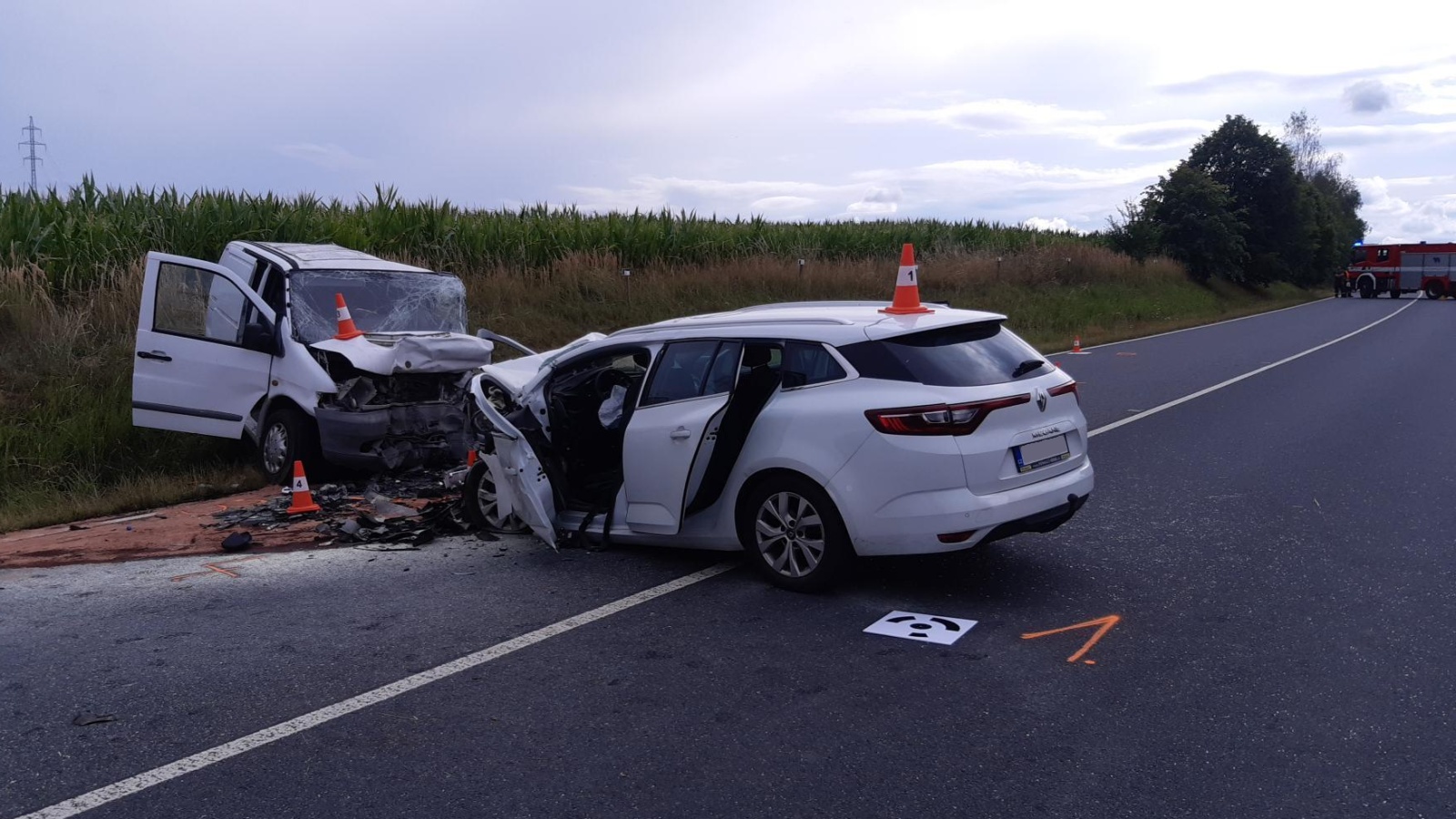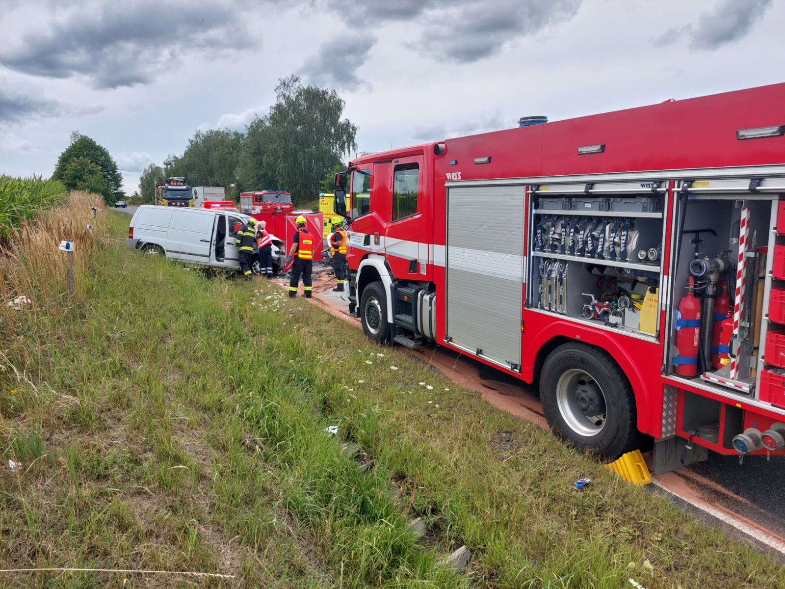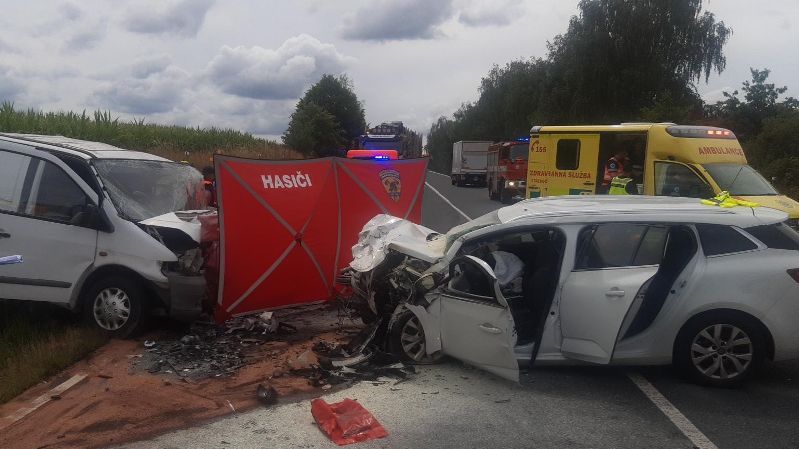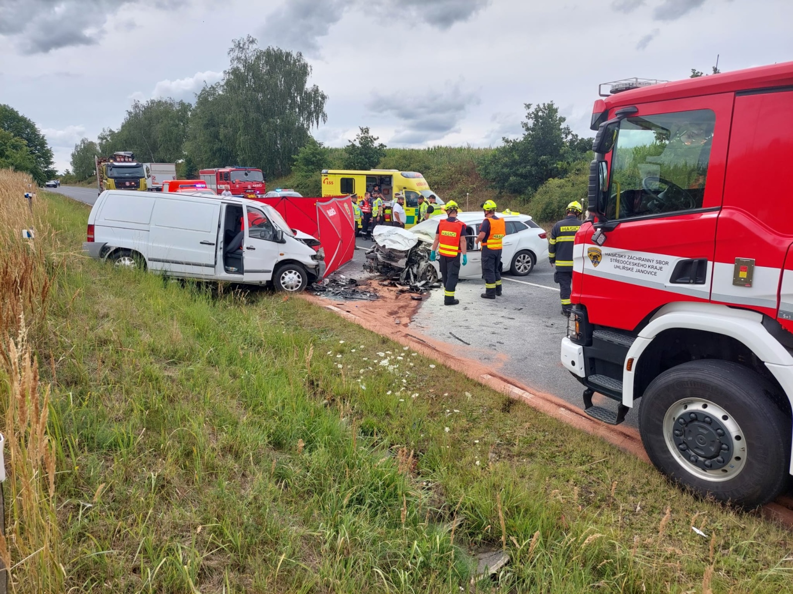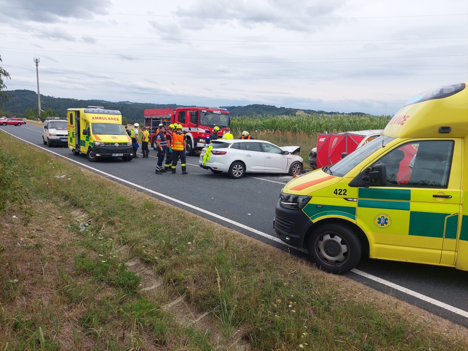 Po příjezdu první jednotky na místo bylo upřesněno, že jde o čelní střet malého dodávkového vozidla a osobního automobilu. Řidič dodávky zůstal zaklíněný v kabině a nejevil známky života. Lékař zdravotnické záchranné služby následně potvrdil jeho exitus. V osobním autě cestovala žena se dvěma dětmi školního věku. Vážně zraněnou řidičku transportoval do nemocnice vrtulník, další vrtulník odletěl do nemocnice s jedním ze zraněných dětí. Druhé dítě utrpělo zranění lehčího charakteru a byla mu přítomným členem týmu posttraumatické péče poskytnuta psychologická pomoc, zároveň mu hasiči předali plyšovou hračku.