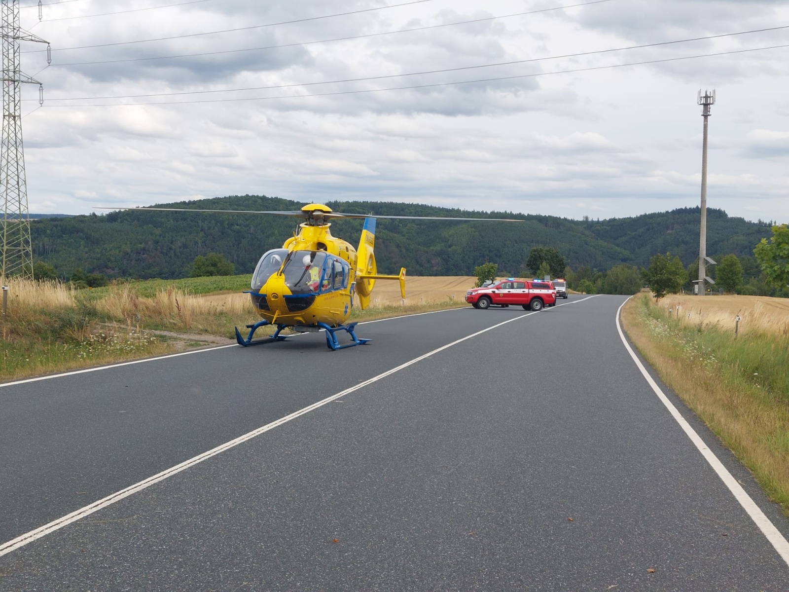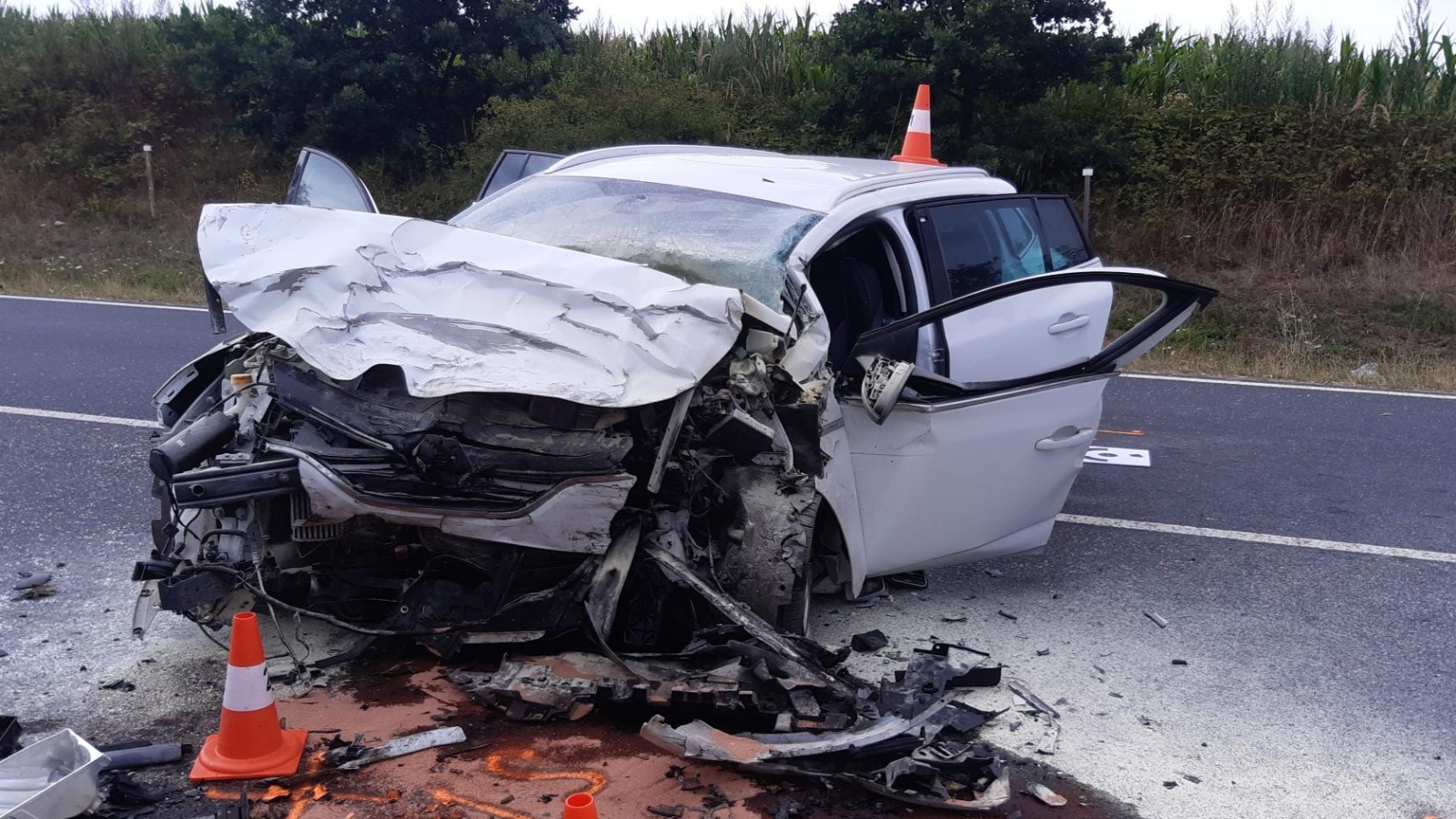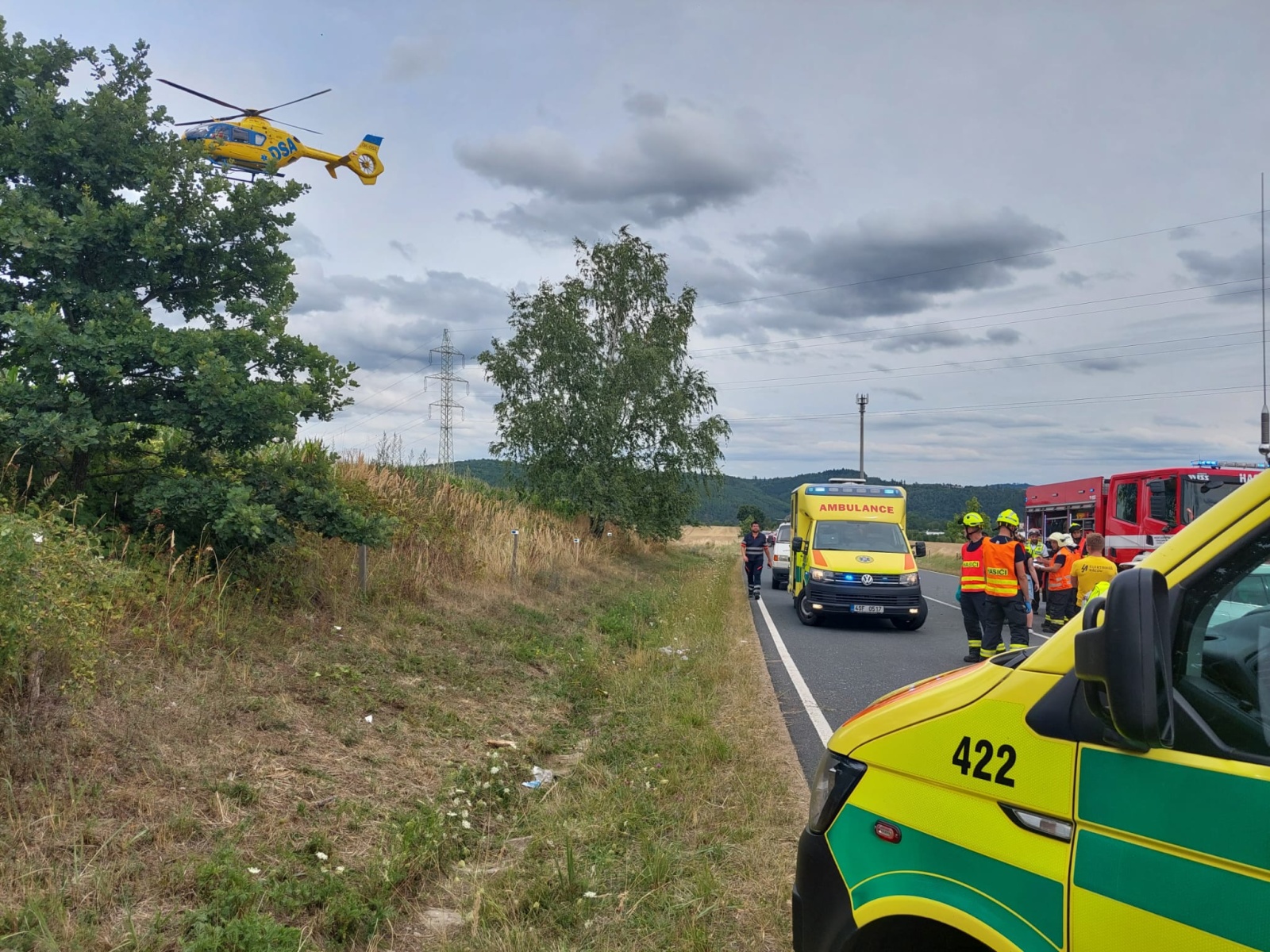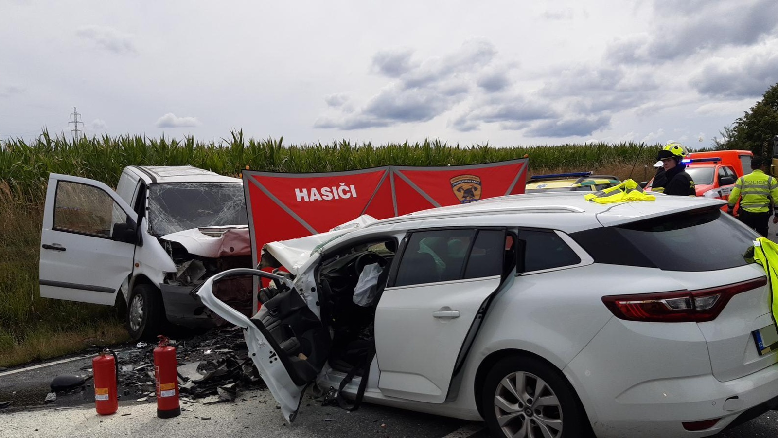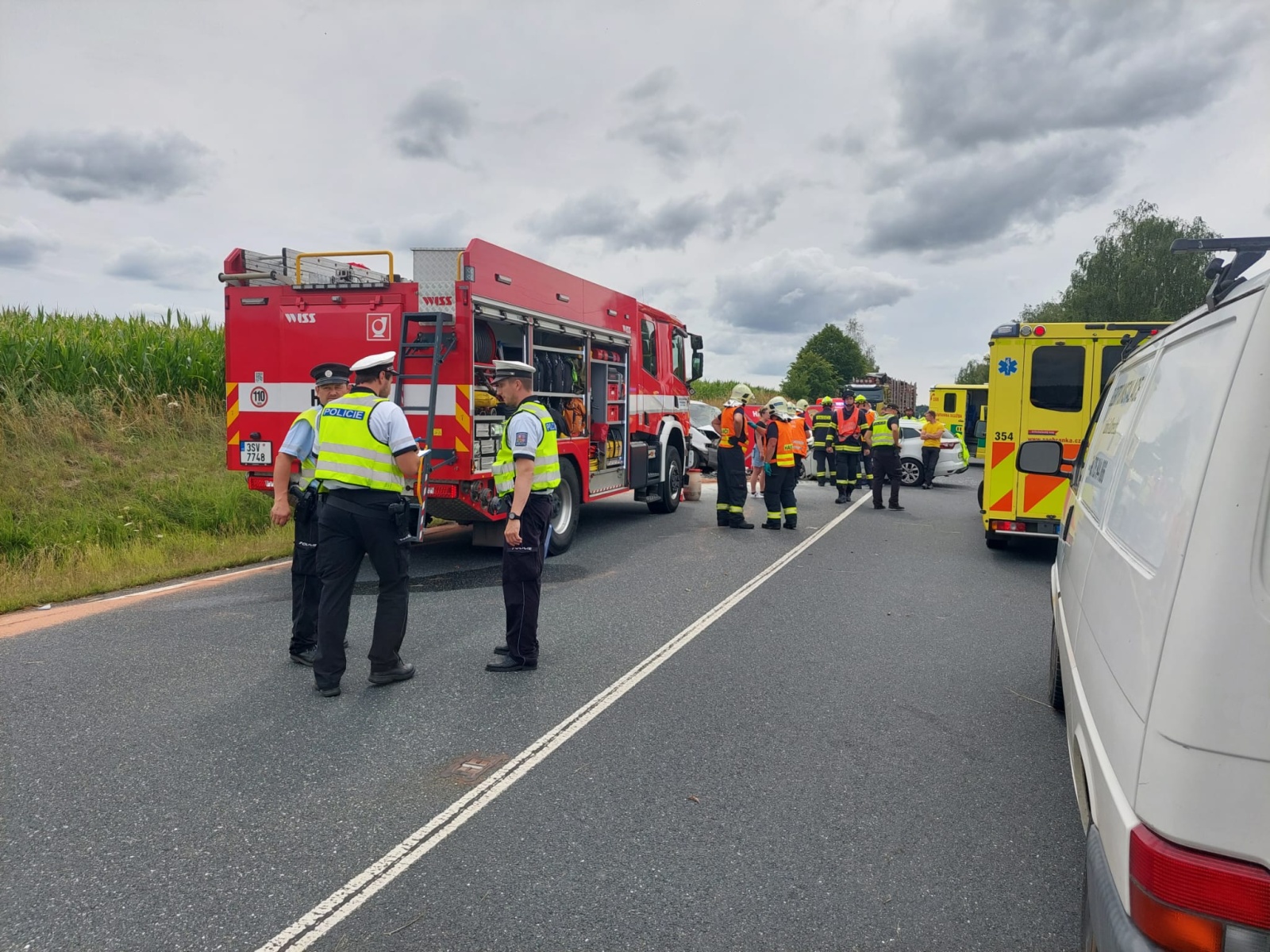Po příjezdu první jednotky na místo bylo upřesněno, že jde o čelní střet malého dodávkového vozidla a osobního automobilu. Řidič dodávky zůstal zaklíněný v kabině a nejevil známky života. Lékař zdravotnické záchranné služby následně potvrdil jeho exitus. V osobním autě cestovala žena se dvěma dětmi školního věku. Vážně zraněnou řidičku transportoval do nemocnice vrtulník, další vrtulník odletěl do nemocnice s jedním ze zraněných dětí. Druhé dítě utrpělo zranění lehčího charakteru a byla mu přítomným členem týmu posttraumatické péče poskytnuta psychologická pomoc, zároveň mu hasiči předali plyšovou hračku.