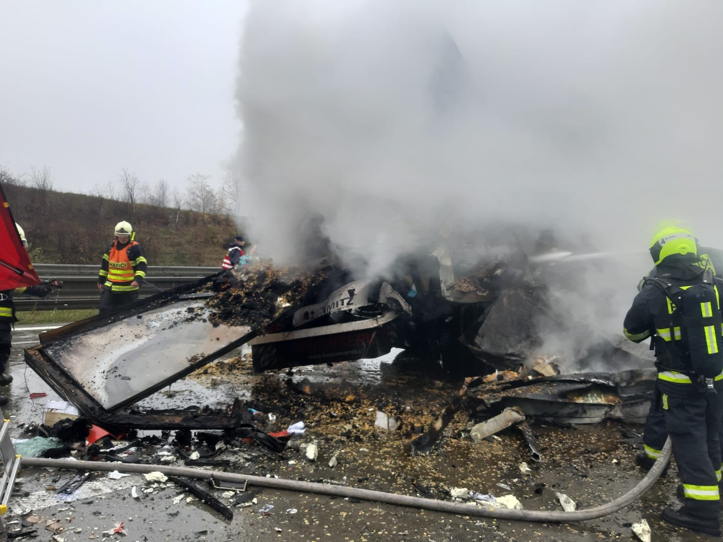 Po příjezdu k události bylo potvrzeno, že jde o nehodu tří nákladních automobilů, z nichž prostřední byl zasažen požárem. V dalším vozidle zůstala zaklíněna jedna osoba, která svým zraněním na místě podlehla, takže lékař přivolané zdravotnické záchranné služby mohl pouze konstatovat exitus. Další osoba byla zraněna a skončila v péči ZZS. Jako první u nehody zasahovali vojáci Armády ČR, kteří kolem právě projížděli.