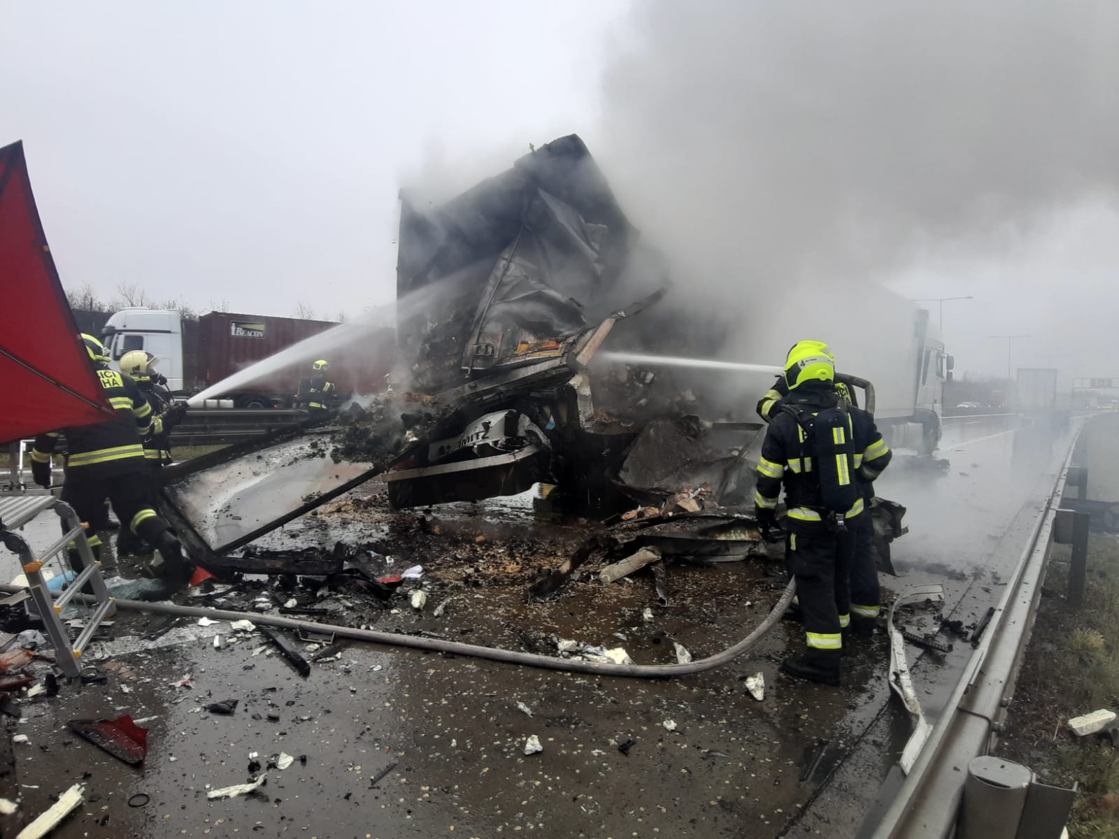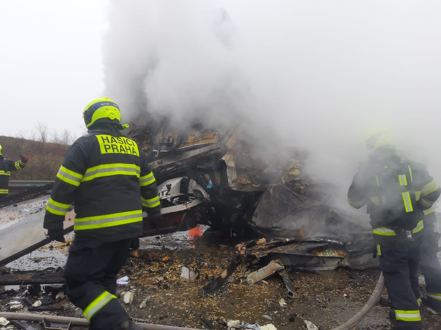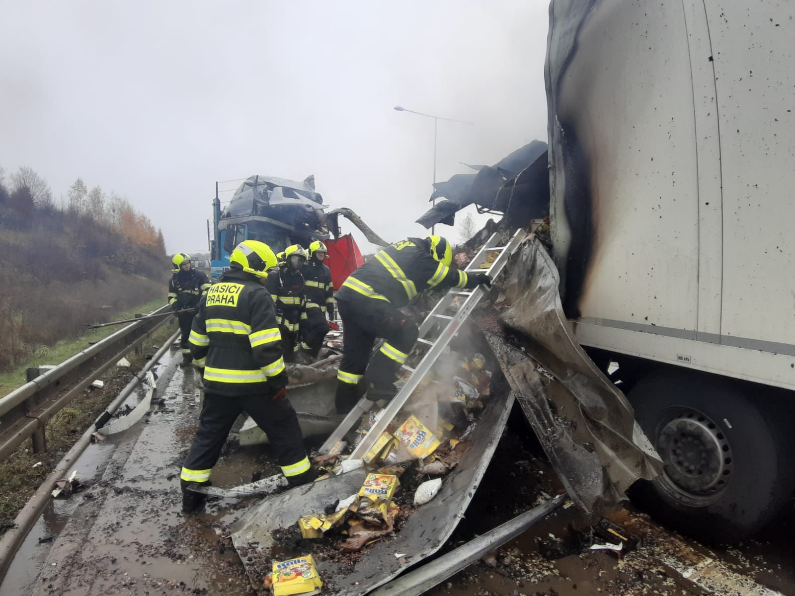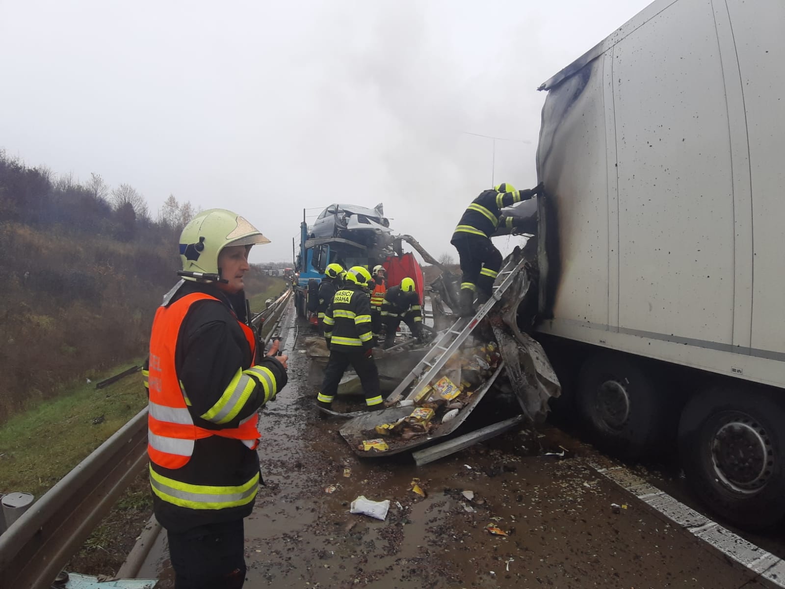 V pondělí 18. listopadu krátce po desáté hodině přijalo operační středisko středočeských hasičů oznámení o dopravní nehodě tří nákladních automobilů na Pražském okruhu nedaleko Jesenice ve směru k letišti.