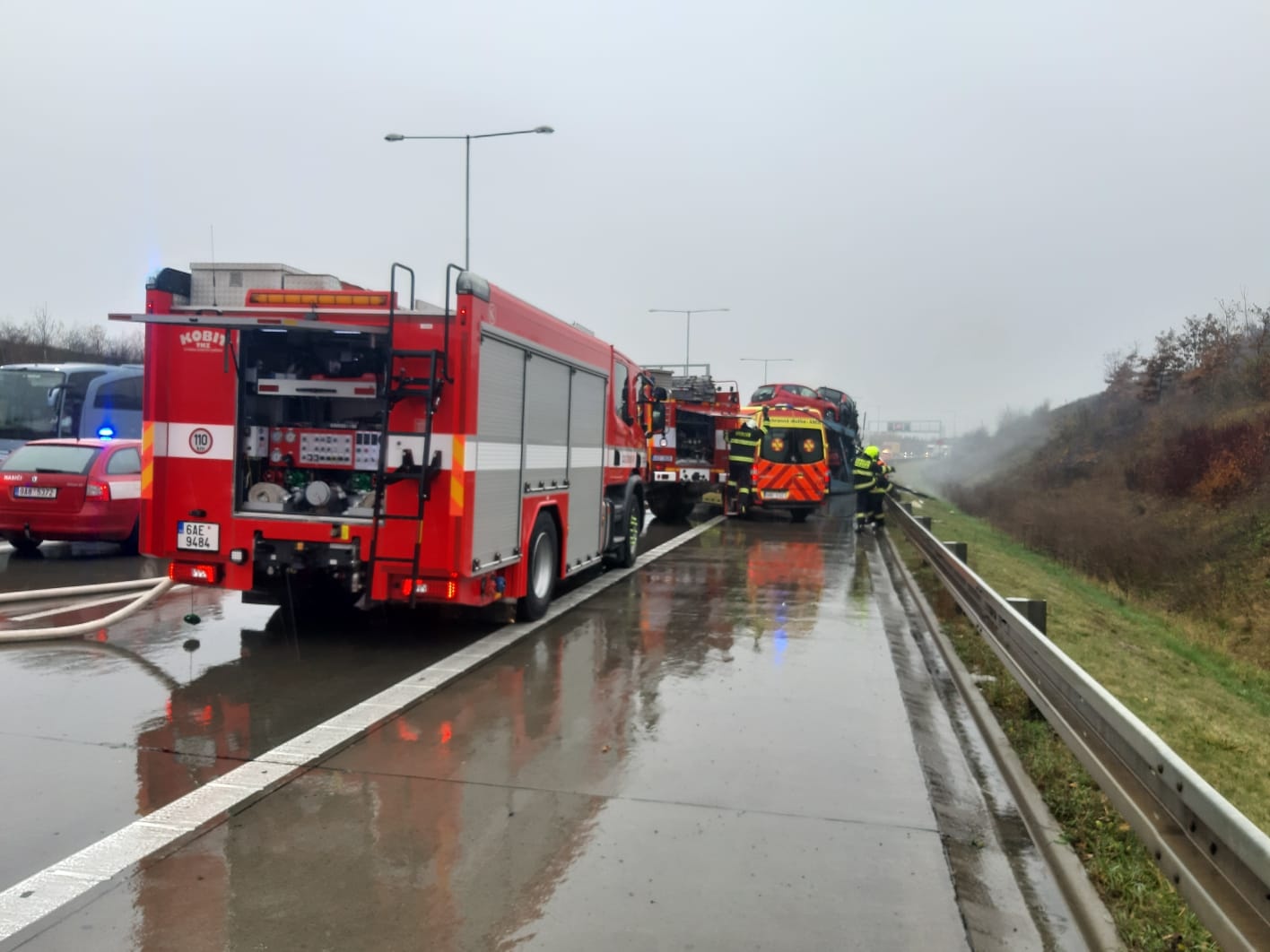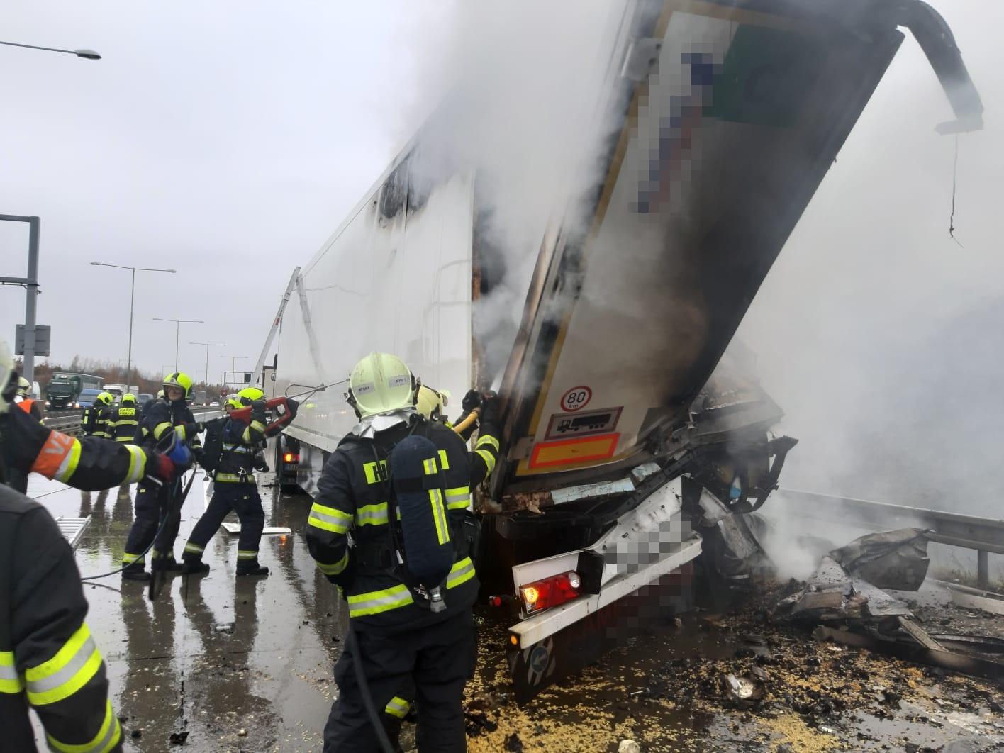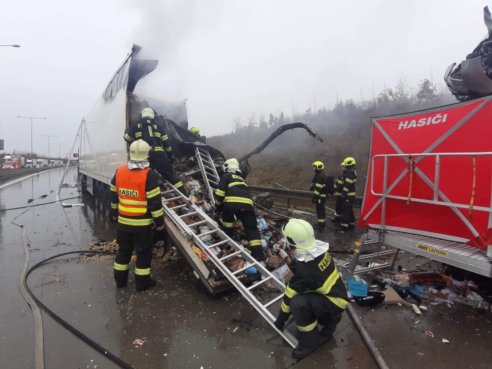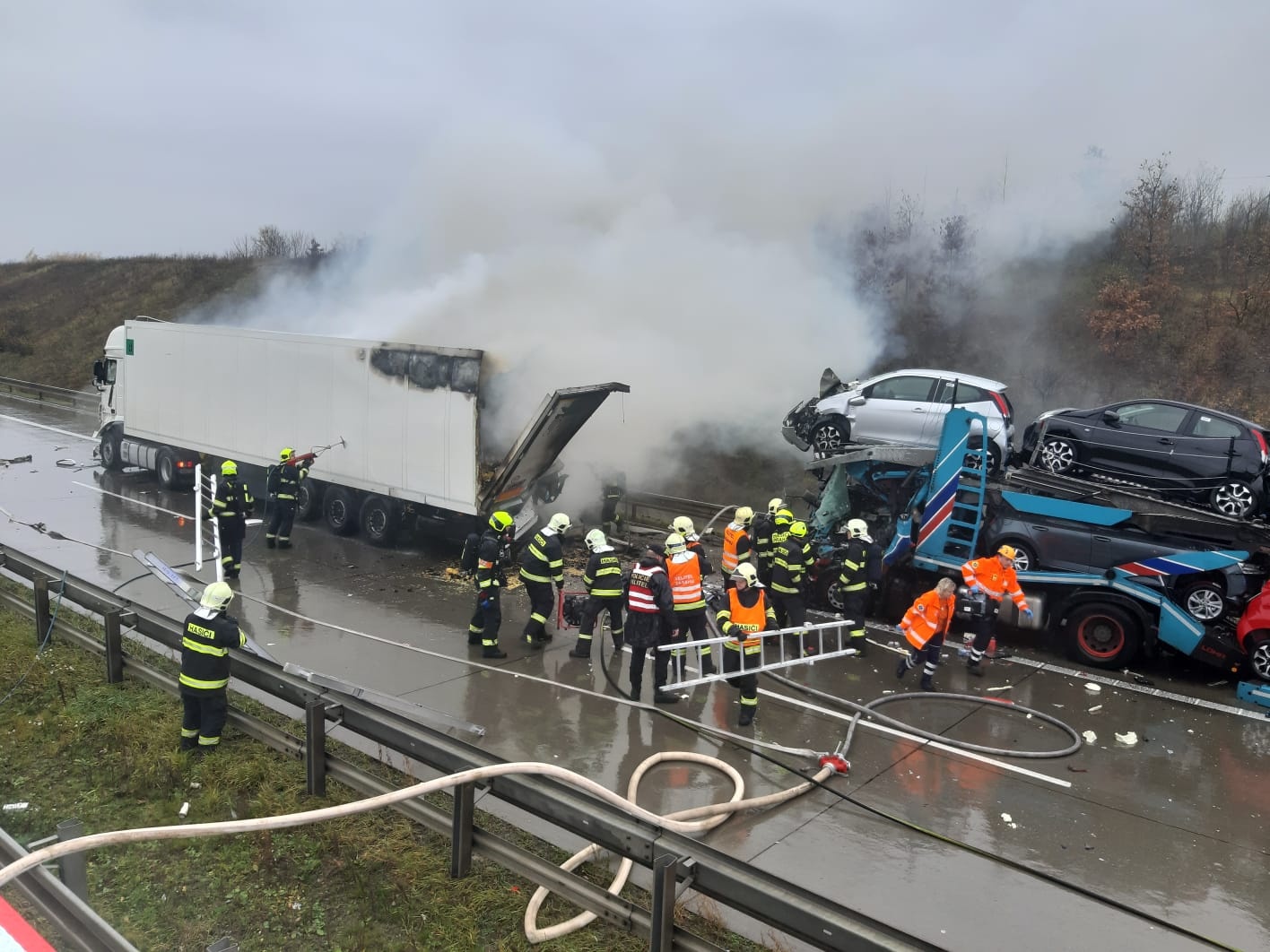 V pondělí 18. listopadu krátce po desáté hodině přijalo operační středisko středočeských hasičů oznámení o dopravní nehodě tří nákladních automobilů na Pražském okruhu nedaleko Jesenice ve směru k letišti.