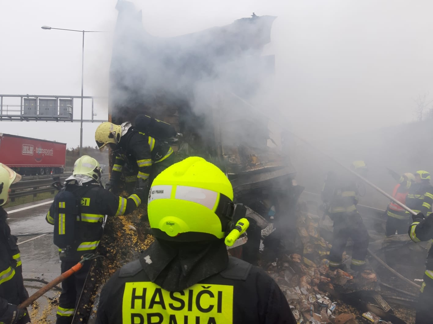 Ke zdolání požáru použili hasiči dva C proudy, vysokotlaký proud a pražská jednotka i zařízení Cobra. Vzhledem k tomu, že velitel zásahu požadoval na místo další cisternu, byla povolána také jednotka sboru dobrovolných hasičů obce Dolní Břežany. Kvůli řádnému dohašení převáženého nákladu bylo rozhodnuto o vyskladnění návěsu zasažené soupravy. Bylo také zapotřebí rozebrat a řádně uhasit všechna skrytá ohniska v nabourané části vozidla.