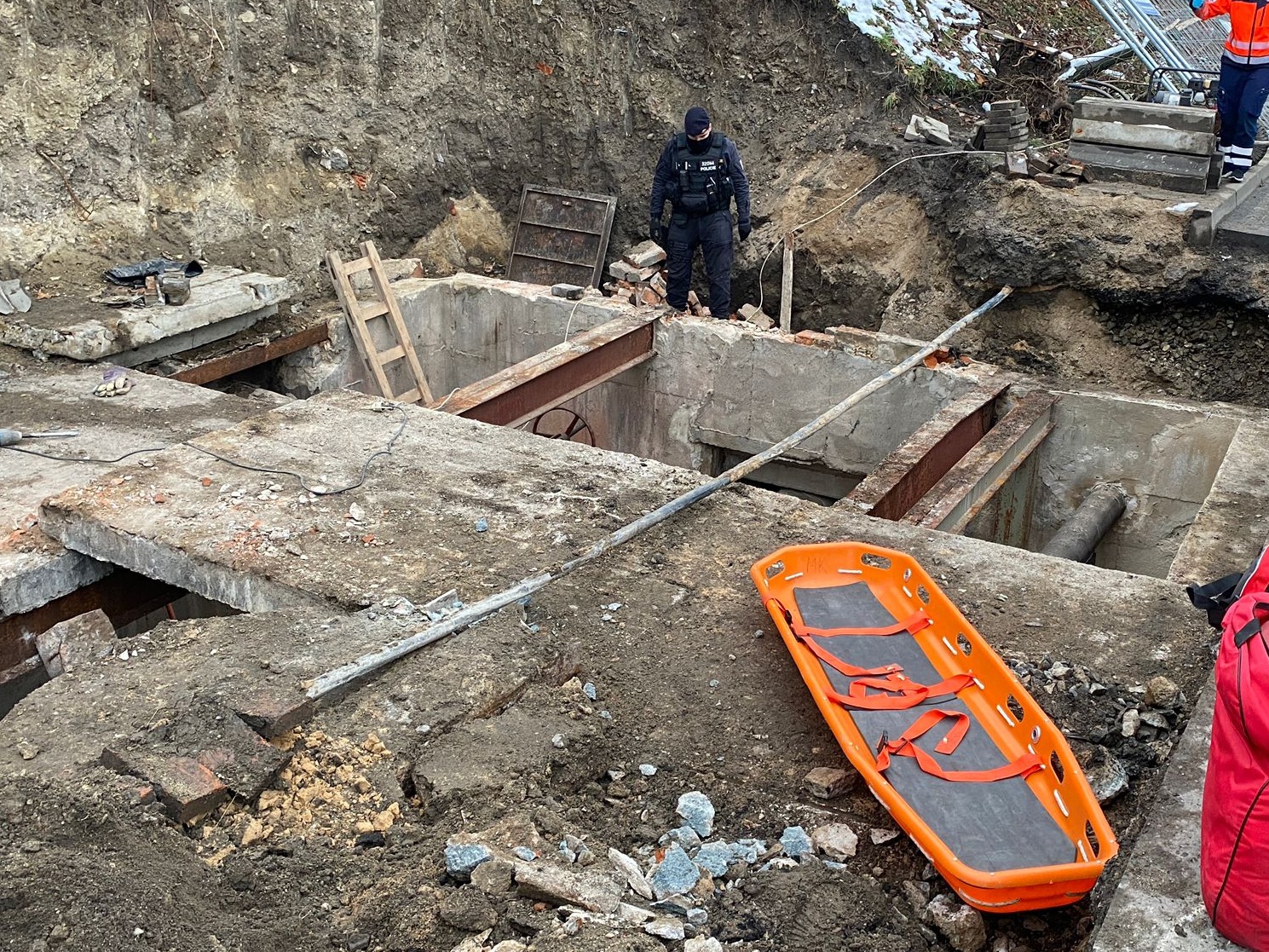 O dvě hodiny později vyjeli mělničtí profesionální hasiči k obdobné události. Při výkopových pracích došlo k pádu osoby do čtyřmetrové šachty v Bezručově ulici v Mělníku. Na pomoc proto i zde spěchali hasiči-lezci. Ti zraněného vytáhli za pomoci lezecké techniky a transportní vany. Za pomoci kladkostroje a bagru, který se nacházel na místě, hasiči osobu z výkopu vyprostili a předali do péče zdravotnické záchranné službě, která ji transportovala do nemocnice.