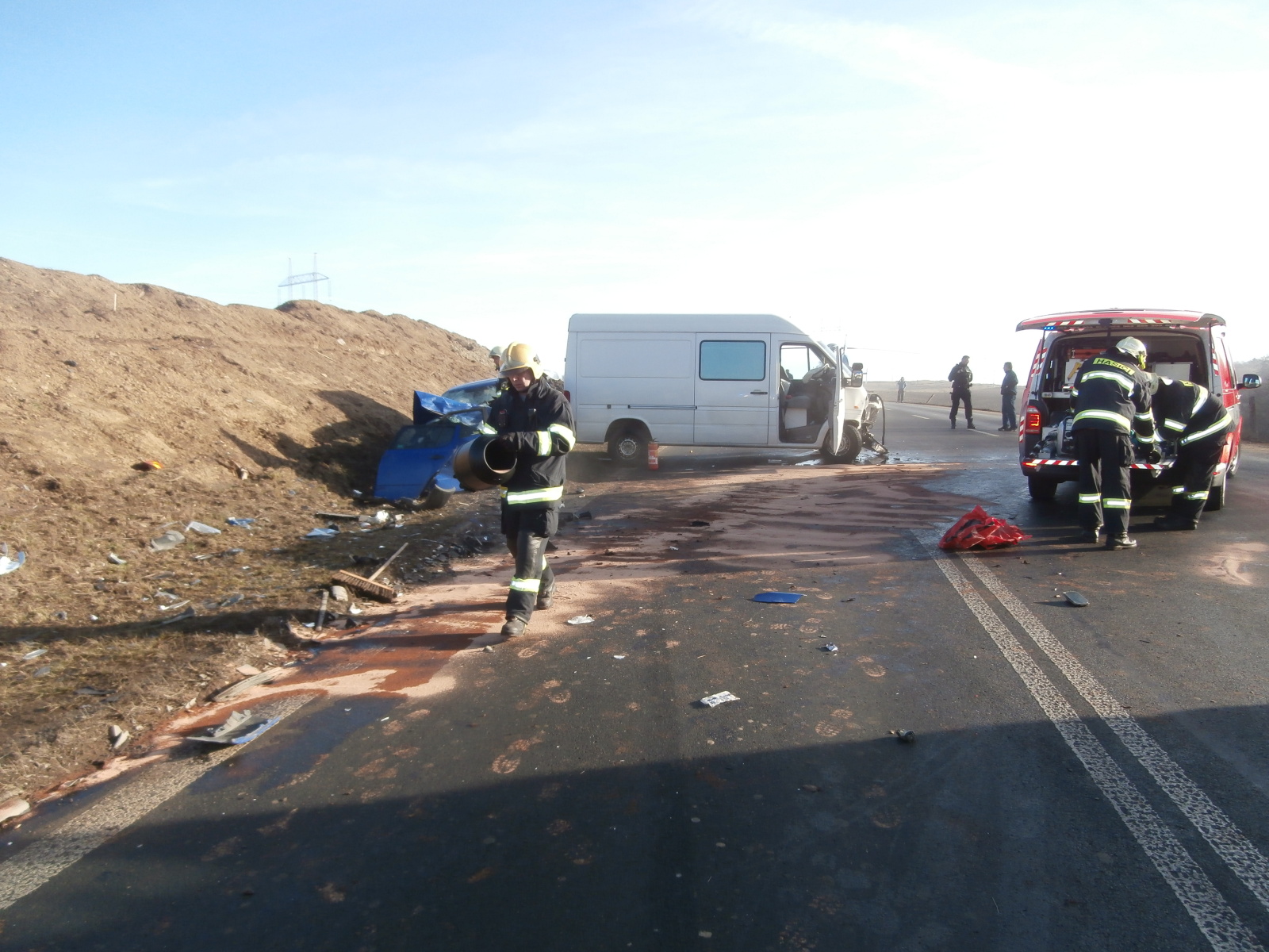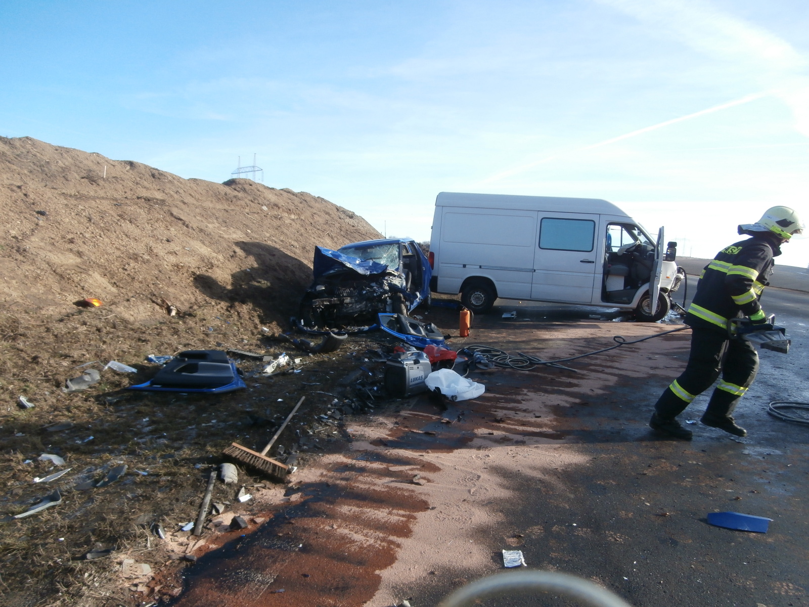 Po příjezdu na místo velitel zásahu upřesnil, že jde o čelní střet uvedených vozidel – celkem se čtyřmi zraněnými osobami. Hasiči neprodleně zahájili záchranné práce u nejvážněji zraněného řidiče osobního automobilu, který zůstal po nehodě zaklíněný ve voze. Šlo o komplikované vyproštění, při kterém hasiči úzce spolupracovali s posádkami ZZS.