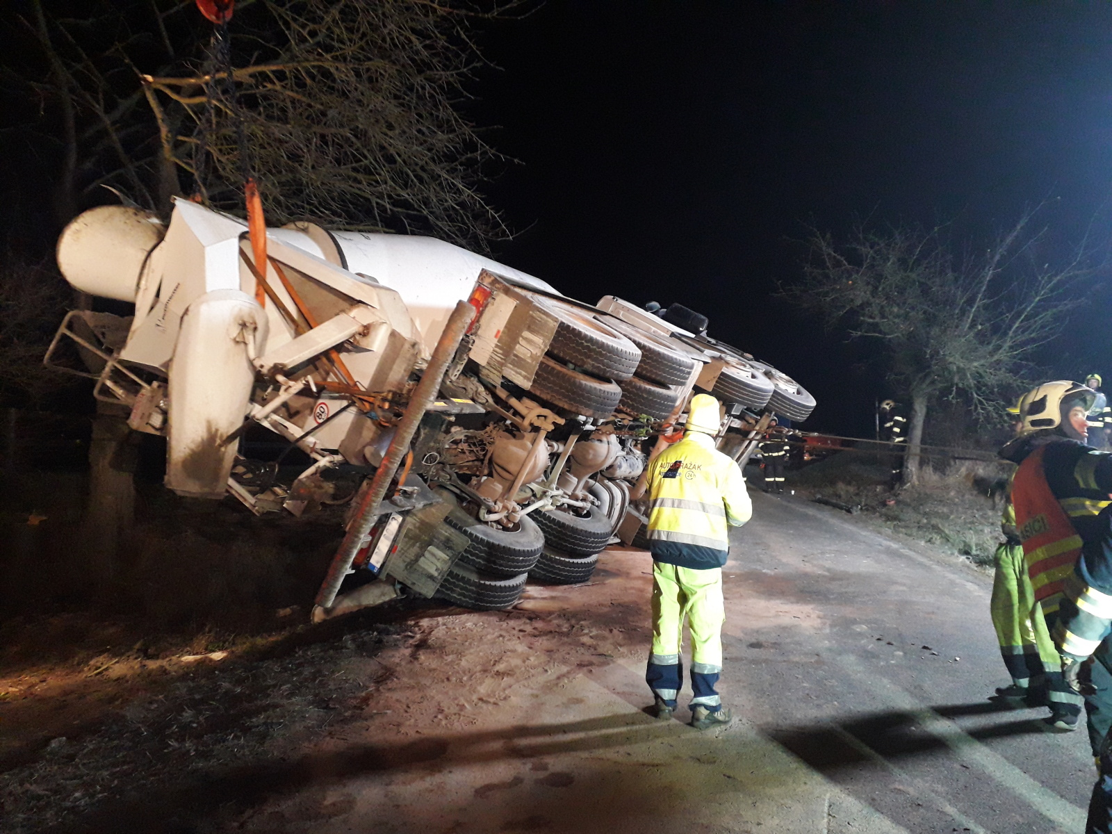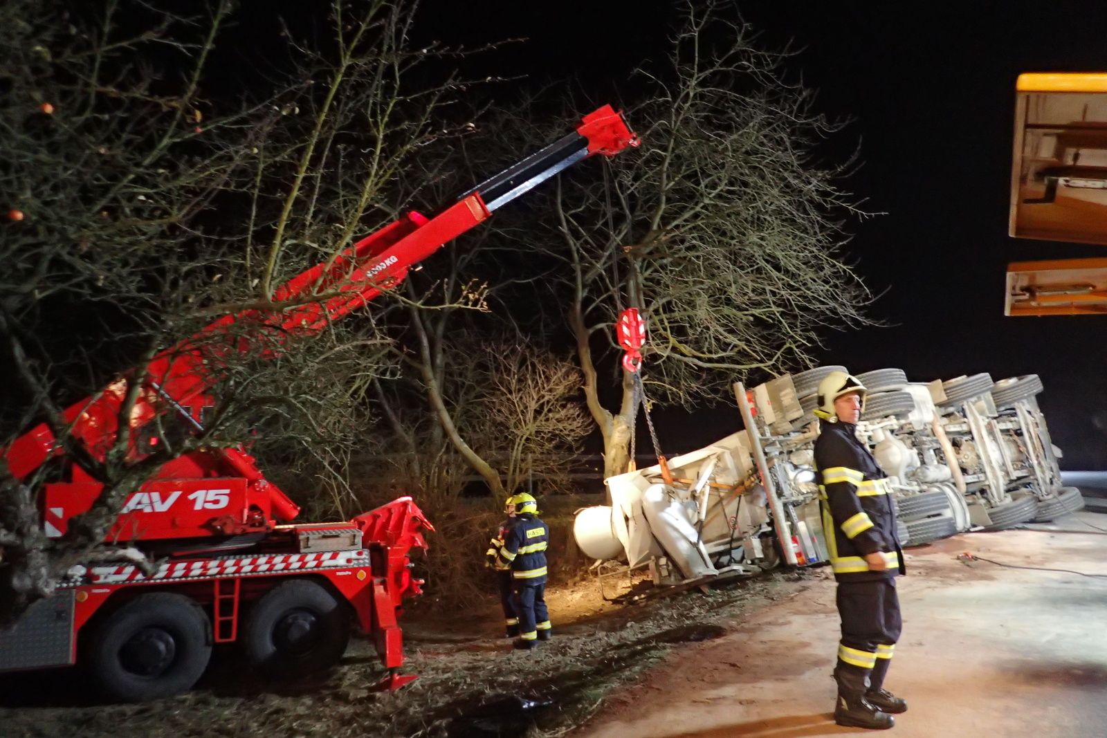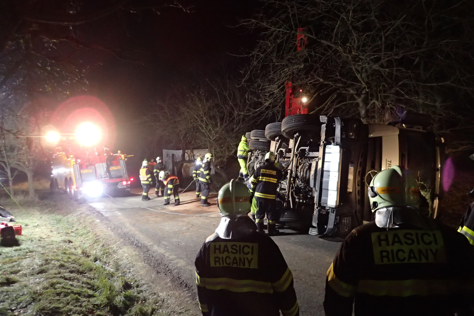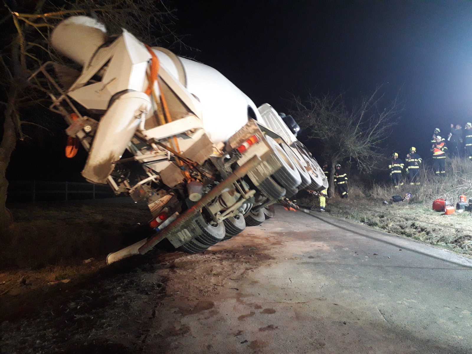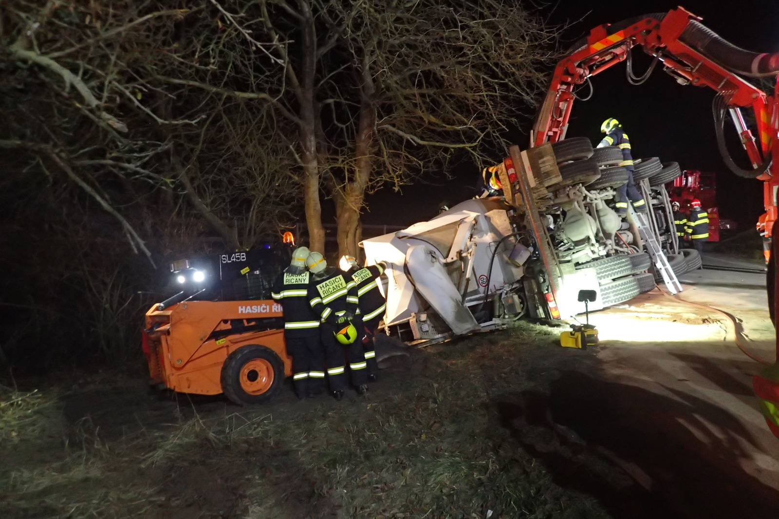 Operační důstojník k události vyslal profesionální hasiče ze stanic Jílové a Říčany. Po příjezdu první jednotky bylo zjištěno, že domíchávač je převrácený na boku, unikají z něj pohonné hmoty a z části vytekl i přepravovaný beton. Řidič, který ještě před příjezdem hasičů opustil kabinu, byl nezraněn.