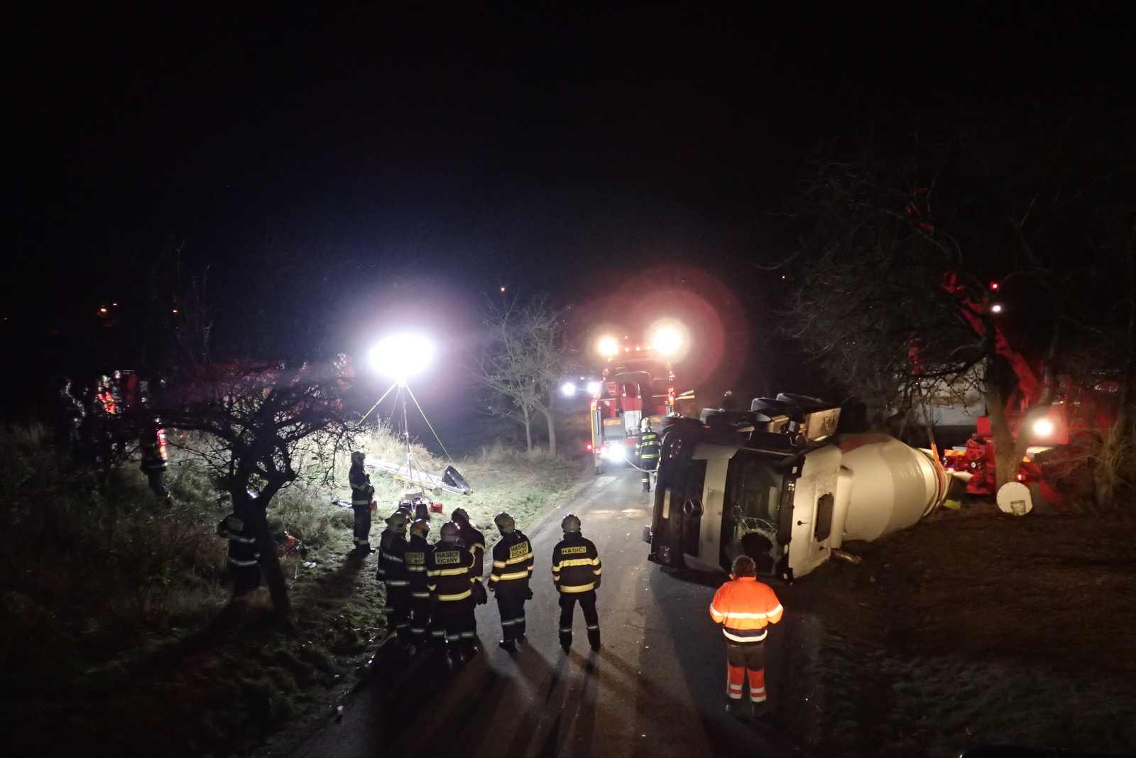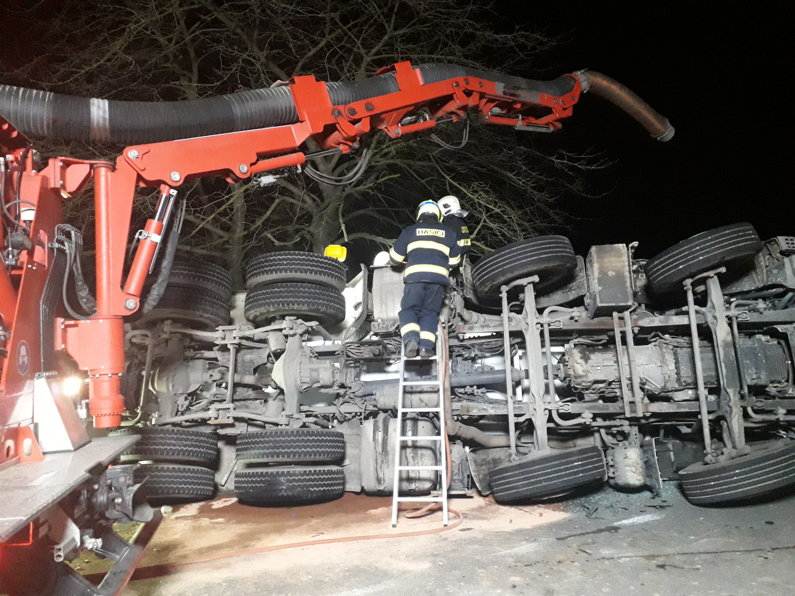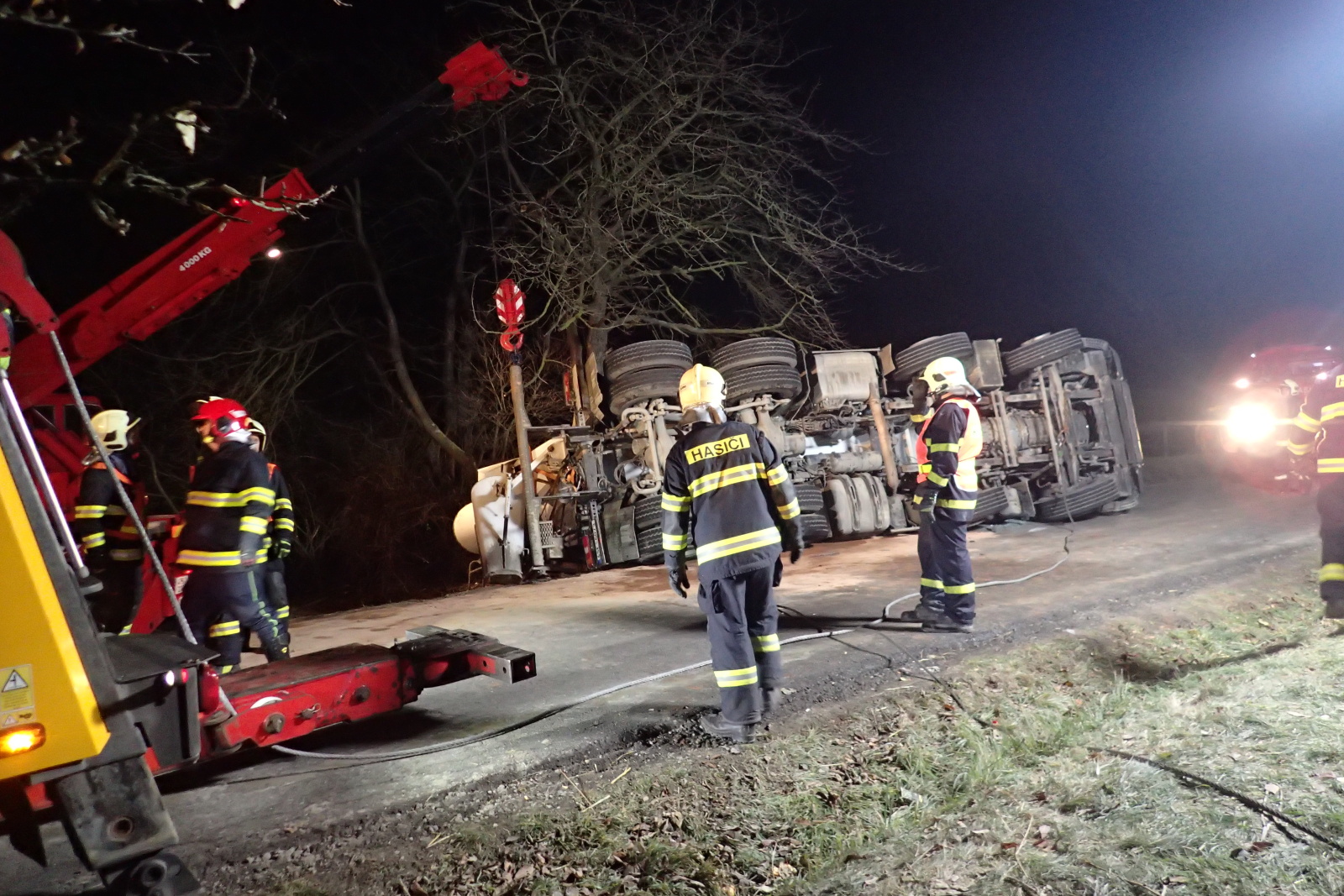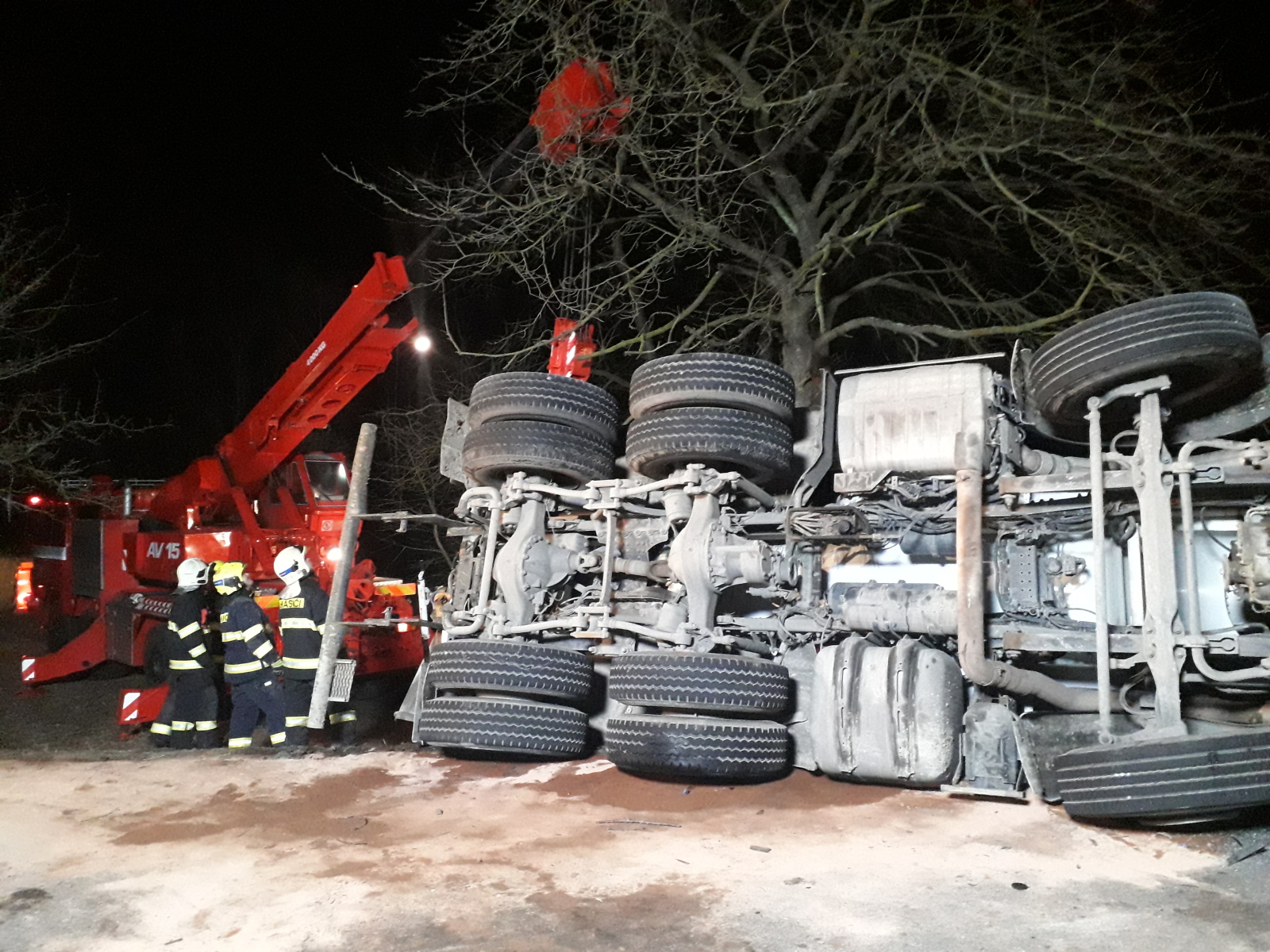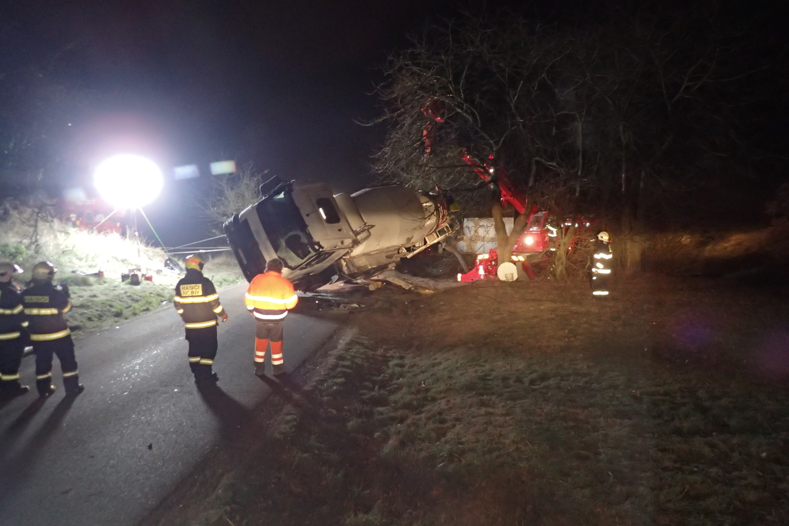 Operační důstojník k události vyslal profesionální hasiče ze stanic Jílové a Říčany. Po příjezdu první jednotky bylo zjištěno, že domíchávač je převrácený na boku, unikají z něj pohonné hmoty a z části vytekl i přepravovaný beton. Řidič, který ještě před příjezdem hasičů opustil kabinu, byl nezraněn.