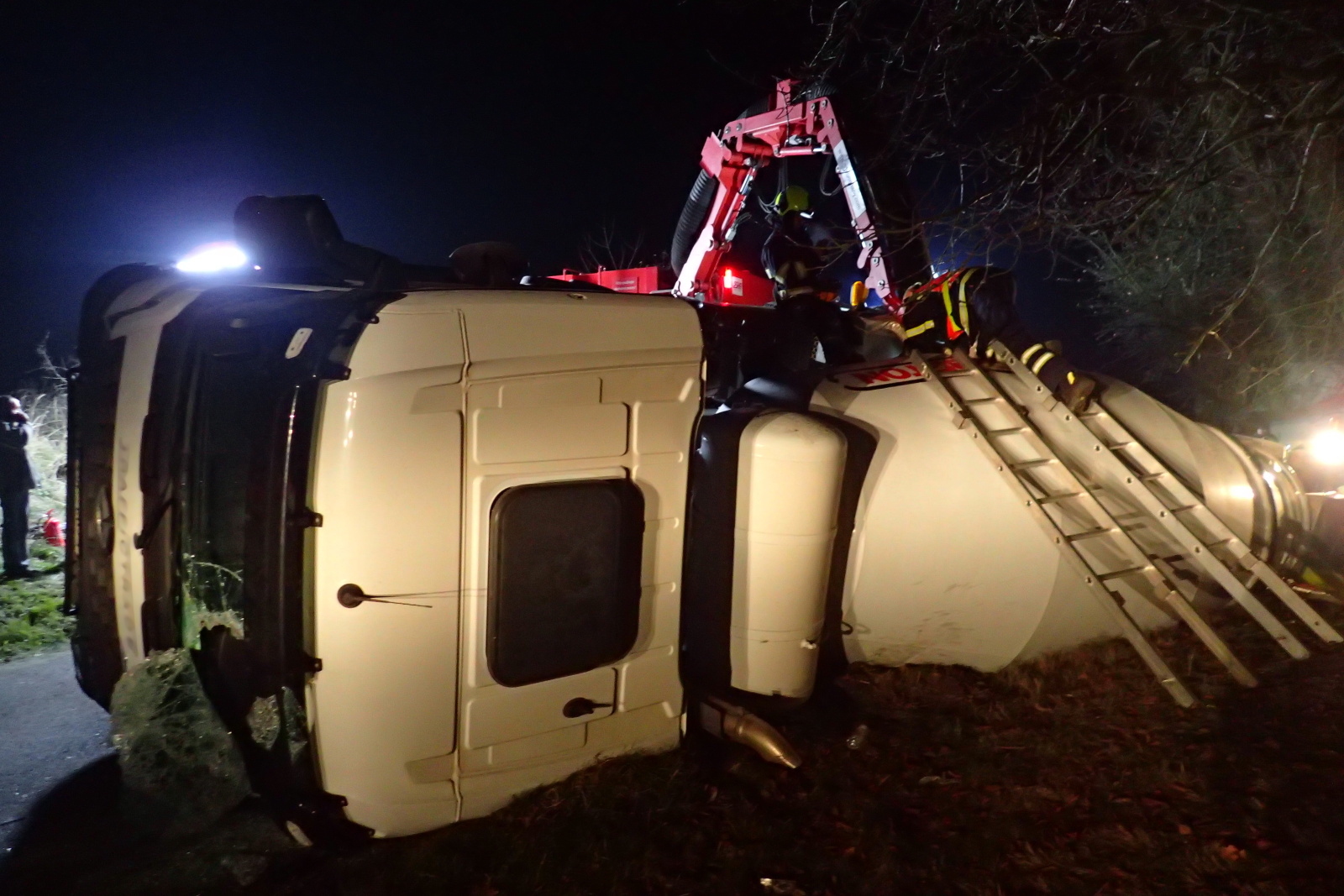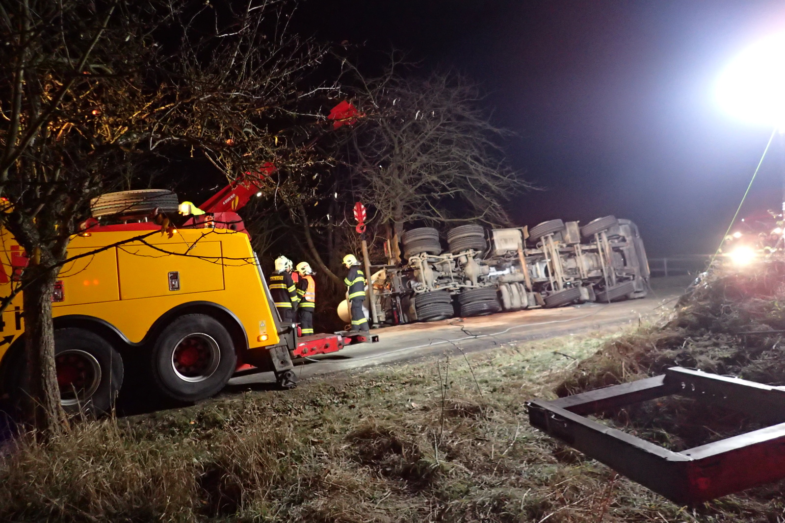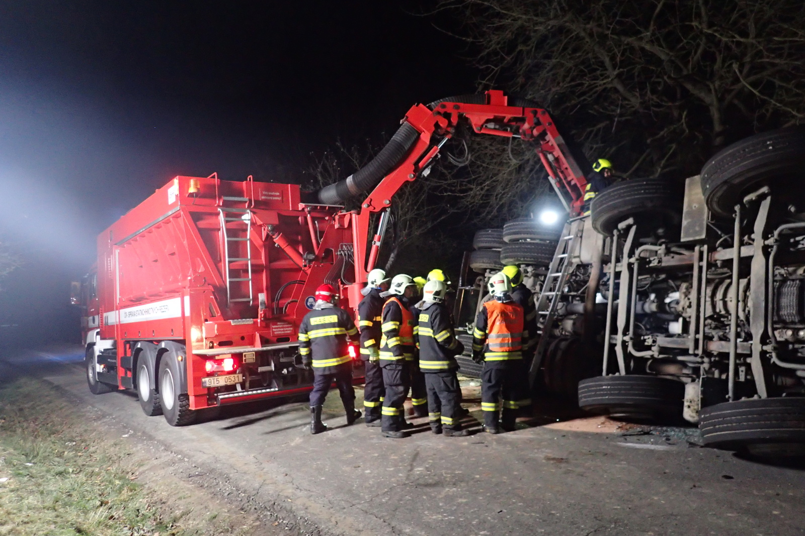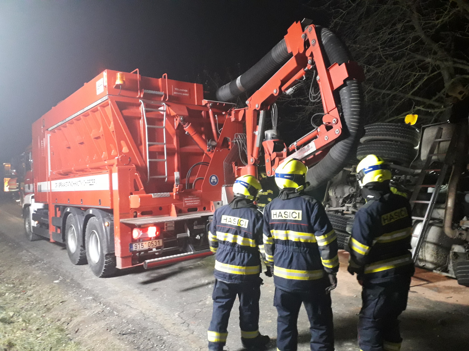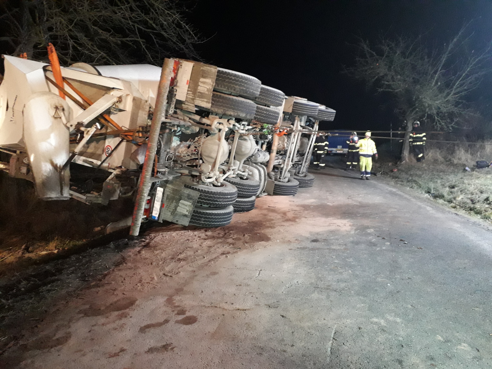 Operační důstojník k události vyslal profesionální hasiče ze stanic Jílové a Říčany. Po příjezdu první jednotky bylo zjištěno, že domíchávač je převrácený na boku, unikají z něj pohonné hmoty a z části vytekl i přepravovaný beton. Řidič, který ještě před příjezdem hasičů opustil kabinu, byl nezraněn.
