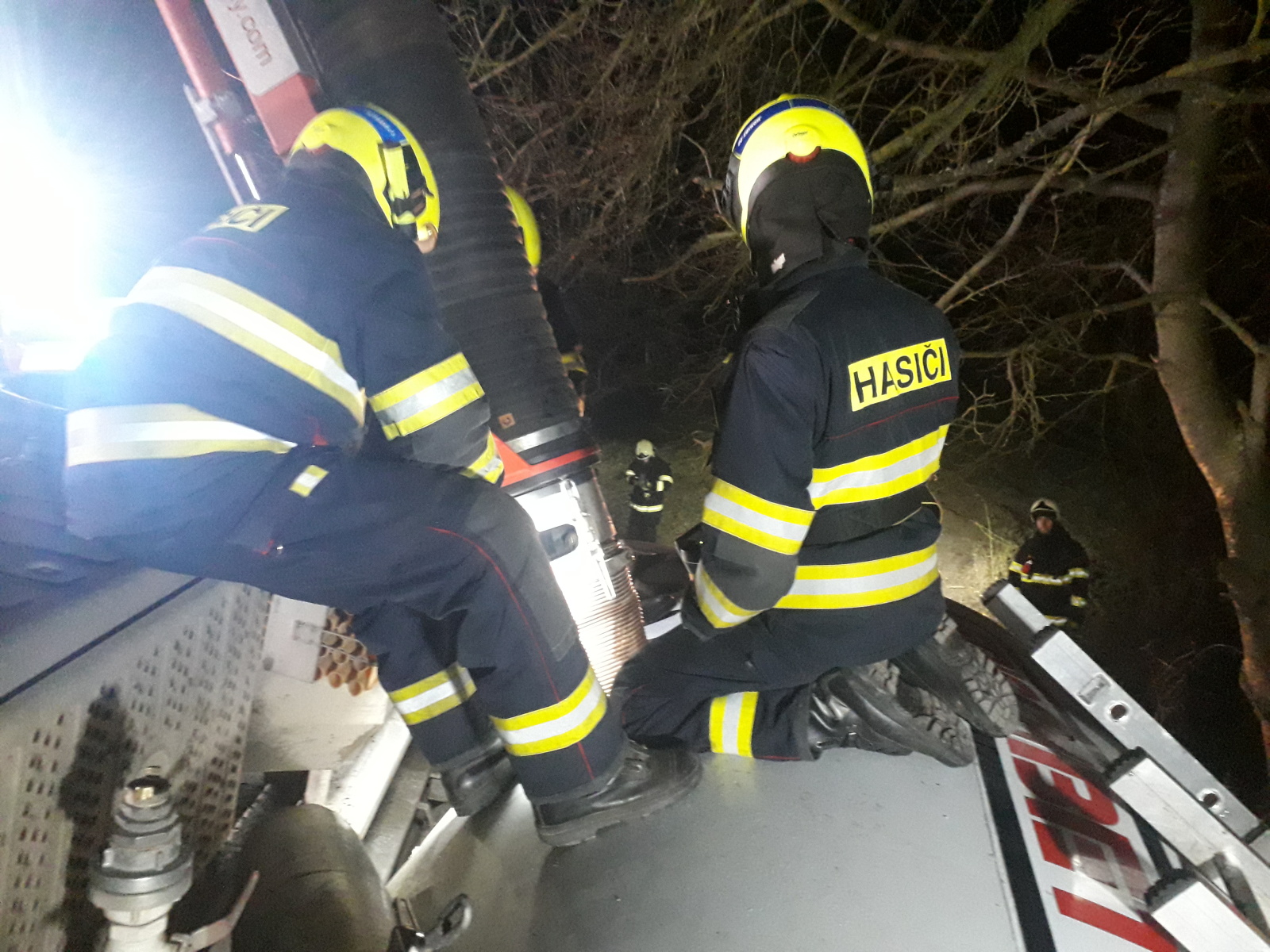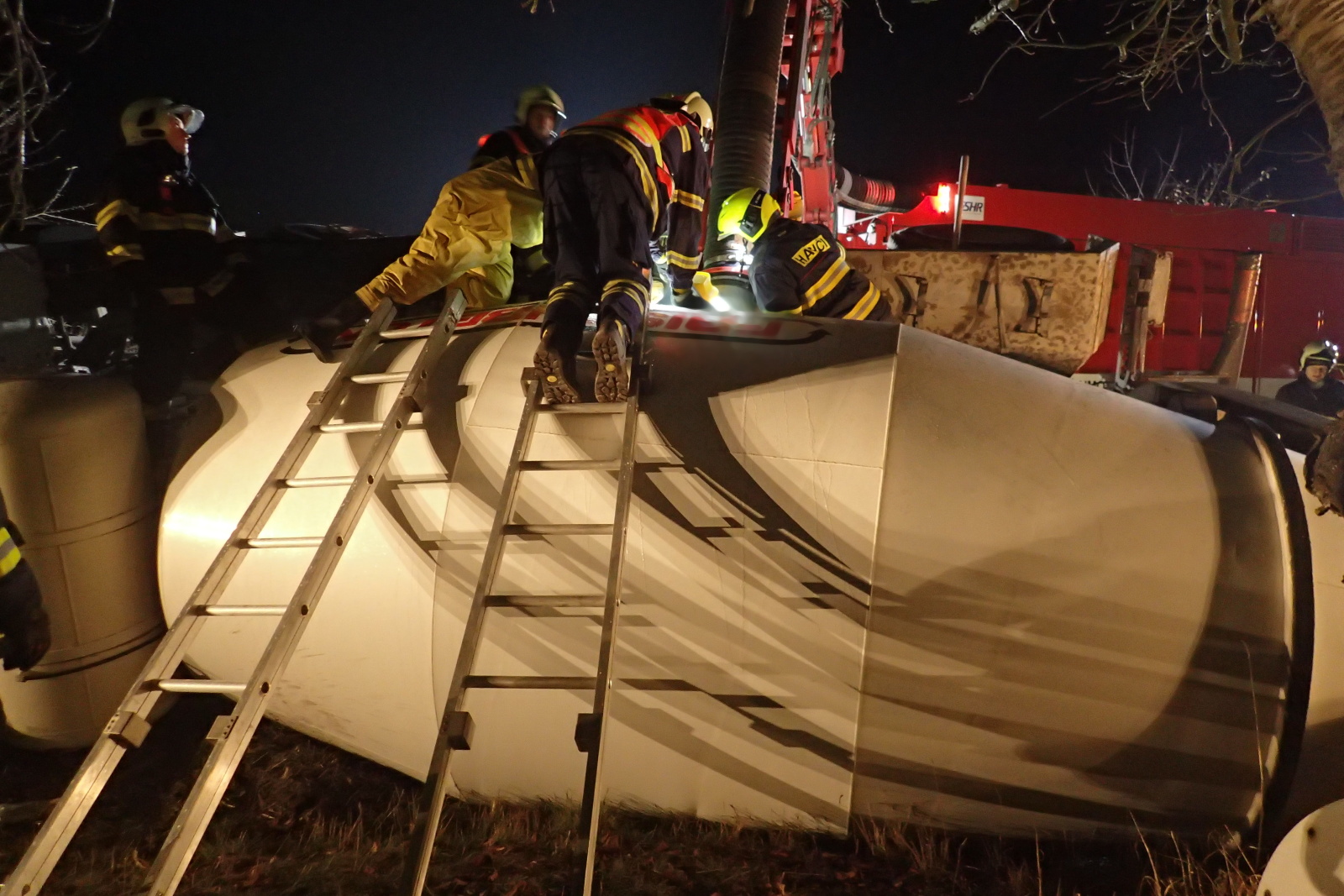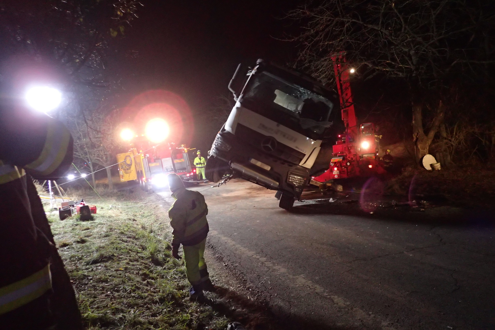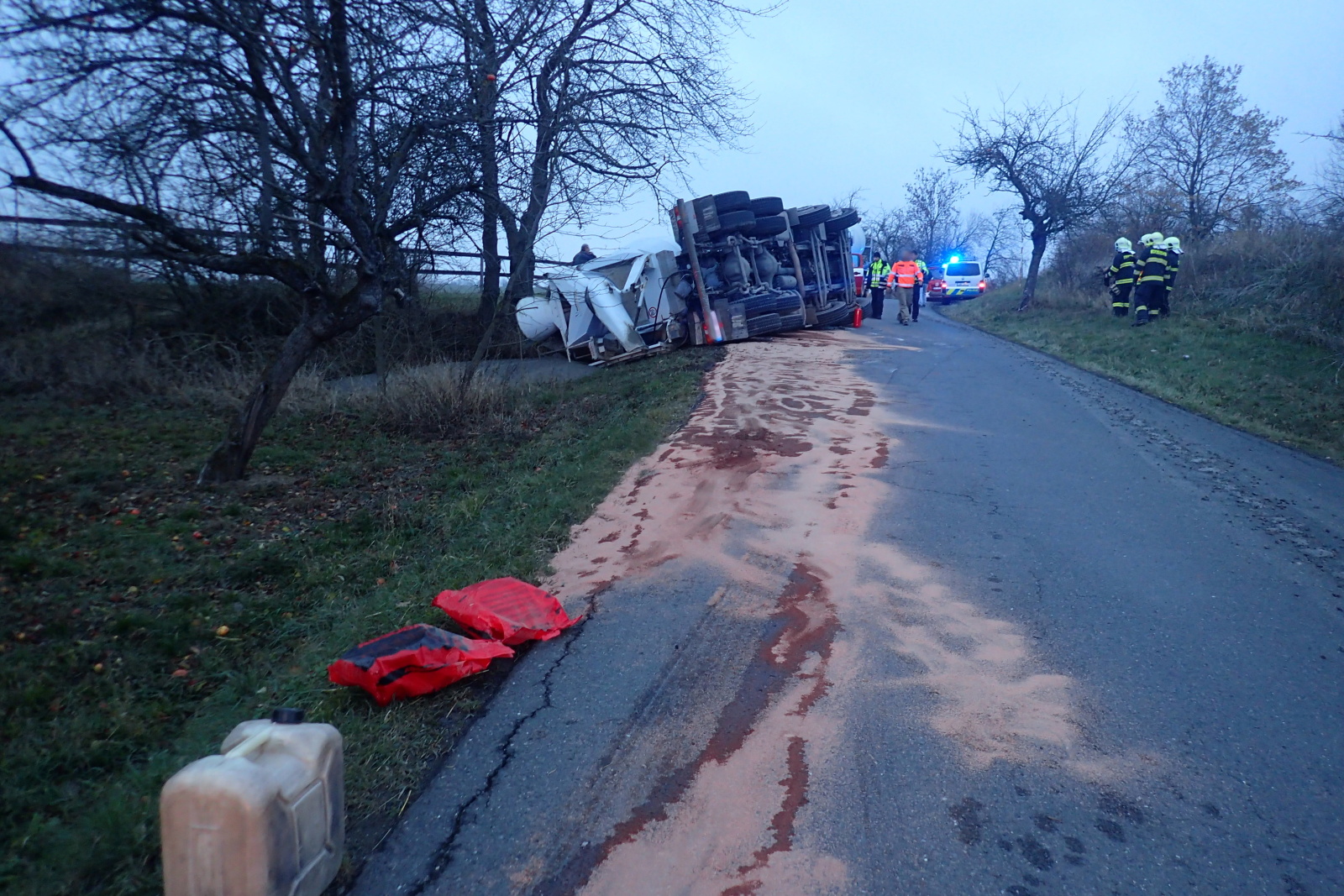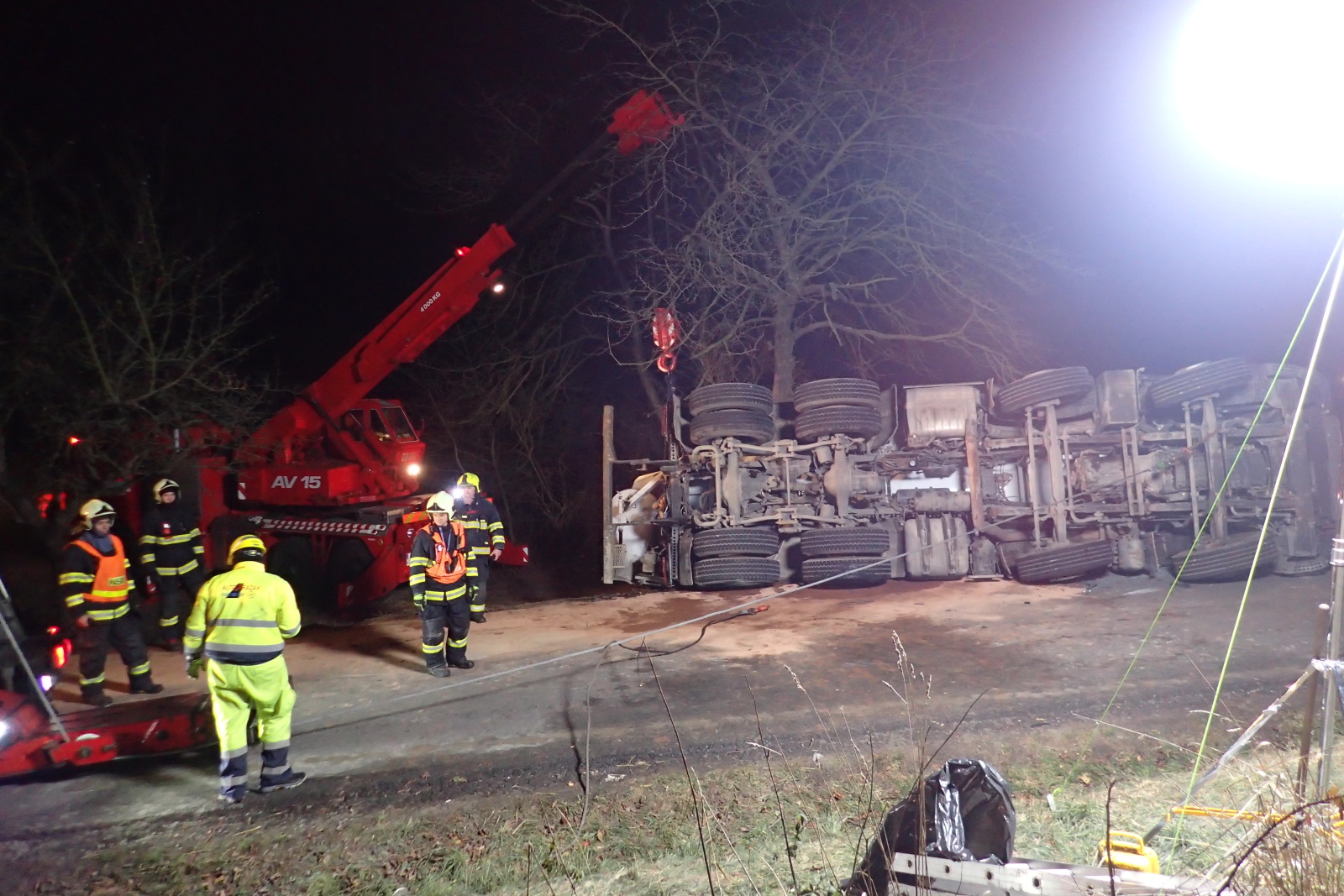 Operační důstojník k události vyslal profesionální hasiče ze stanic Jílové a Říčany. Po příjezdu první jednotky bylo zjištěno, že domíchávač je převrácený na boku, unikají z něj pohonné hmoty a z části vytekl i přepravovaný beton. Řidič, který ještě před příjezdem hasičů opustil kabinu, byl nezraněn.