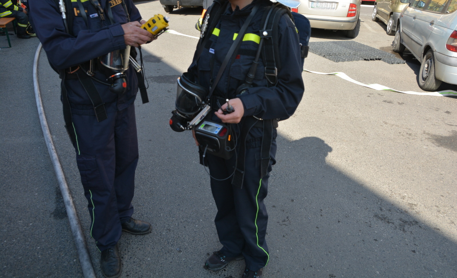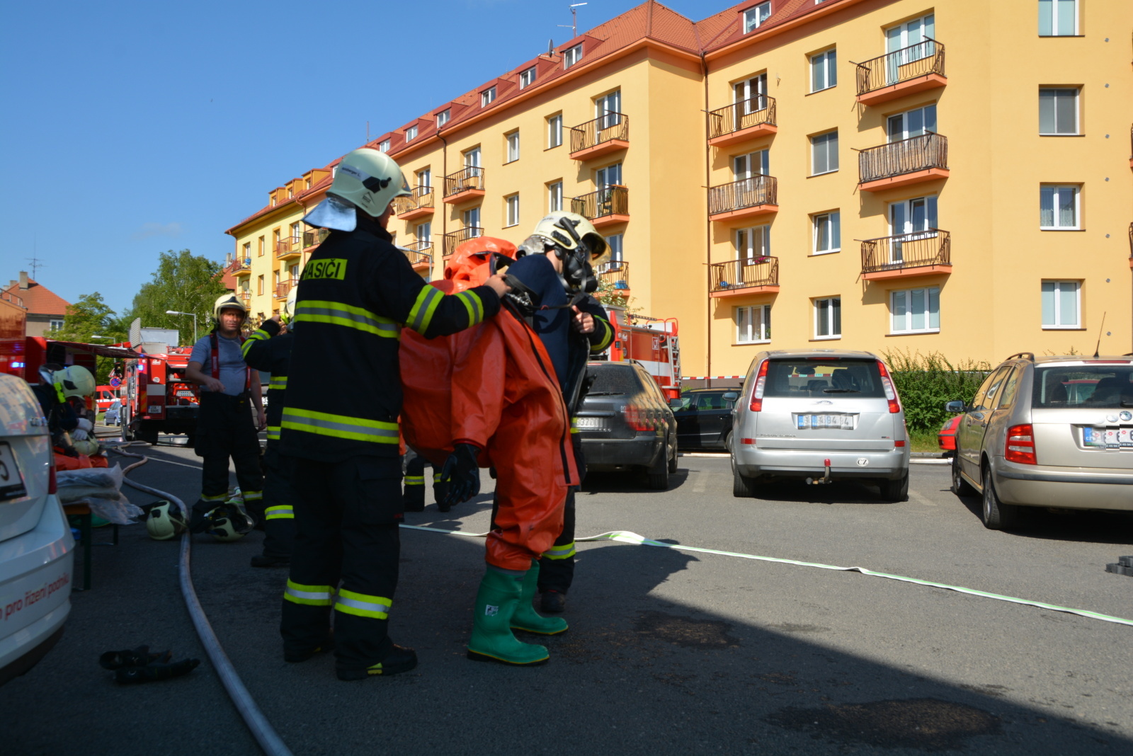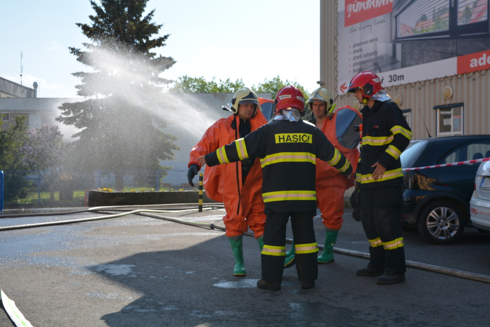 Skupina hasičů v maximální protichemické ochraně, tzn. v dýchací technice a přetlakovém protichemickém obleku, vstoupila do kontaminované místnosti s vysokou koncentrací plynného čpavku.