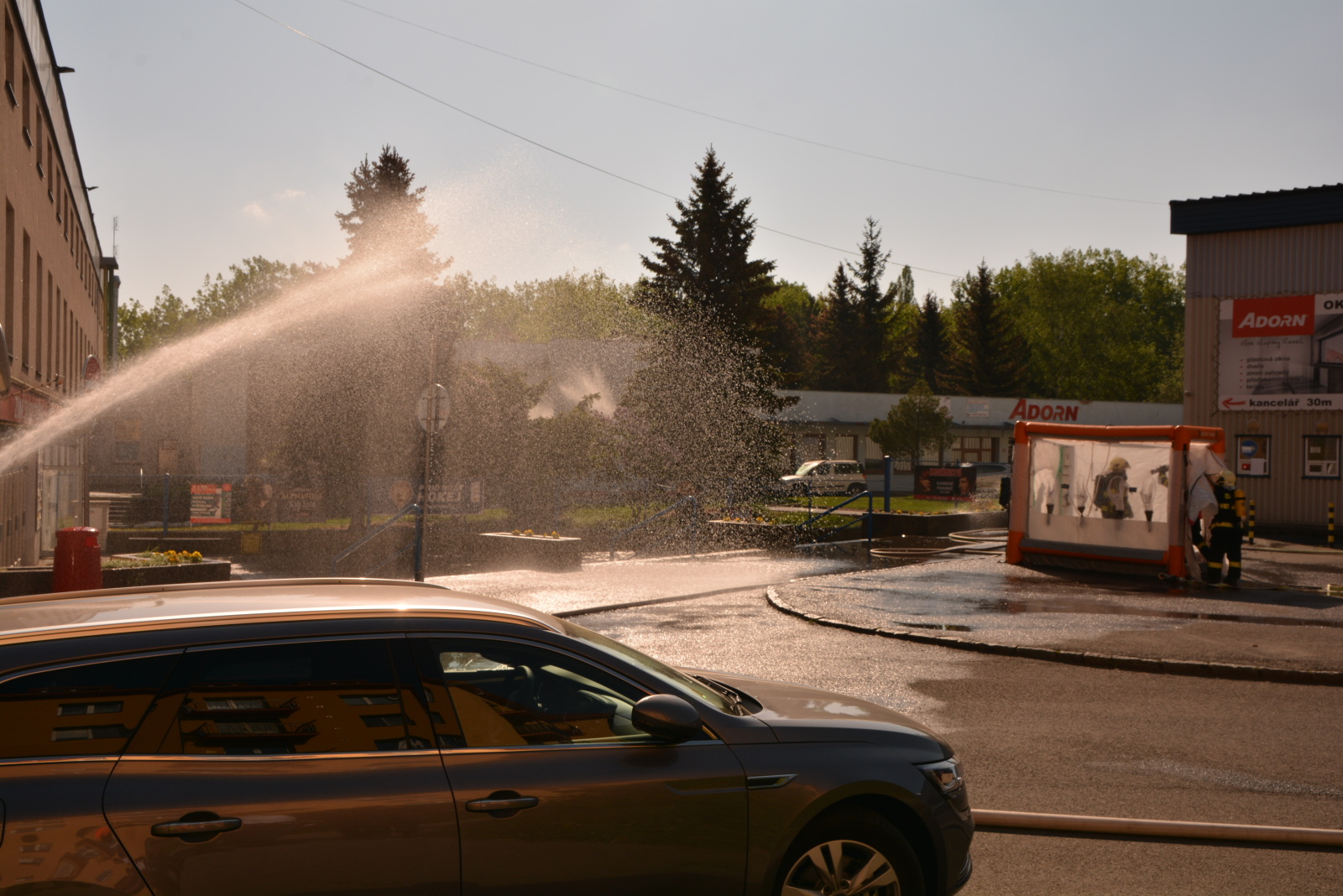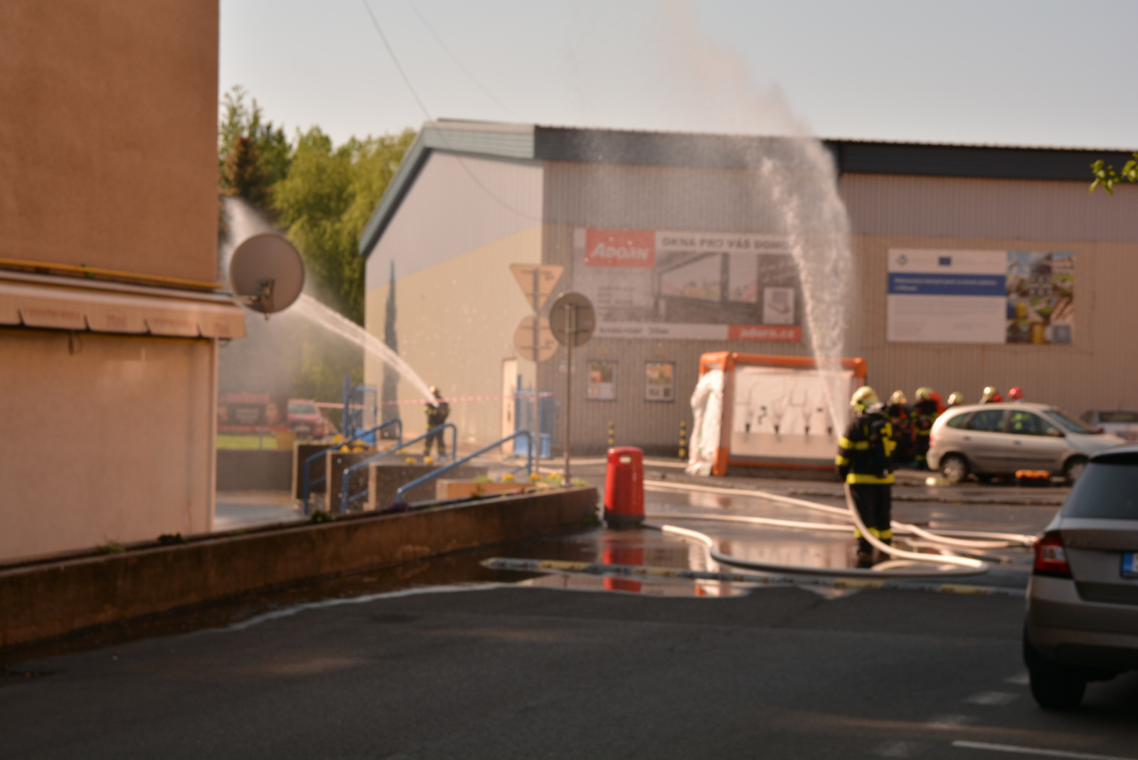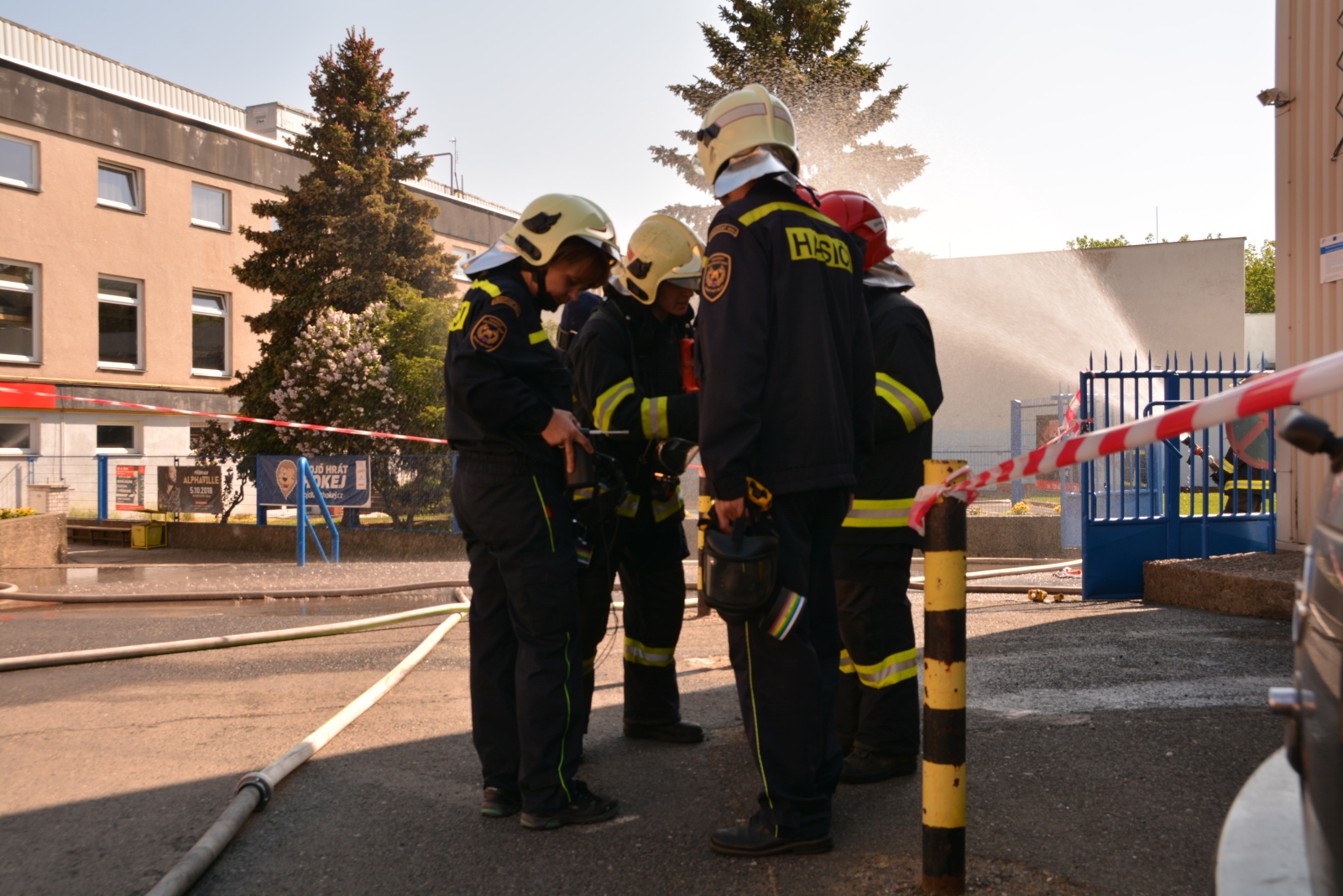 Skupina hasičů v maximální protichemické ochraně, tzn. v dýchací technice a přetlakovém protichemickém obleku, vstoupila do kontaminované místnosti s vysokou koncentrací plynného čpavku.