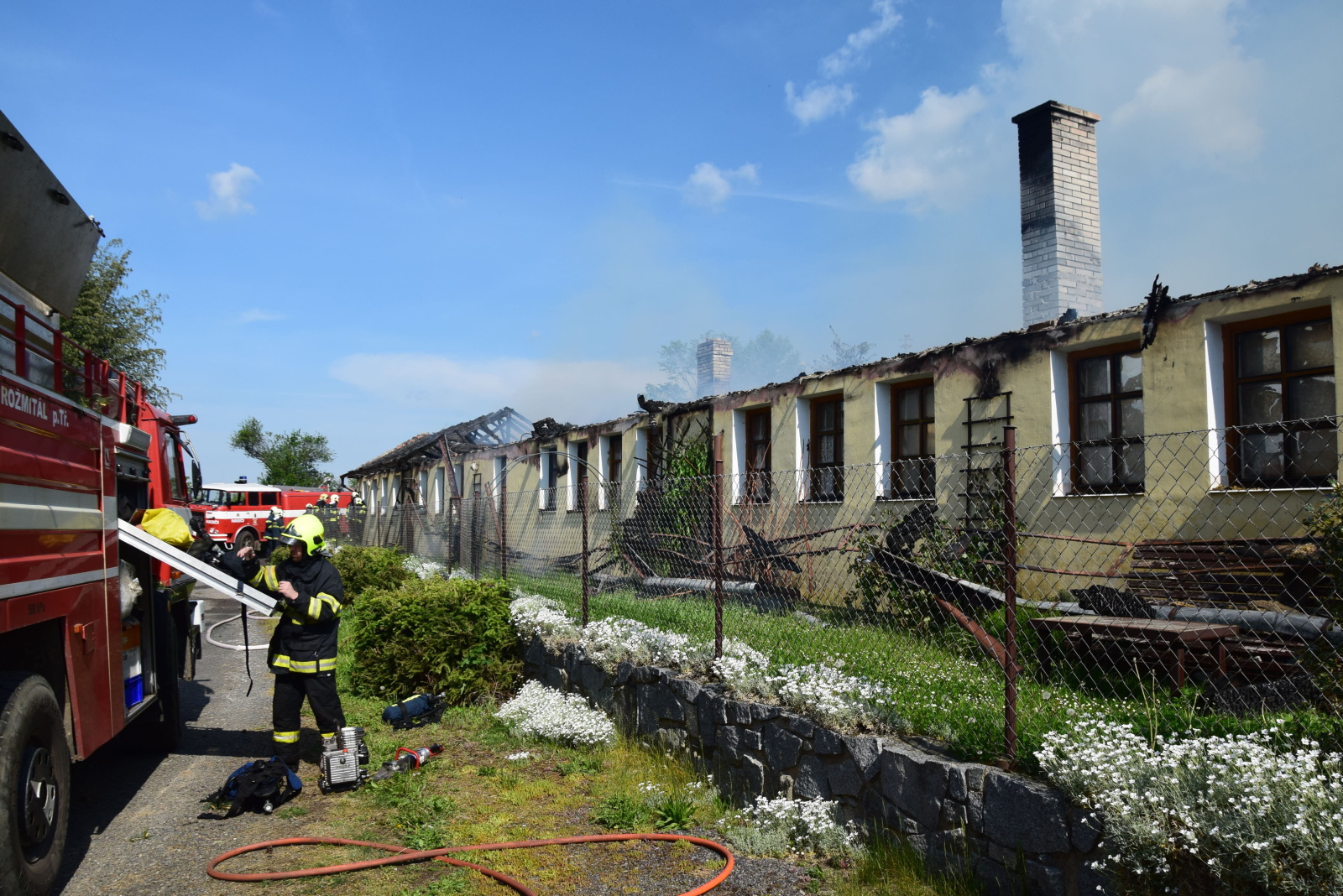 K události byli vysláni profesionální hasiči z Příbrami, kterým vyjely na pomoc dobrovolné sbory obcí Březnice, Hvožďany, Příbram VI-Březové Hory a Rožmitál pod Třemšínem. Po příjezdu k události byl už objekt o půdorysu 25 x 5 metrů celý v plamenech a velitel zásahu požádal o posilové jednotky. V rámci mezikrajské spolupráce tak vyrazily i jednotky HZS Blatná a SDH Bělčiče a Lnáře ze sousedního okresu Strakonice. Zároveň byl vyhlášen druhý stupeň požárního poplachu.