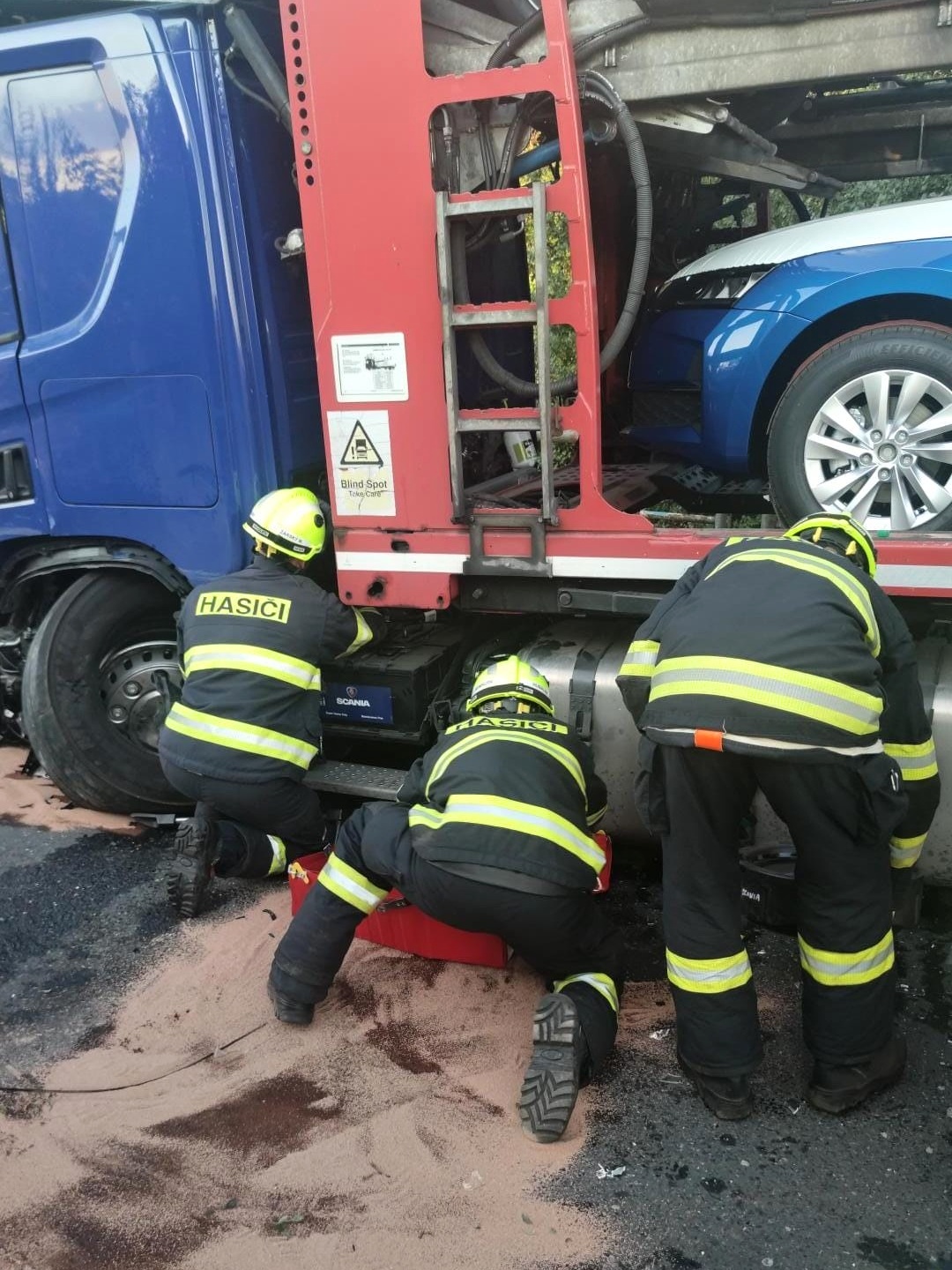 Hasiči vyprostili z převráceného osobního vozidla zaklíněného řidiče a nákladní soupravy převážející osobní vozy.