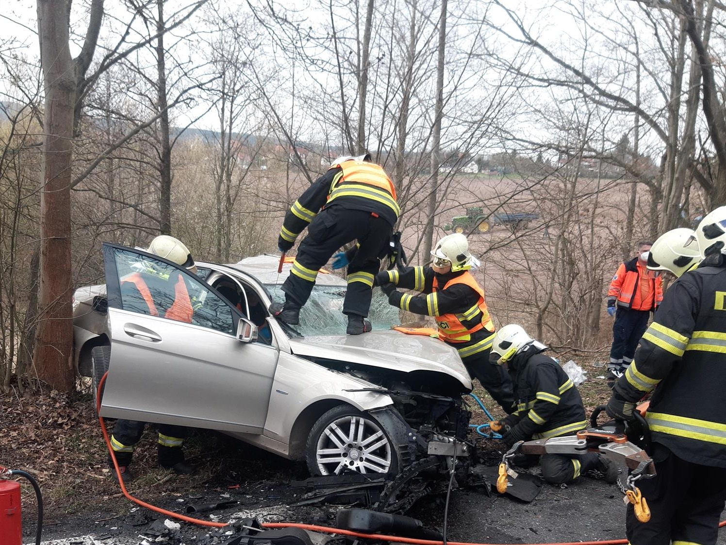 Za necelých devět minut od vyhlášení poplachu byli hasiči na místě a započali ve spolupráci se zdravotníky s vyprošťováním zraněné osoby za pomoci hydraulického vyprošťovacího zařízení. Zraněný řidič byl následně předán do péče zdravotnické záchranné služby, která k rychlejšímu transportu do nemocnice povolala vrtulník Letecké záchranné služby. Řidič z druhého osobního automobilu byl transportován do nemocnice pozemní cestou sanitkou.  Po úspěšné záchraně se hasiči zaměřili na protipožární opatření na vozidlech a zajištění místa nehody.