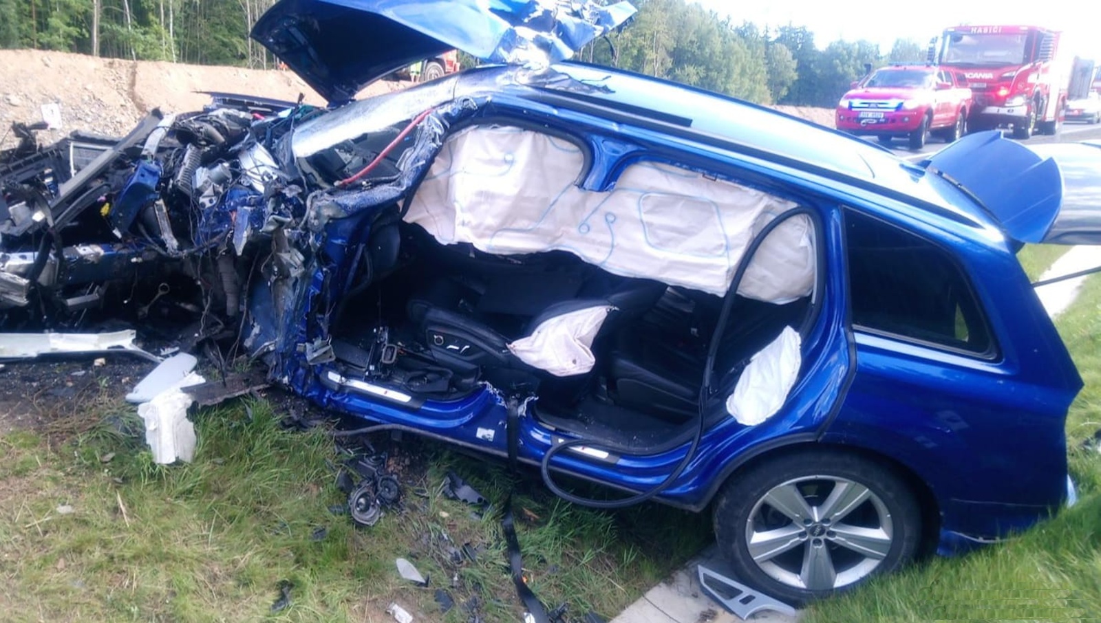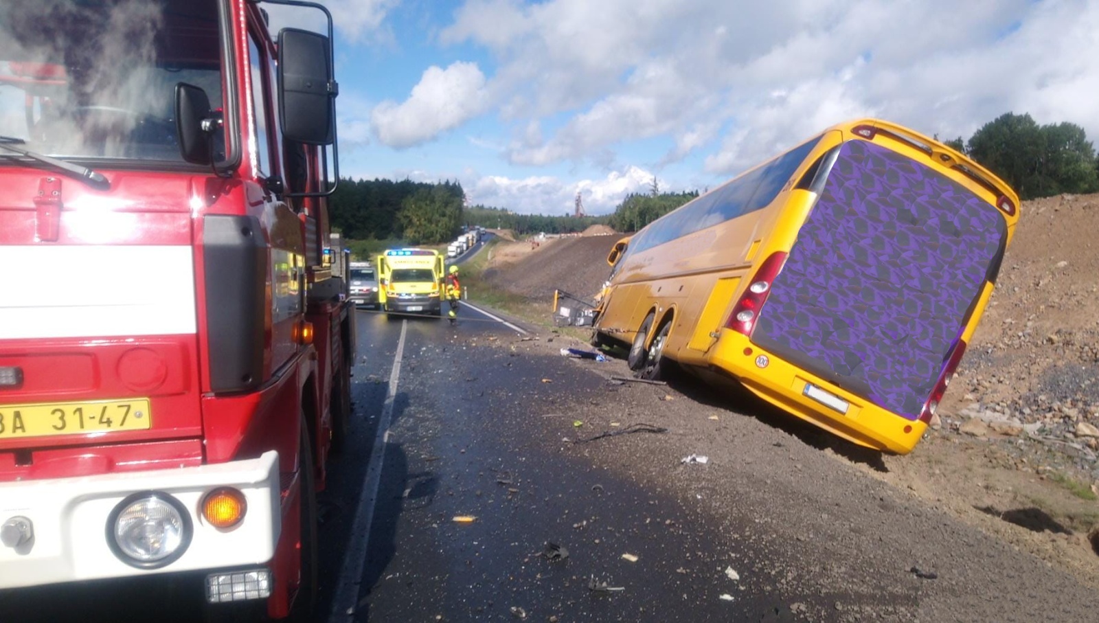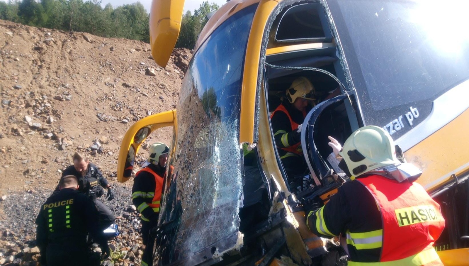 Podle prvotní informace přímo od cestující z autobusu nebyl nikdo z pasažérů zraněn, ale nemohli se dostat ven, protože vozidlo zůstalo nakloněné pravou stranou ke svahu. Další volající upřesnil, že v osobním vozidle zůstal po čelním střetu s autobusem zaklíněný řidič, který byl patrně vážně zraněn.
