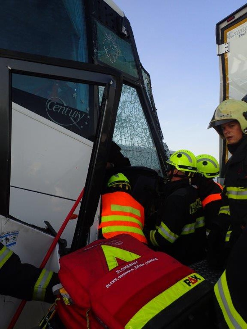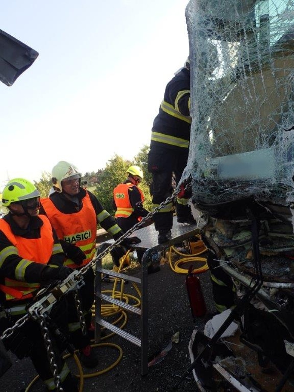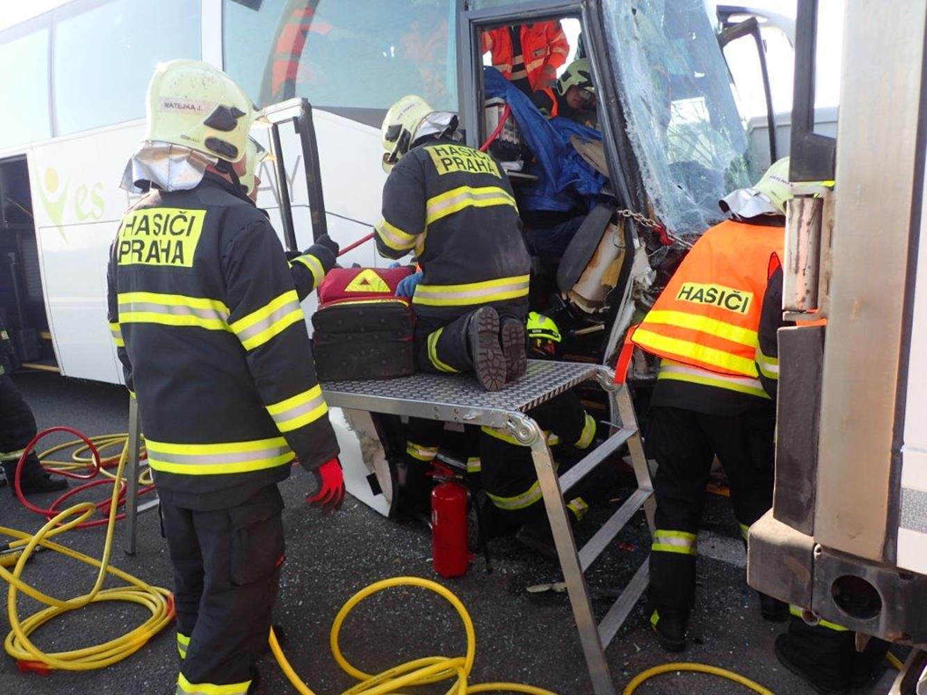 Vzhledem k tomu, že se nehoda stala v úseku s obousměrným omezením provozu, měly jednotky velký problém se k havarovaným vozidlům vůbec dostat. Jako první se na místo dostavila jednotka z Prahy, která zastavila v opačném směru. Velitel jednotky při průzkumu zjistil, že v autobuse cestovalo 32 osob, z nichž jedna na sedadle průvodce byla zaklíněna s nutností vyproštění za použití hydraulického nářadí. Následně byla zraněná osoba letecky transportována do pražské nemocnice v Motole.