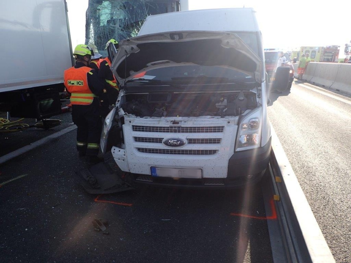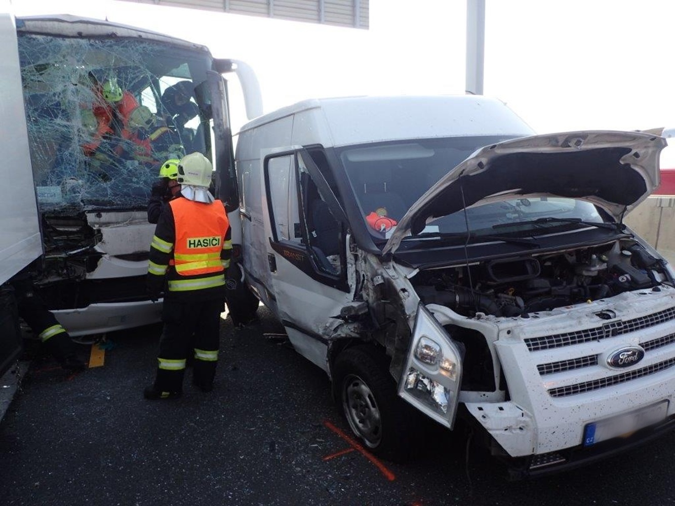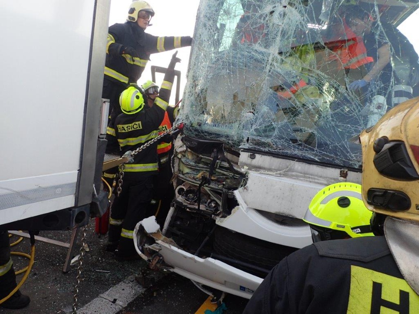 Vzhledem k tomu, že se nehoda stala v úseku s obousměrným omezením provozu, měly jednotky velký problém se k havarovaným vozidlům vůbec dostat. Jako první se na místo dostavila jednotka z Prahy, která zastavila v opačném směru. Velitel jednotky při průzkumu zjistil, že v autobuse cestovalo 32 osob, z nichž jedna na sedadle průvodce byla zaklíněna s nutností vyproštění za použití hydraulického nářadí. Následně byla zraněná osoba letecky transportována do pražské nemocnice v Motole.