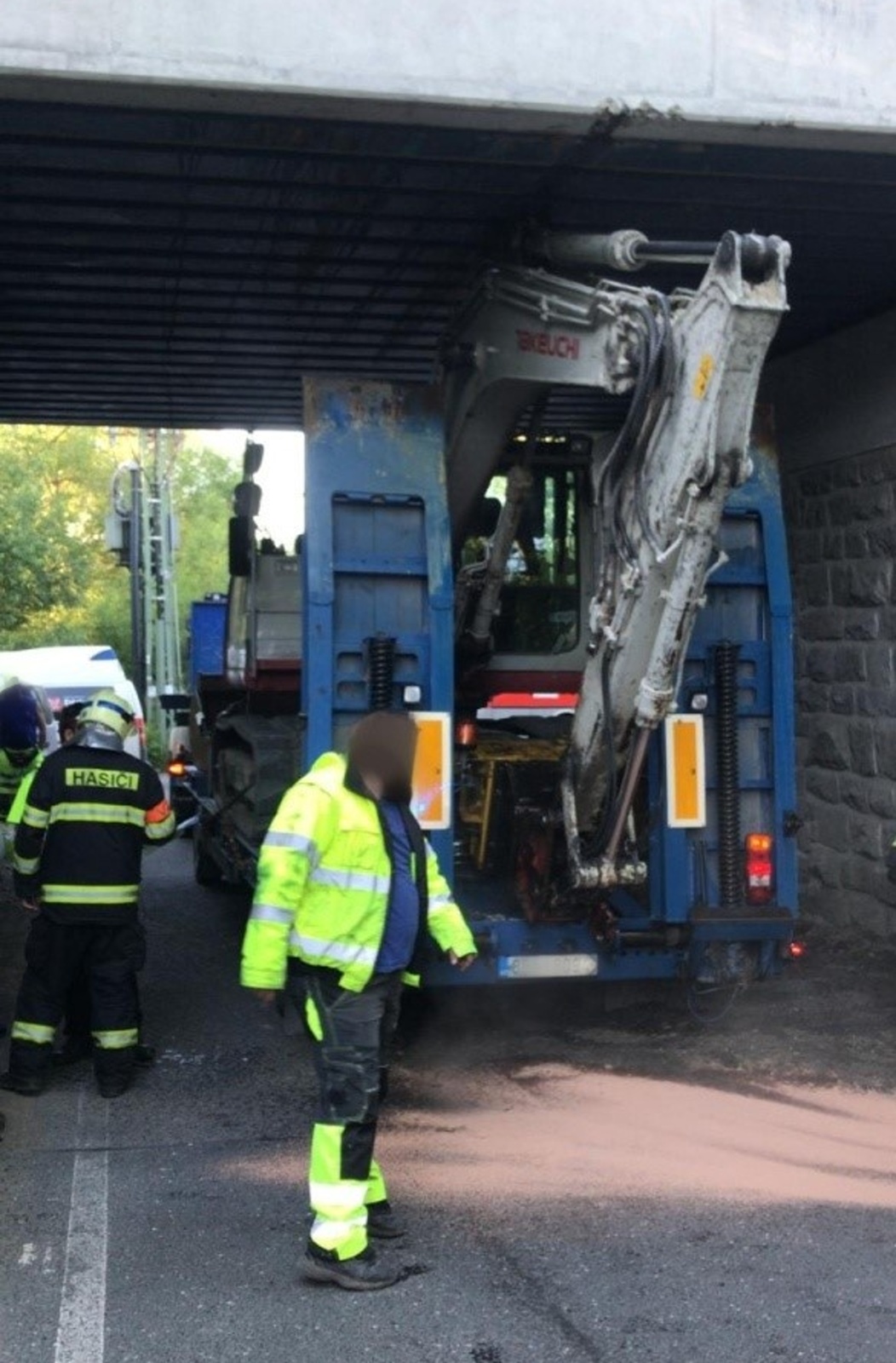 Po příjezdu na místo hasiči zjistili, že pod mostem stojí nákladní souprava s naloženým bagrem, který se při průjezdu zasekl horním ramenem o železniční most. Viadukt byl zcela zablokován a z bagru unikal hydraulický olej.