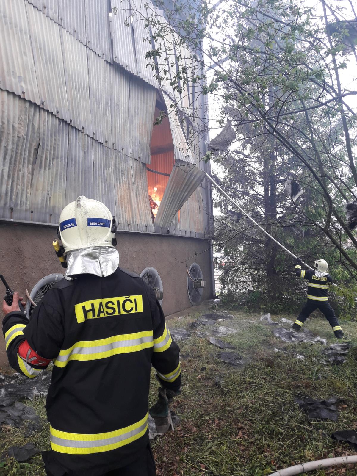 Pomohl také manipulátor, který rozebíral uskladněné seno, aby jej hasiči mohli řádně prolít. Rozbrušovací pilou pak otevřeli vrata i na druhé straně objektu, aby mohli materiál uvnitř seníku vyskladnit na volné prostranství, kde byla snadnější likvidace požáru. Krátce před 18. hodinou byl dokonce vyhlášen druhý stupeň poplachu. Následně byly uvnitř seníku nasazeny další vodní proudy. Vyskladňování sena bylo komplikované, protože se kvůli vysoké vrstvě zasaženého sena nedalo vjet manipulátorem až doprostřed stavby. Hasiči ochlazovali polovinu budovy, aby ji uchránili. Potřebnou hasební vodu čerpali z místní požární nádrže, která byla hned vedle seníku.