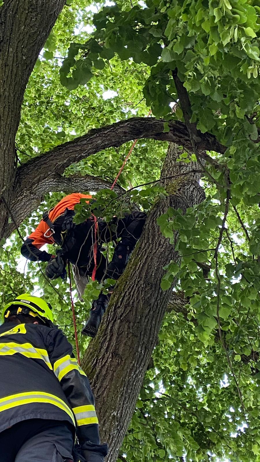 Krajské operační a informační středisko HZS Středočeského kraje vyhlásilo poplach jednotce z hasičské stanice Říčany, která vyjela s cisternou a automobilovou plošinou. Po příjezdu hasičů na místo a rychlém průzkumu bylo upřesněno, že se zvíře nachází v koruně stromu, ke kterému ovšem nejde zajet s výškovou technikou, neboť ji kvůli drátům elektrického vedení nejde ustavit.