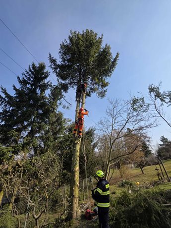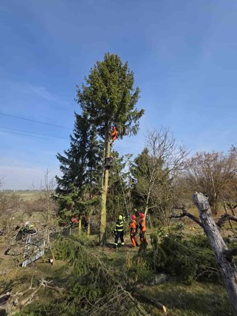 Zásah elektrickým proudem zanechal člověka ve výšce několika metrů na stromě. Na místo vyrazily specializované jednotky hasičů, které musely zraněného bezpečně dostat dolů a předat do péče záchranářů.