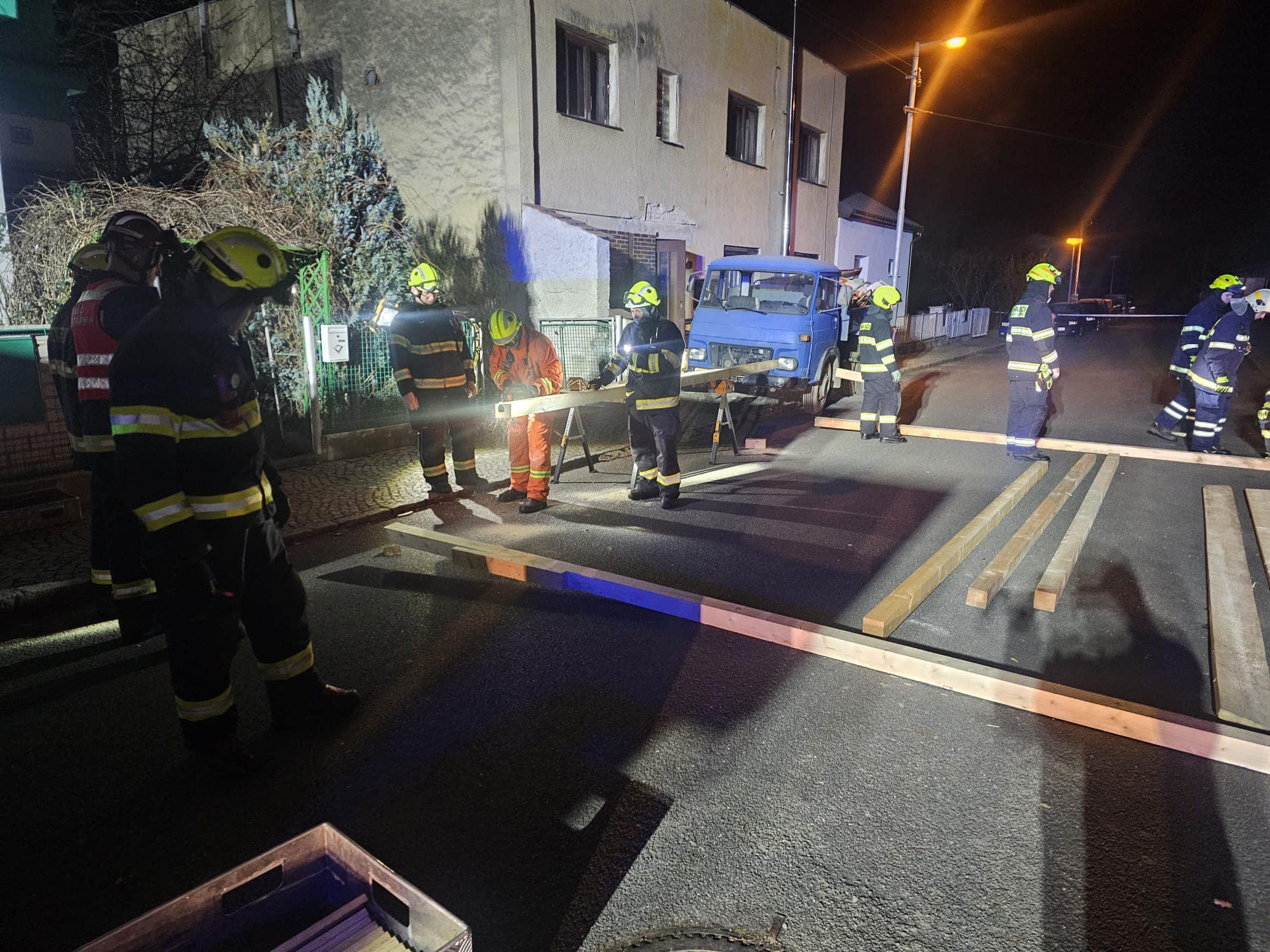 Aby nedošlo k dalšímu kolapsu, museli hasiči zpevnit zbylou část objektu. K tomu využili dřevěné trámy z kontejneru určeného pro pažení budov.