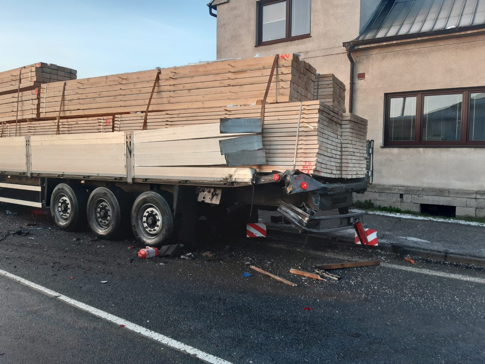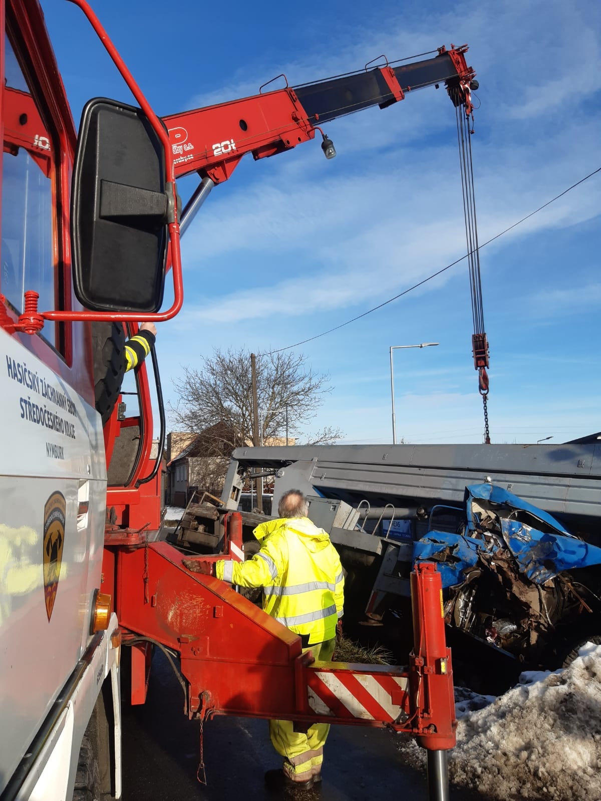 Mnohem náročnější odstraňování následků dopravní nehody musela řešit profesionální jednotka ze stanice Nymburk. Krátce před osmou hodinou došlo před kruhovým objezdem na výjezdu z města směrem do Mladé Boleslavi k dopravní nehodě dvou nákladních automobilů, kdy navíc jedno z vozidel narazilo do rozvodné skříně u plotu přilehlé stavební firmy. Ačkoliv kabina automobilové plošiny, která byla účastníkem dopravní nehody, byla po střetu značně poškozená, obešla se událost bez zranění.