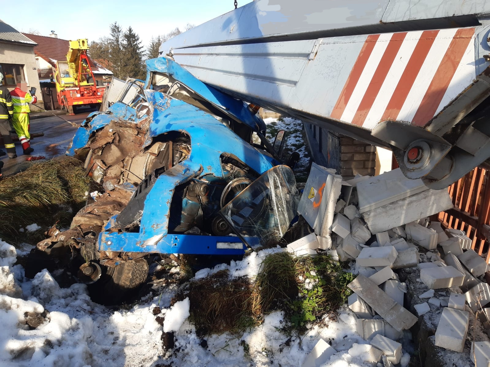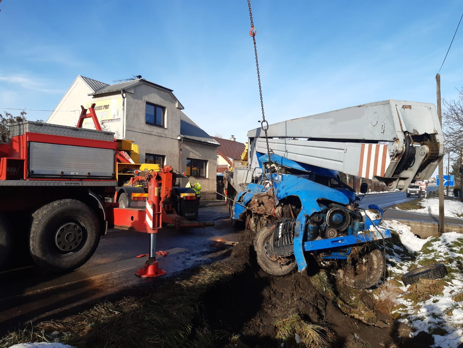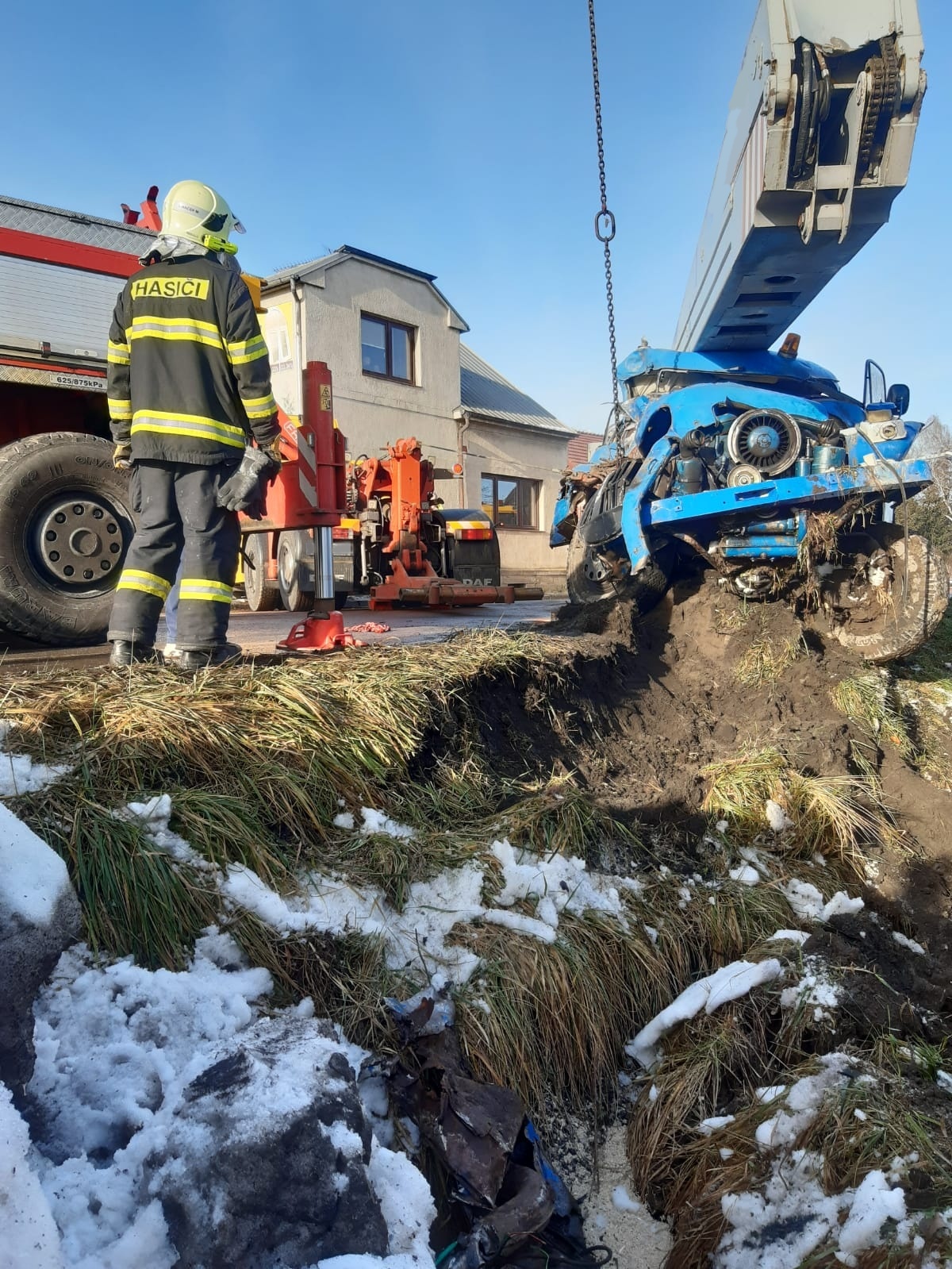 Hasiči po příjezdu na místo zasypali uniklé provozní kapaliny a na obou vozidlech provedli protipožární opatření. K vytažení těžké plošiny zpět na vozovku bylo zapotřebí tří vyprošťovacích automobilů. Jednotce proto přijela na pomoc s vyproštěním specializovaná firma.