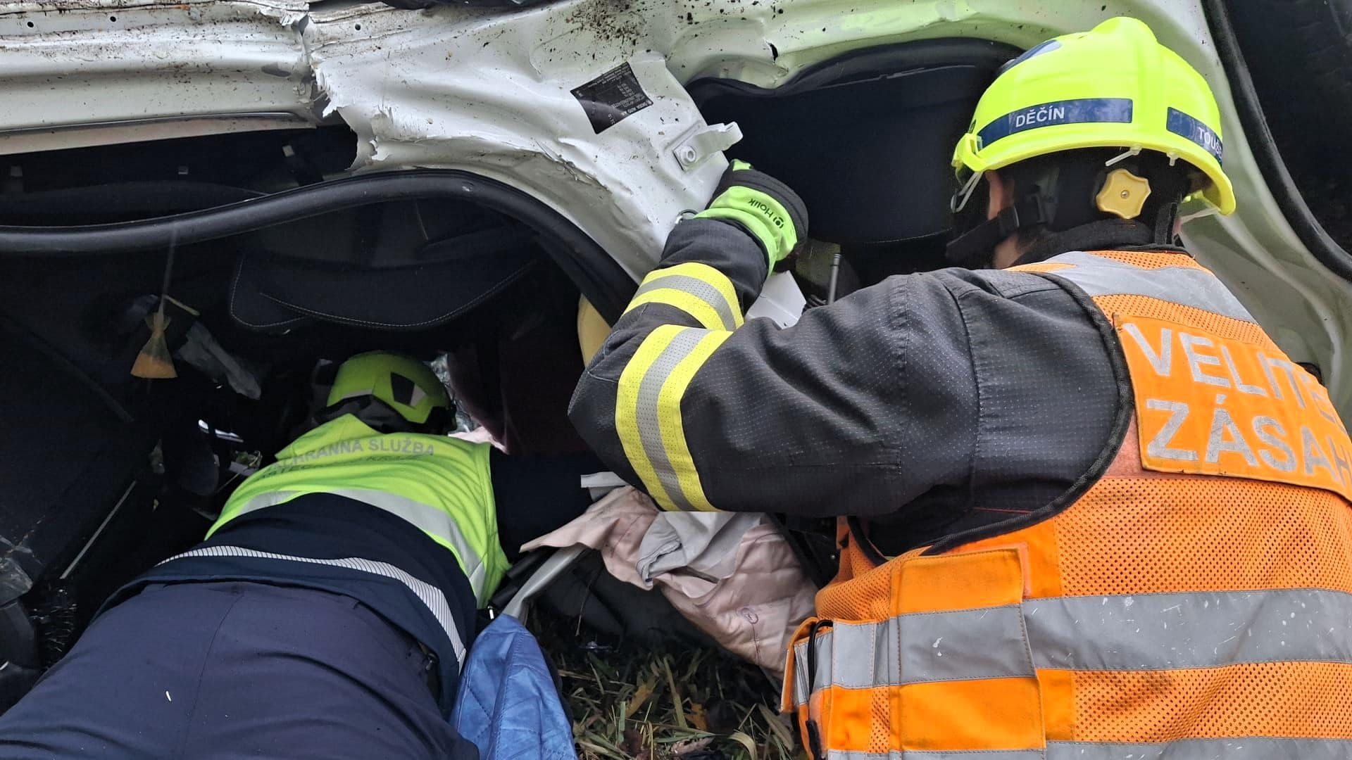 Po příjezdu na místo zjistili hasiči, že osobní automobil leží převrácený na střeše. Uvnitř zůstal zaklíněný řidič, kterého museli z havarovaného vozidla opatrně vyprostit pomocí hydraulického nářadí. Po vyproštění byl zraněný předán do péče Zdravotnické záchranné služby Ústeckého kraje.