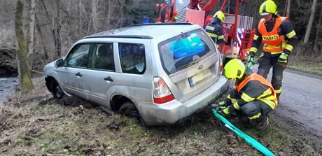 Auto skončilo v potoce. Hasiči zasahovali u nehody bez zranění