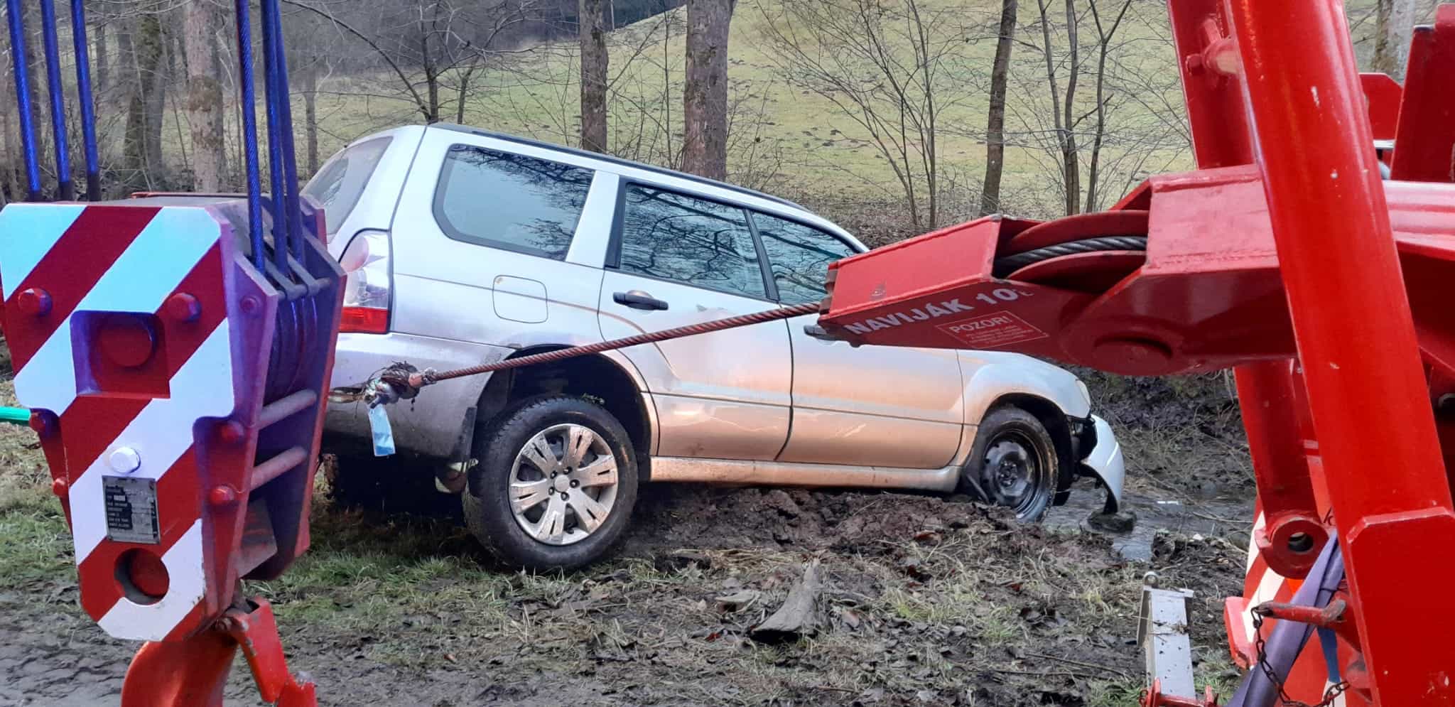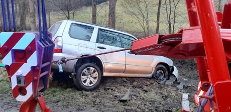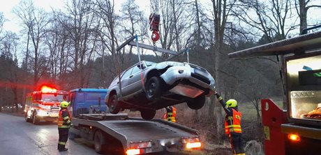 Havarovaný osobní automobil skončil v potoce u silnice třetí třídy. Profesionální hasiči jej v odpoledních hodinách bezpečně vyprostili a zajistili místo proti úniku provozních kapalin. Událost se obešla bez zranění.