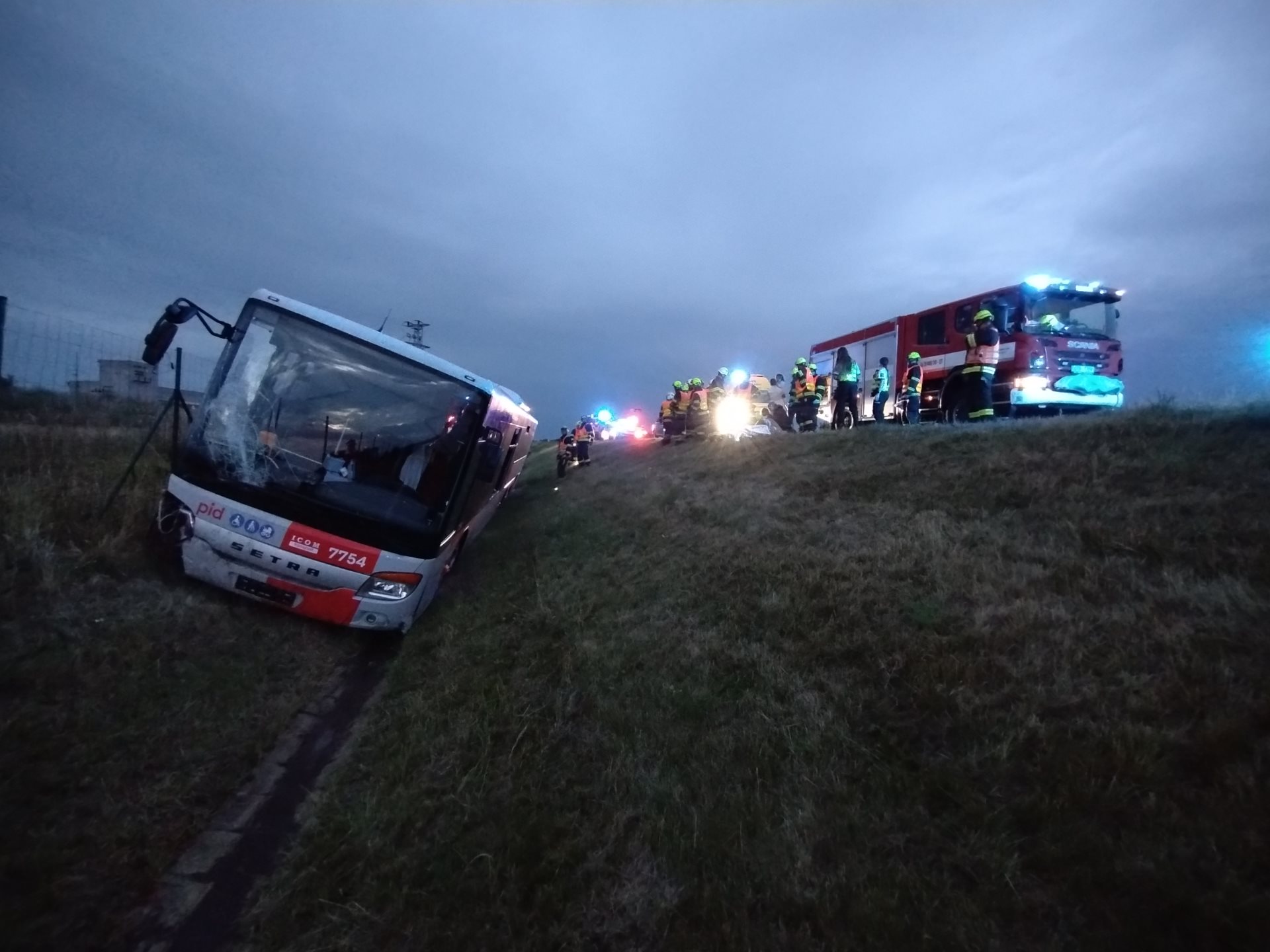 Večerní dopravní nehoda autobusu na dálnici D7 u Nezabylic skončila zásahem hasičů a záchranářů. Zraněny byly tři osoby, dětem pomohli i plyšoví sloni Hugo.