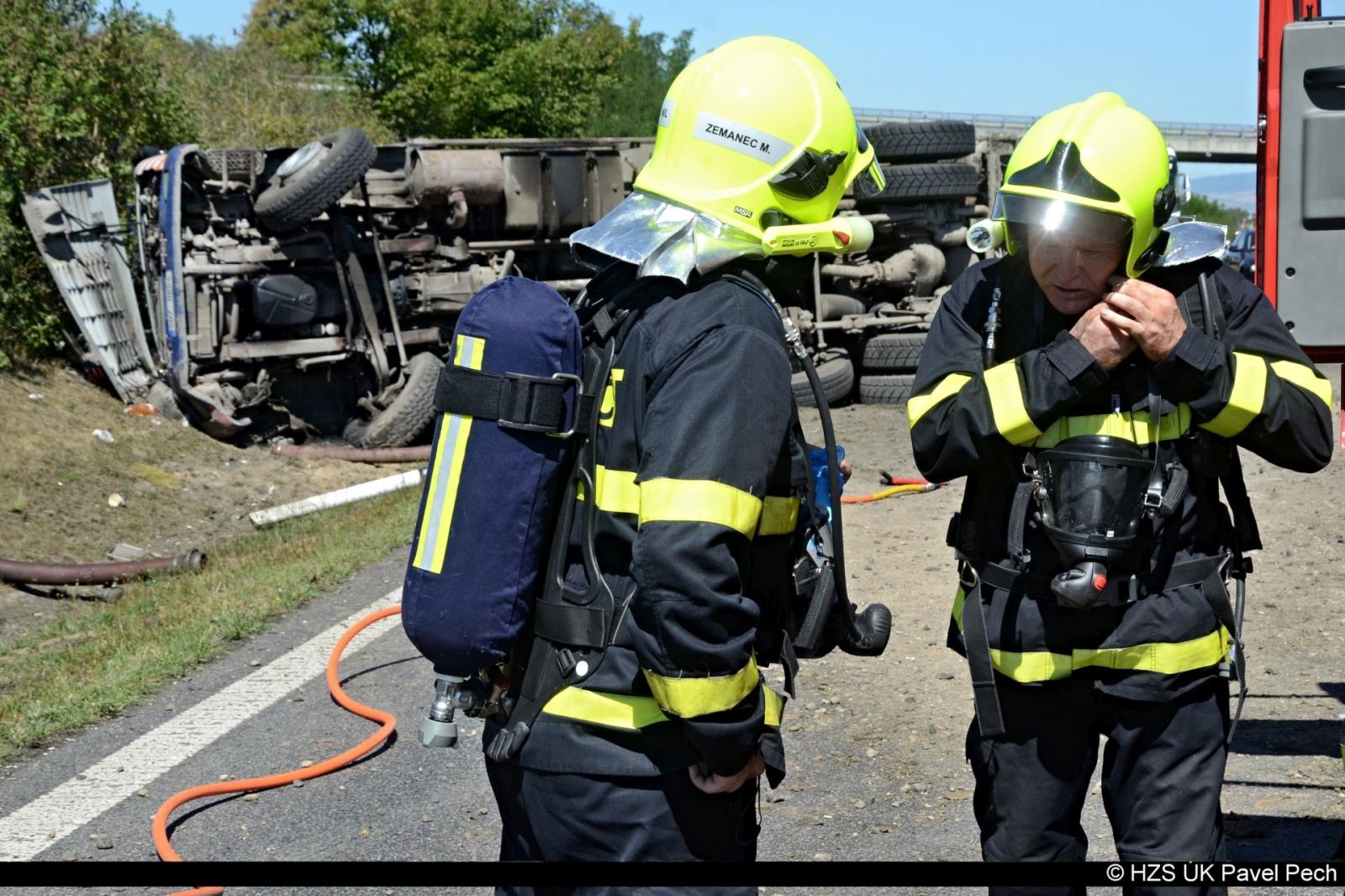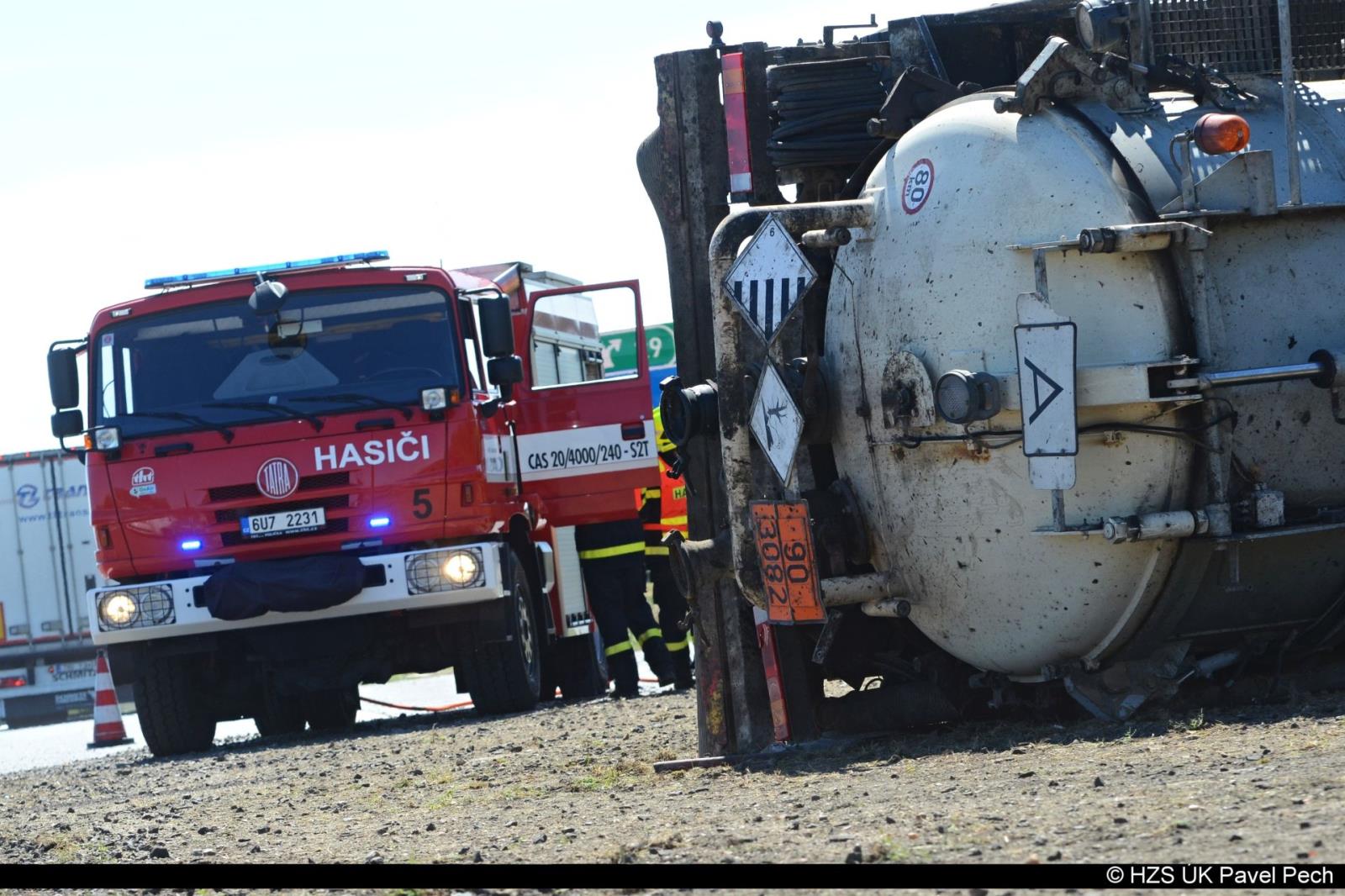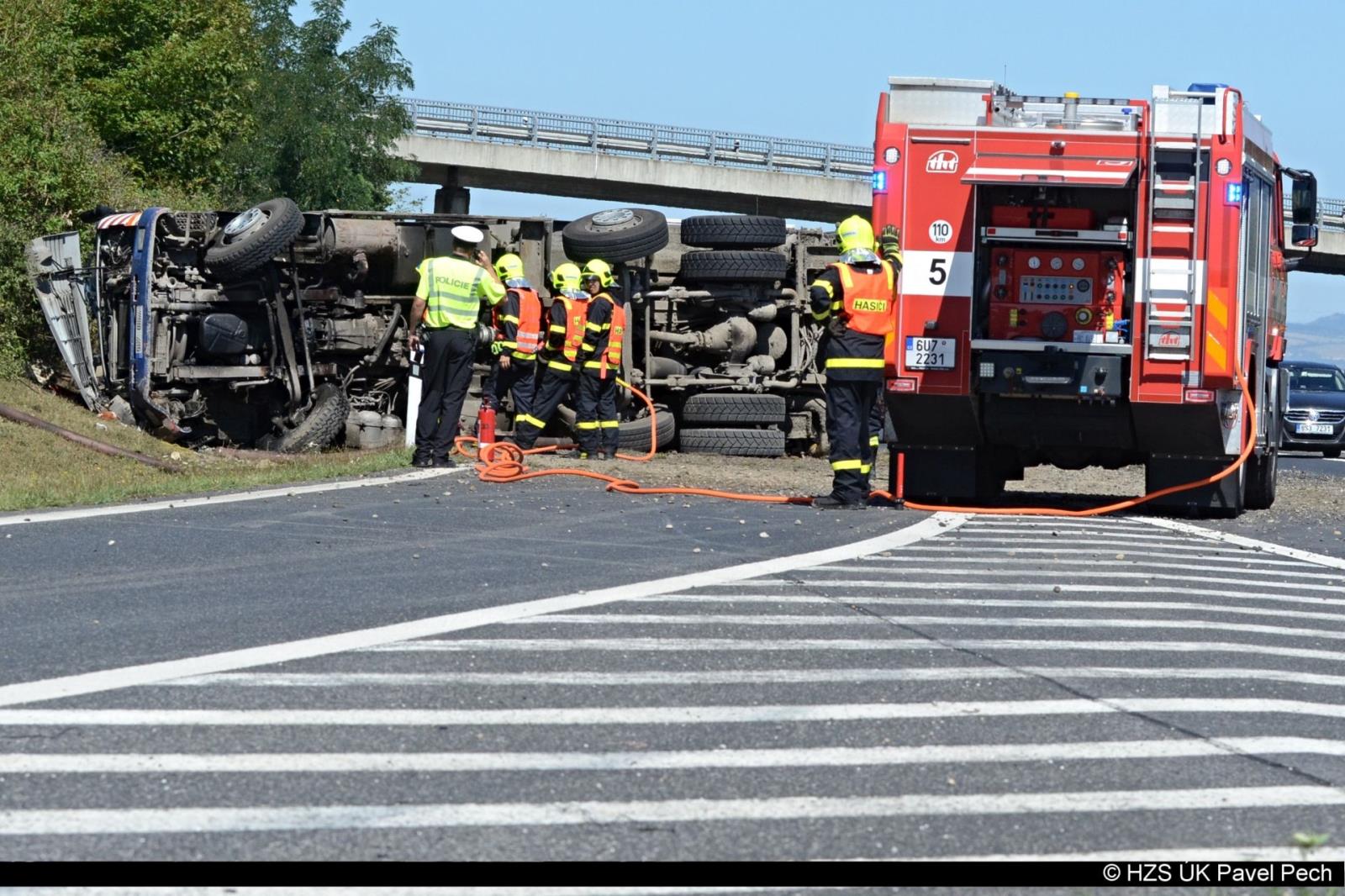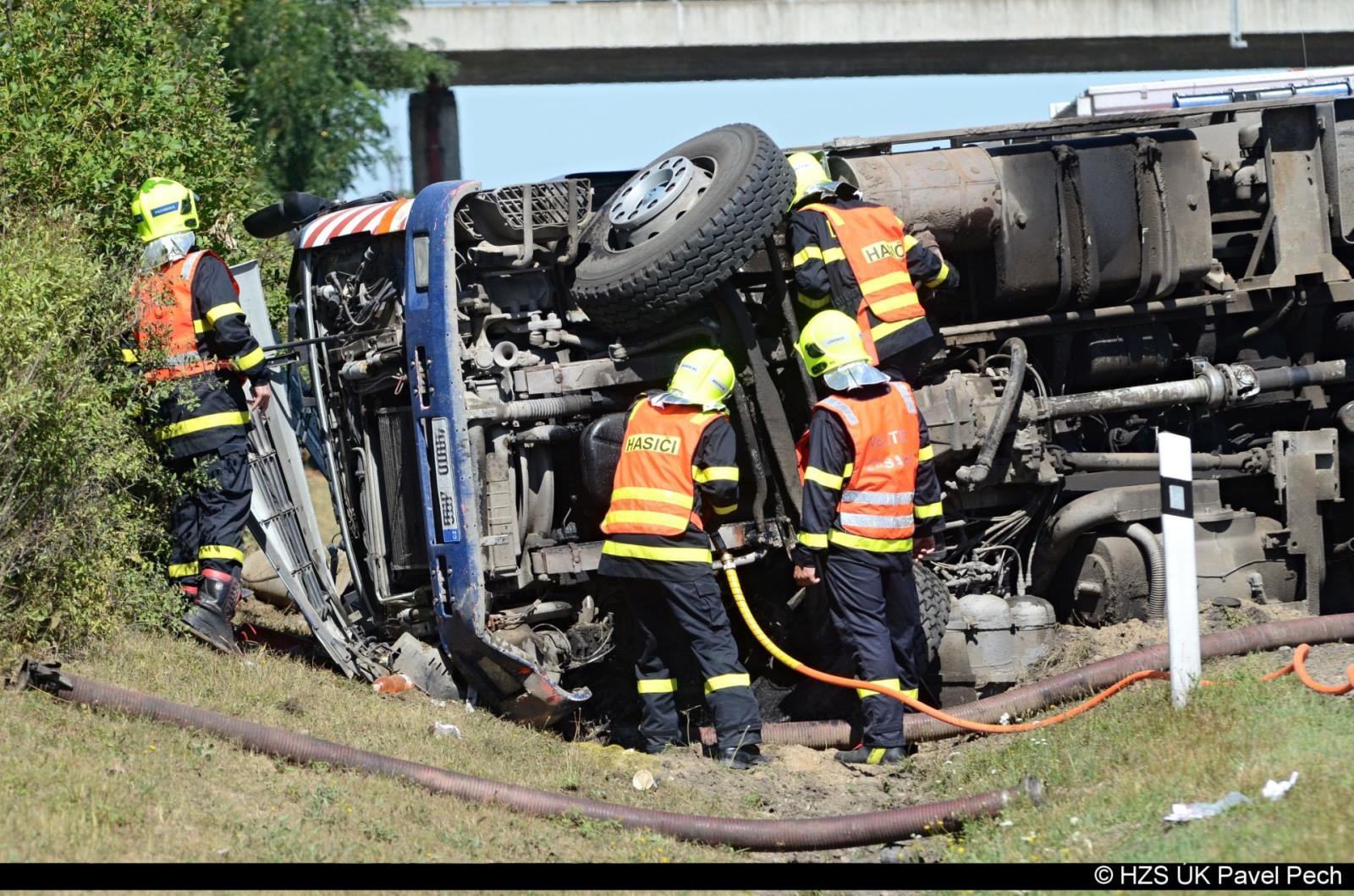 Cisterna se převrátila na bok v odstavném pruhu. Řidič byl zraněn. Z cisterny převážená látka - směs pryskyřice s vodou – odpadní látka určená k likvidaci nevytekla.