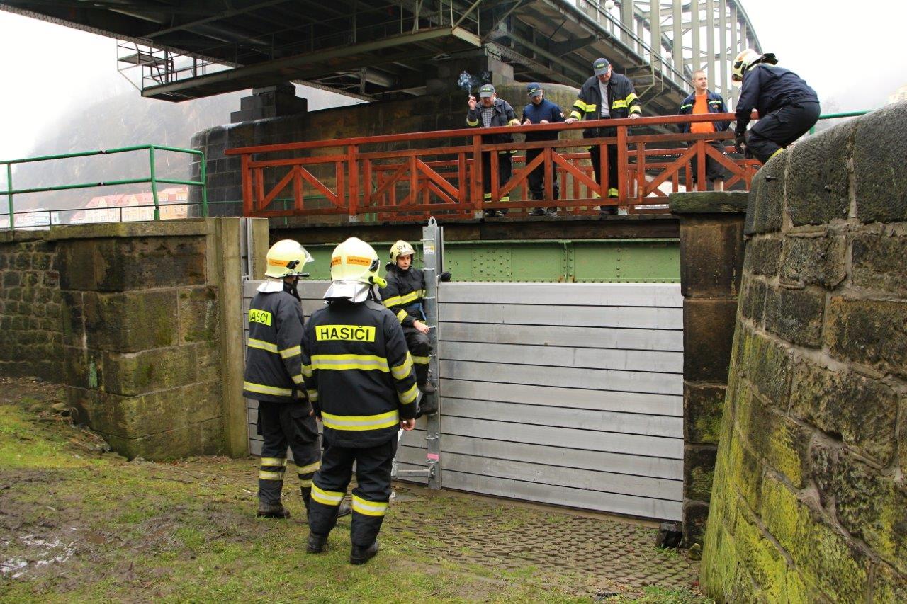 Tající sníh a dešťové srážky způsobily, že v posledních hodinách došlo v Děčíně k vzestupu hladiny řeky Labe. Jedním z míst, kde se voda v minulosti pravidelně vylila mimo koryto řeky, je pod Tyršovým mostem u Parolodě. Právě zde rozhodlo vedení Povodí Labe o stavbě protipovodňové stěny, která ochrání přilehlé objekty. Děčínští dobrovolní hasiči v těchto místech během několika minut postavili přenosnou stěnu, která při dalším případném vzestupu hladiny zadrží vodu v korytě řeky. Situace na vodních tocích je monitorována.