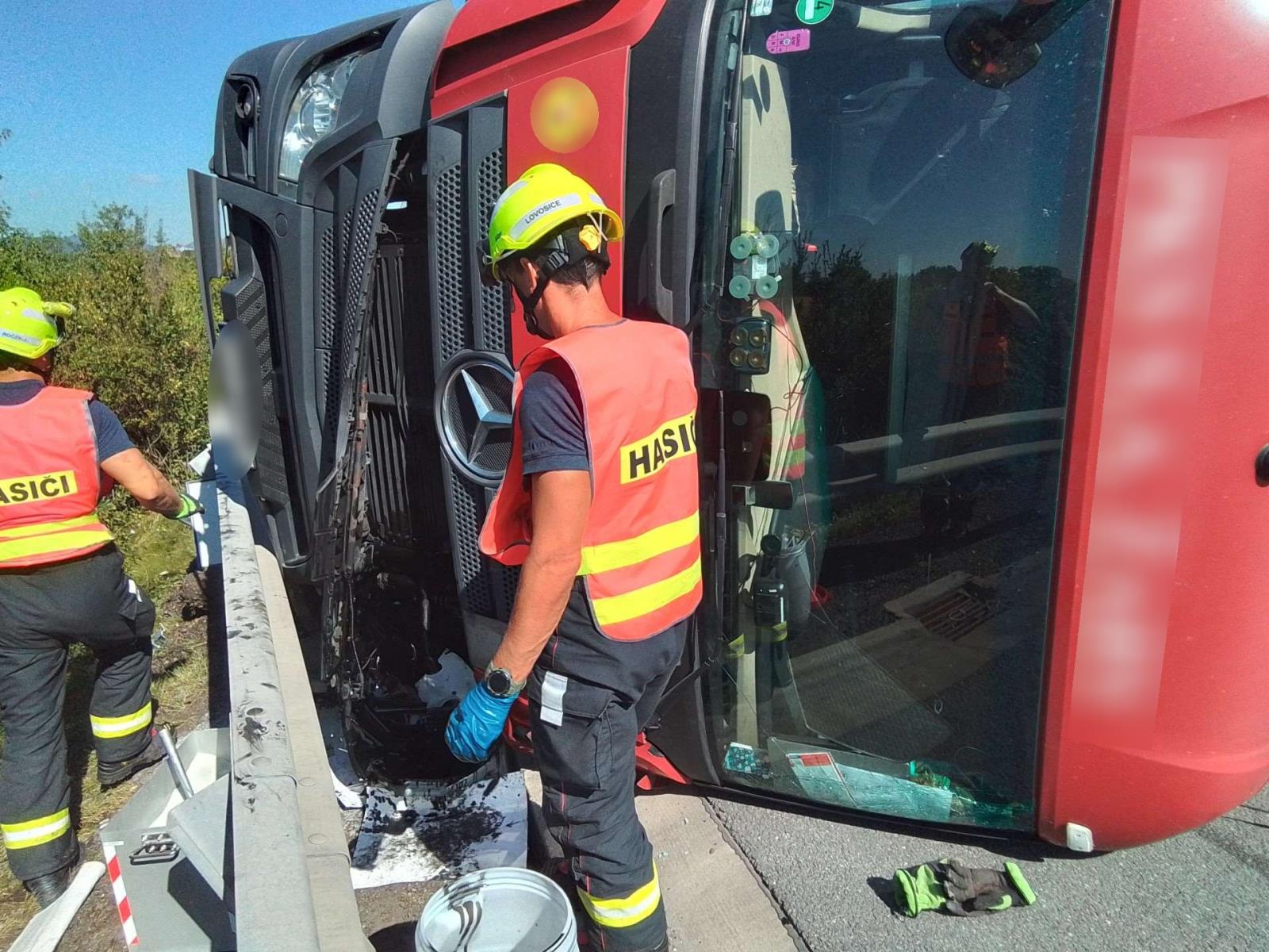 Hasiči po nasazení krčního límce vytáhli zraněného řidiče z kabiny tahače a předali jej do péče Zdravotnické záchranné službě. Dále zachycovali unikající motorový olej a komunikaci zasypali sorbentem.