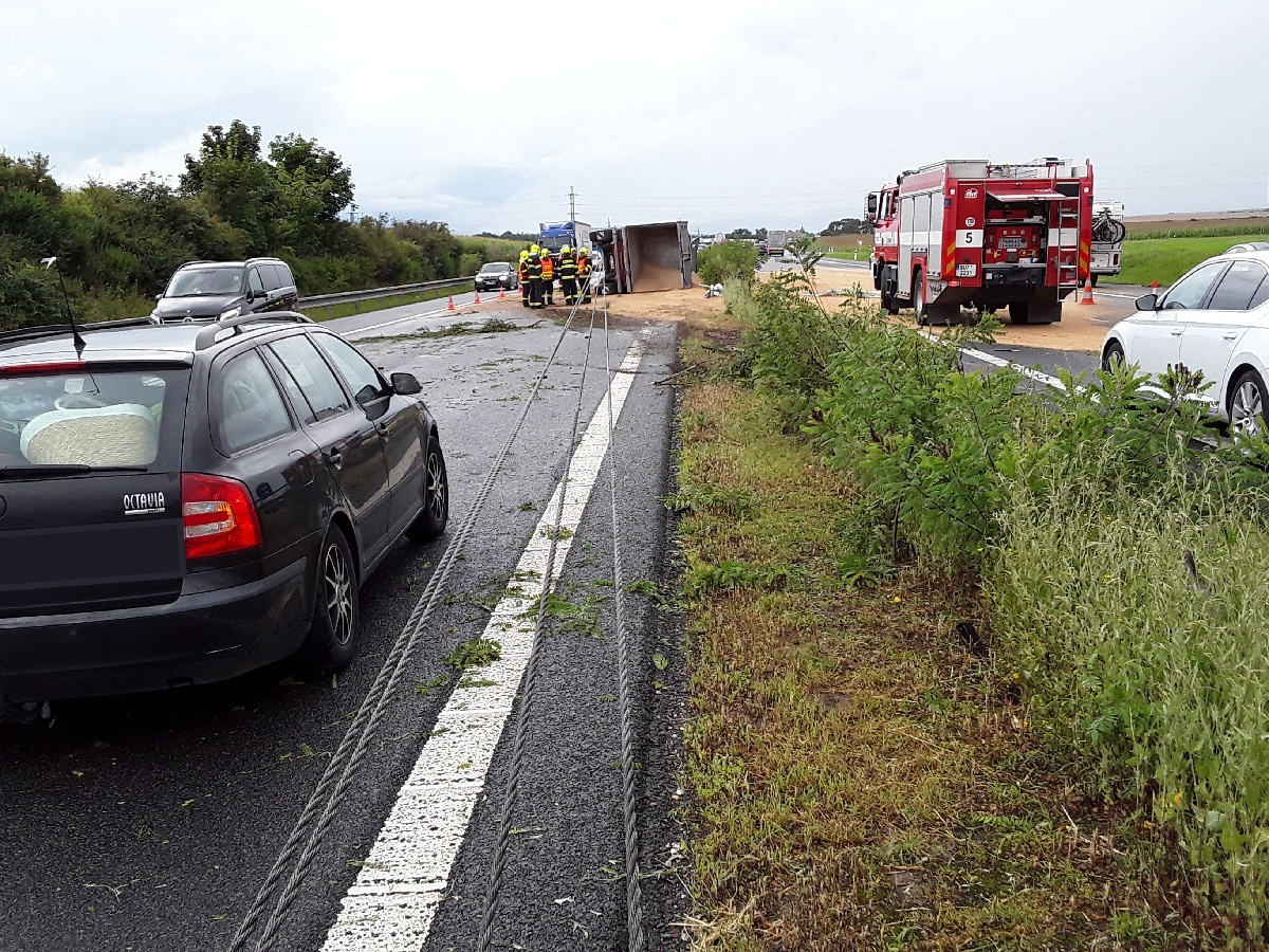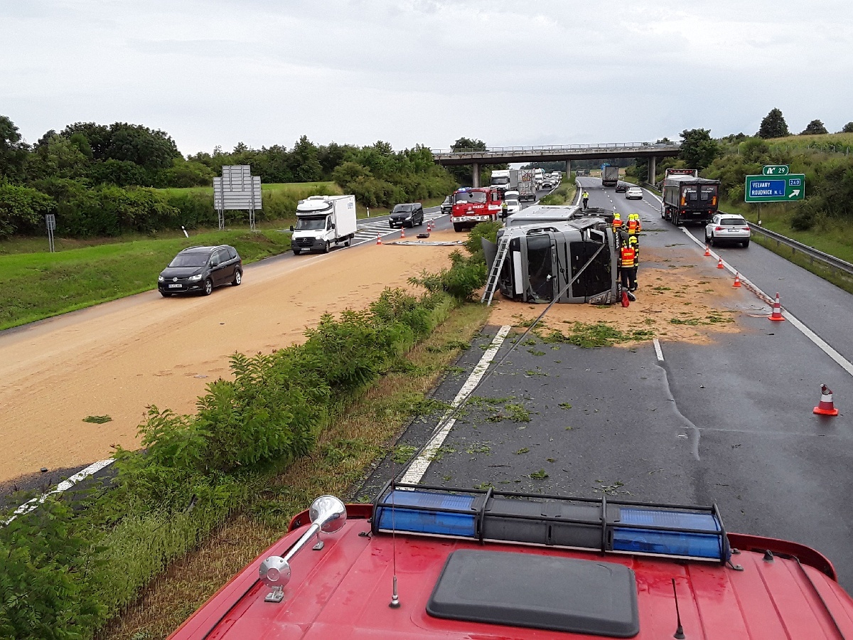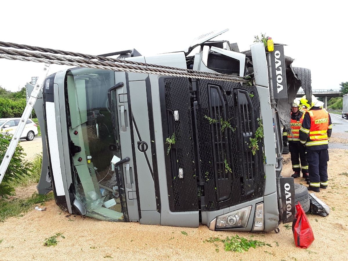 Hasiči likvidovali únik nafty a oleje z převráceného kamionu
