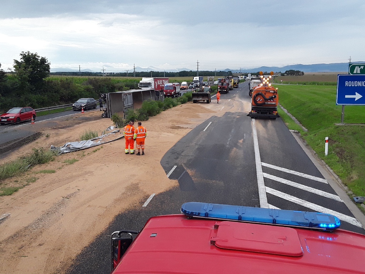 5. 8. 2021 v 16:35 hodin. Hasiči ze stanic Litoměřice, Lovosice a Roudnice nad Labem zasahovali u dopravní nehody převráceného kamionu na 30,5 km dálnice D8 u exitu č. 29 u Roudnice nad Labem. Zdravotnická záchranná služba ošetřila zraněného řidiče. Hasiči likvidovali únik nafty a hydraulického oleje  na povrchu dálnice a přečerpávali naftu z tahače do sběrných nádob. Po vyproštění a odtahu kamionu hasiči provedli oplach vozovky.