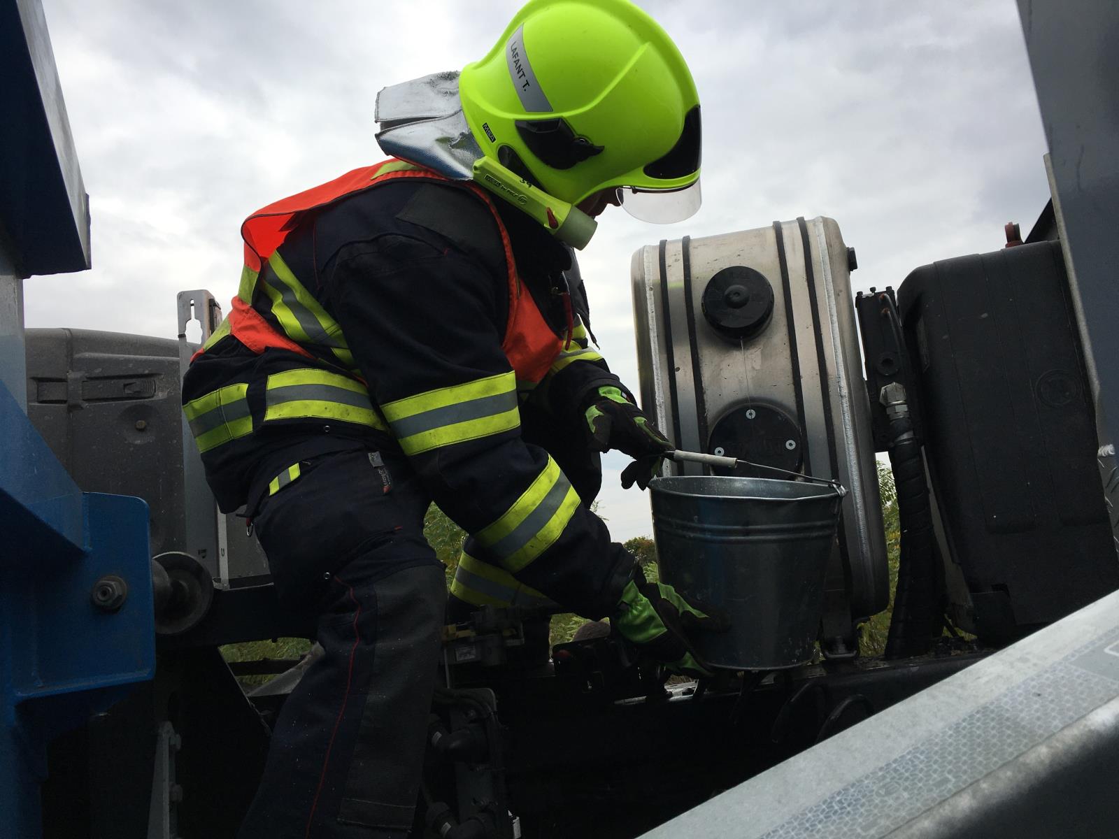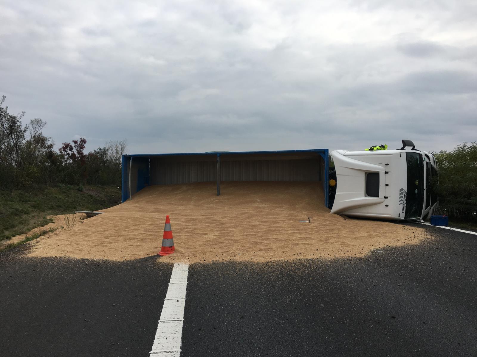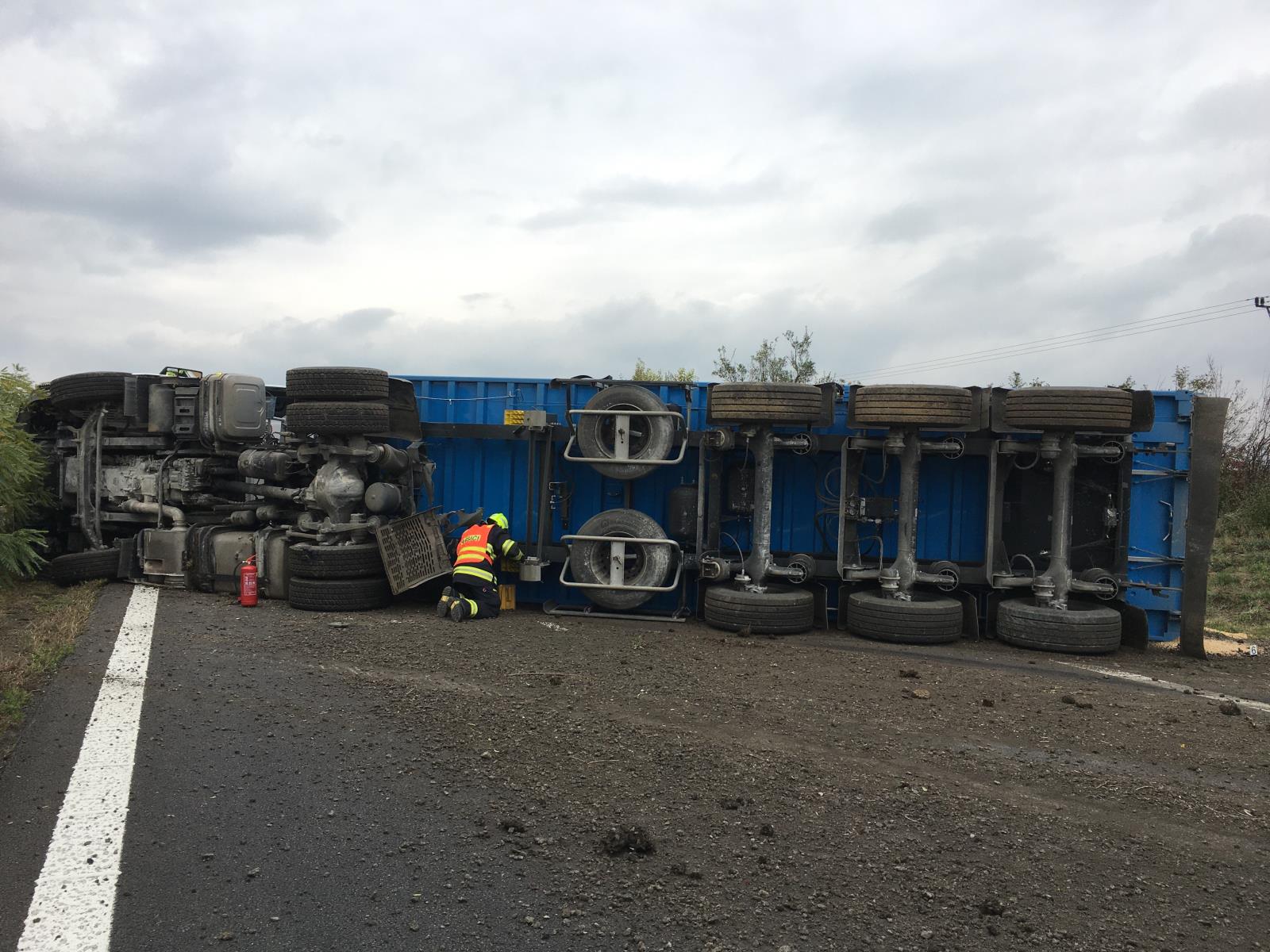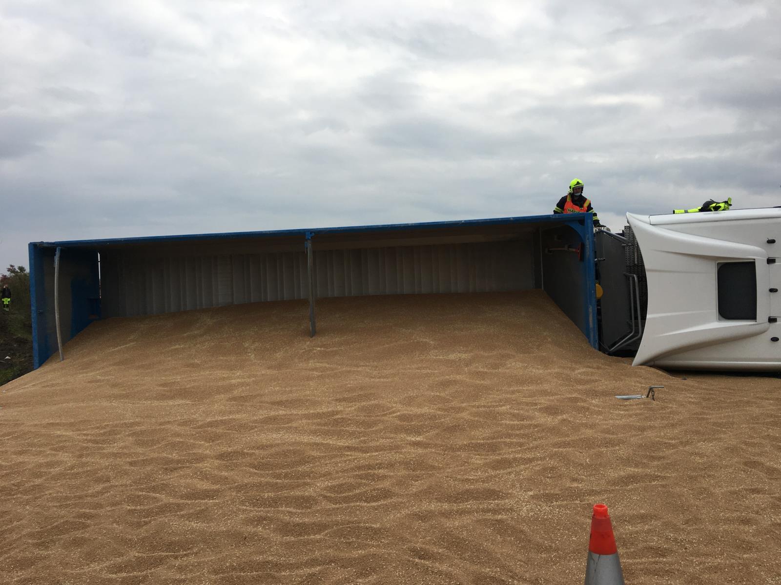 Z převráceného kamionu se vysypalo obilí a zablokovalo dálnici ve směru do Německa.