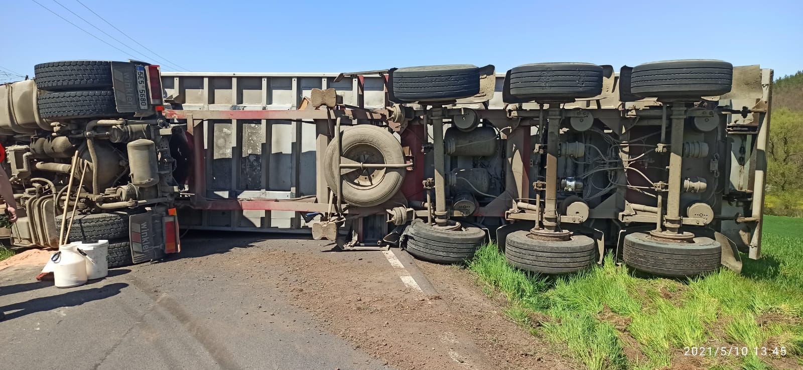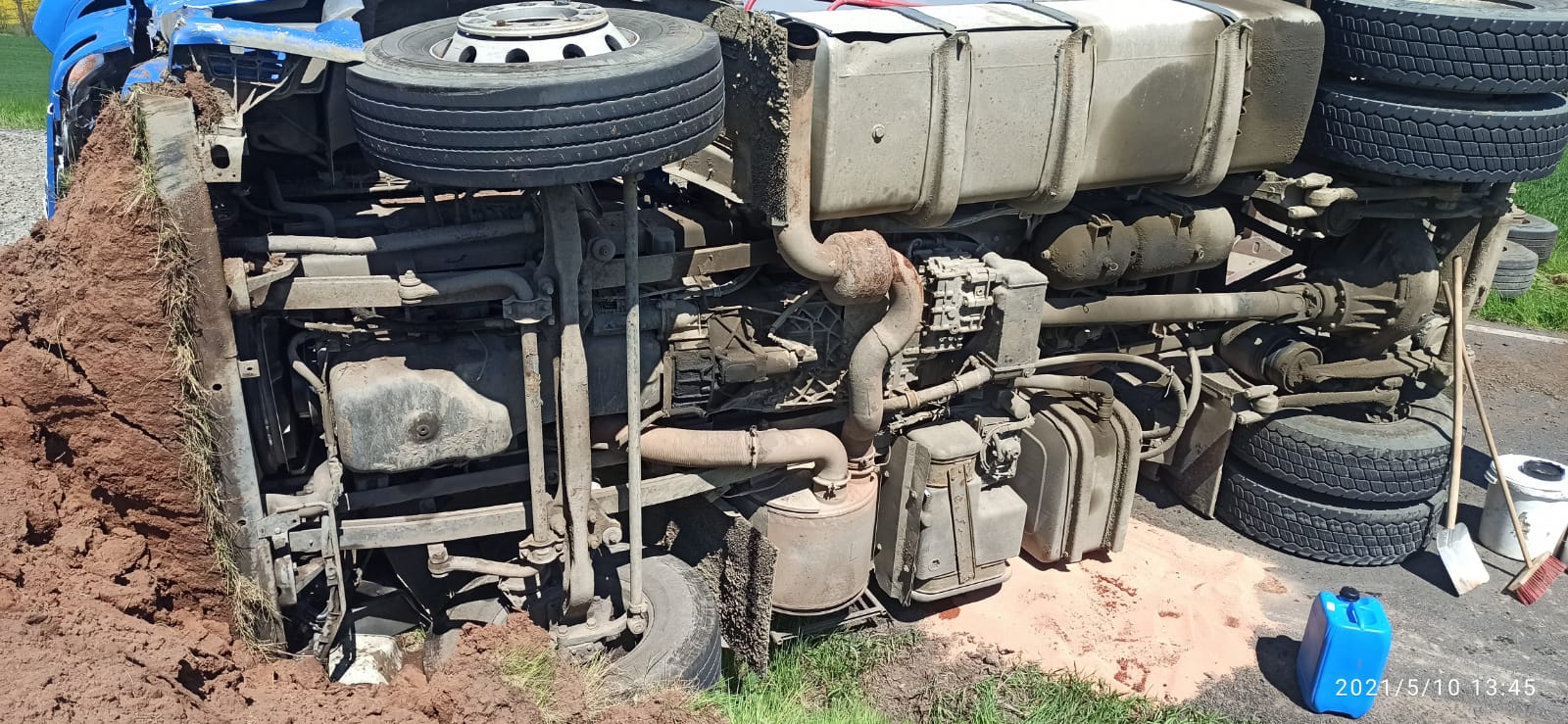 10.5. 2021 12:58 Dvě jednotky vyjely k dopravní nehodě nákladního auta u obce Kryry, okres Louny. Kamion se štěrkem se převrátil na bok na vozovku. Silnice byla neprůjezdná. Hasiči likvidovali vytékající provozní kapaliny.